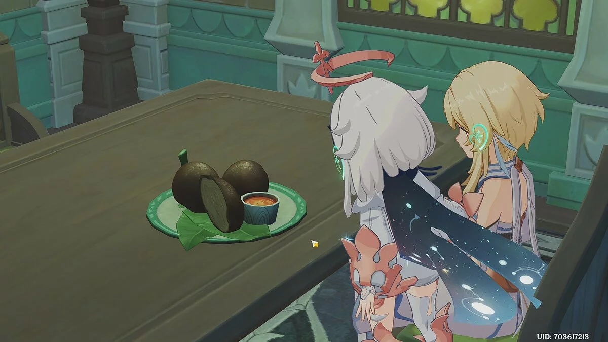 Проследуйте за ней и посетите несколько ларьков. У третьего ларька вы познакомитесь с Вихаром. Он предложит выбрать одну из пяти коробок. В каждой из них находятся сладости с разными вкусами. Паймон попросит отыскать конфеты со вкусом закатника.