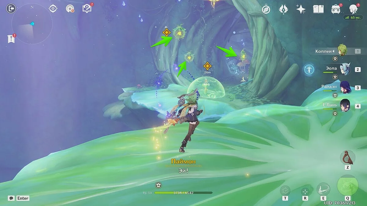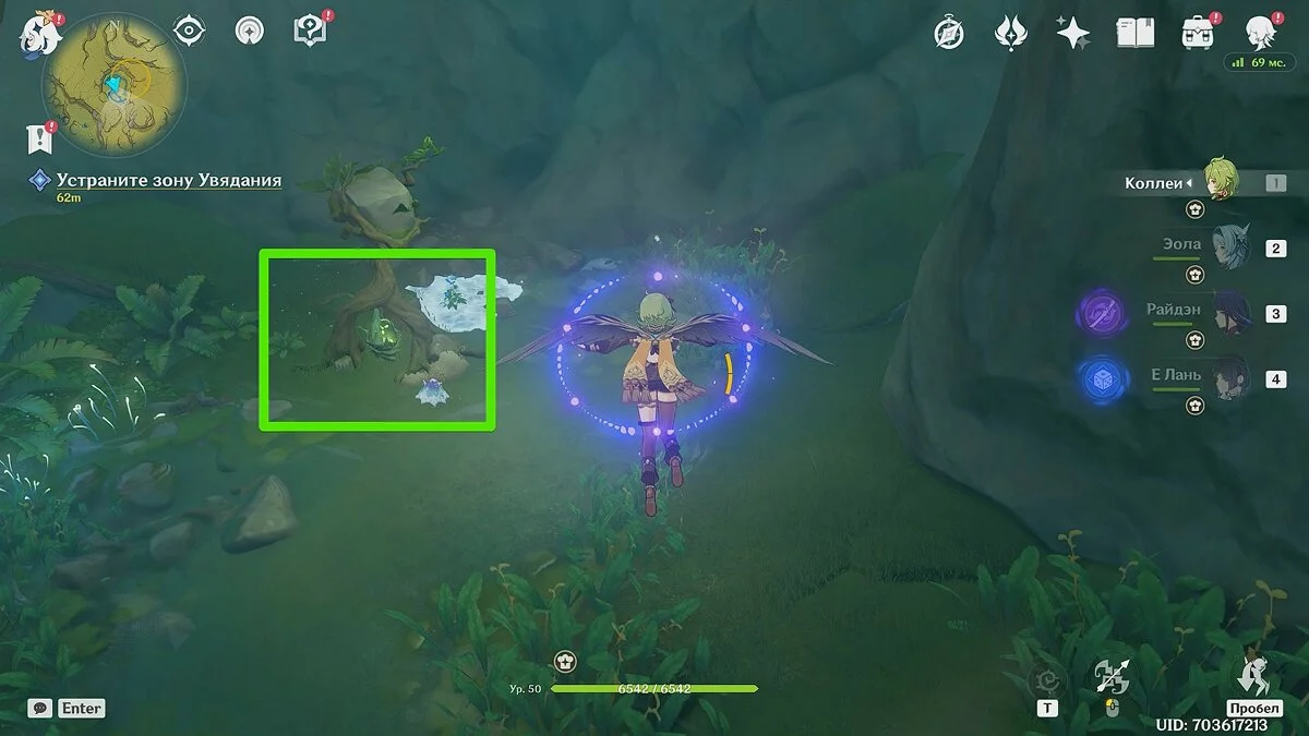 Подпрыгиваем на нём, затем используем стихию Дендро на бутоне и создаём четырёхлистный символ. Но сперва забираем второй янтарь и осматриваем драгоценный сундук после победы над монстрами.