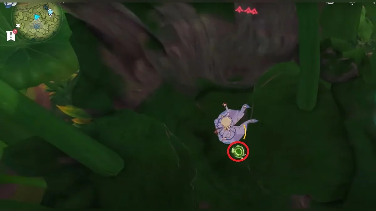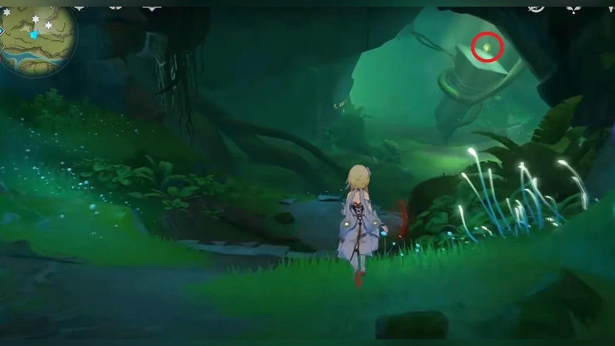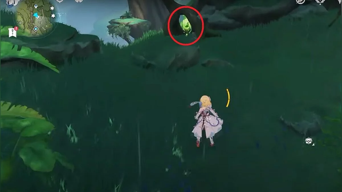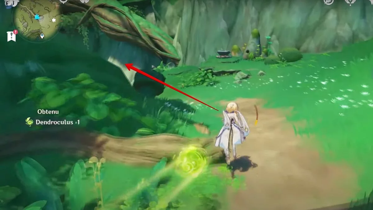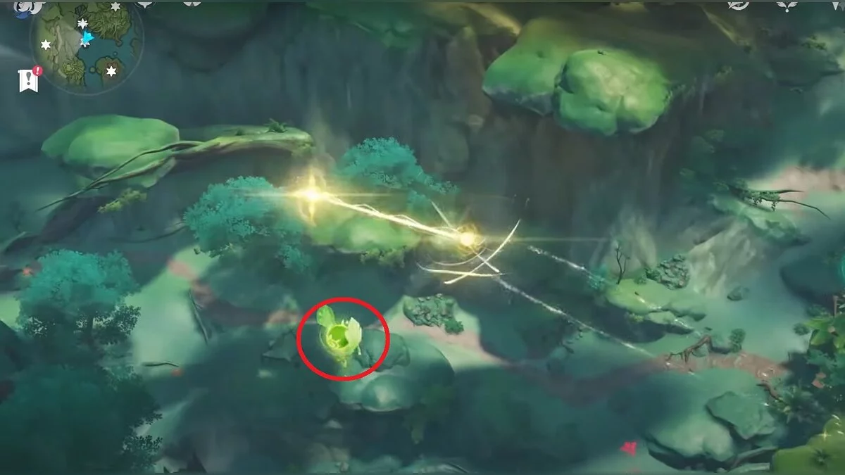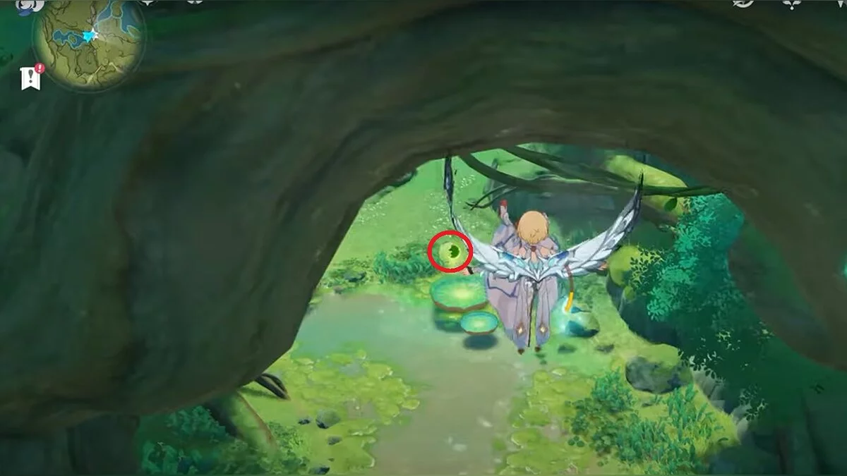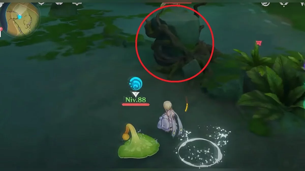 Бегите на северо-запад, пока не увидите камень, который обвязан лианами. Ударьте его дендро-стихией и заберите дендрокул.