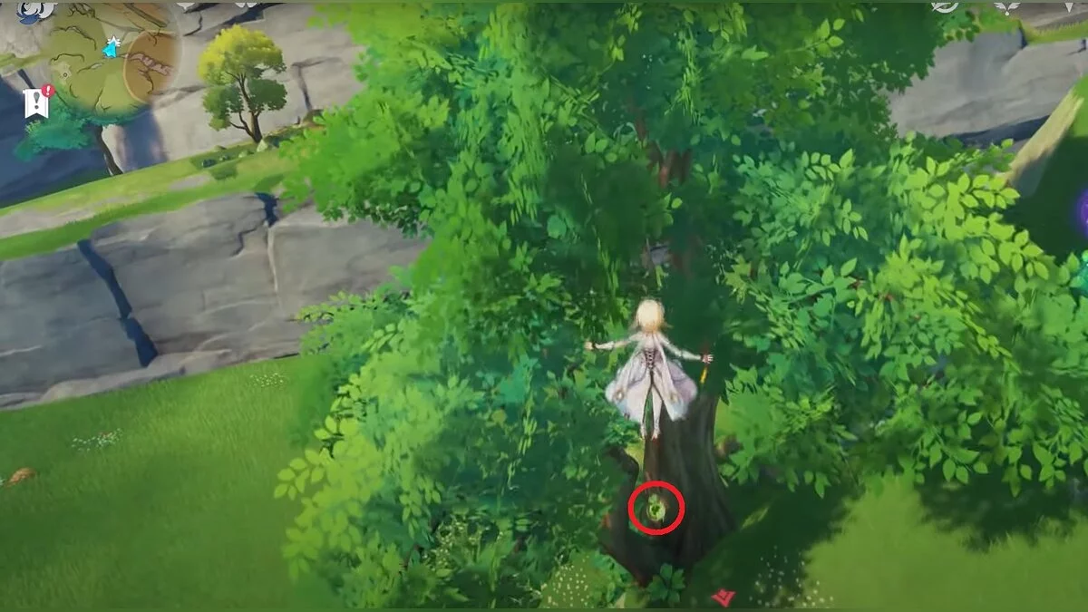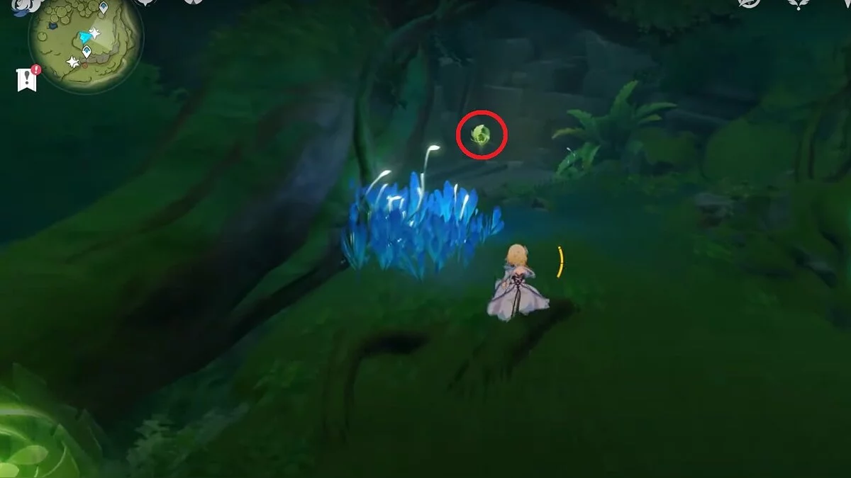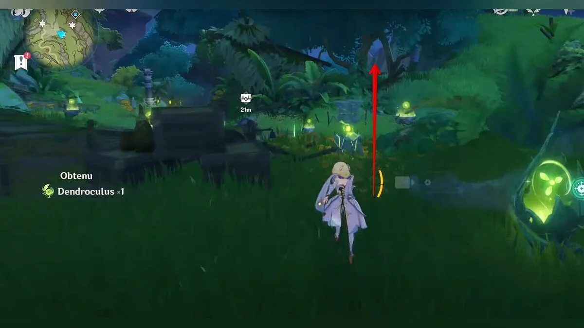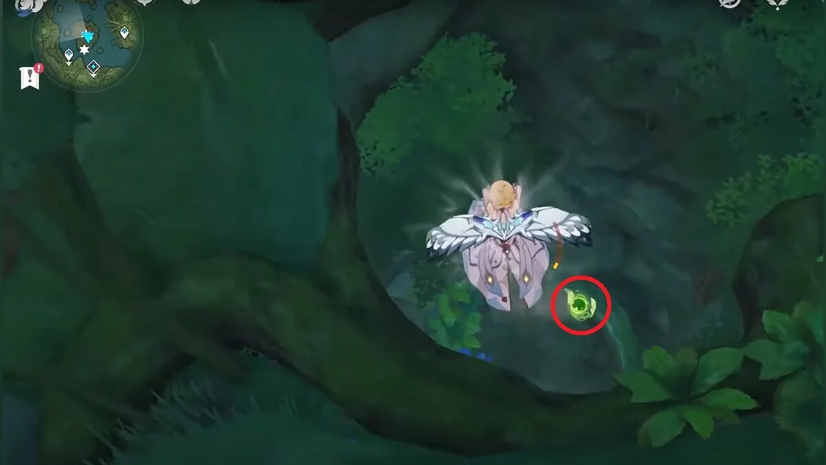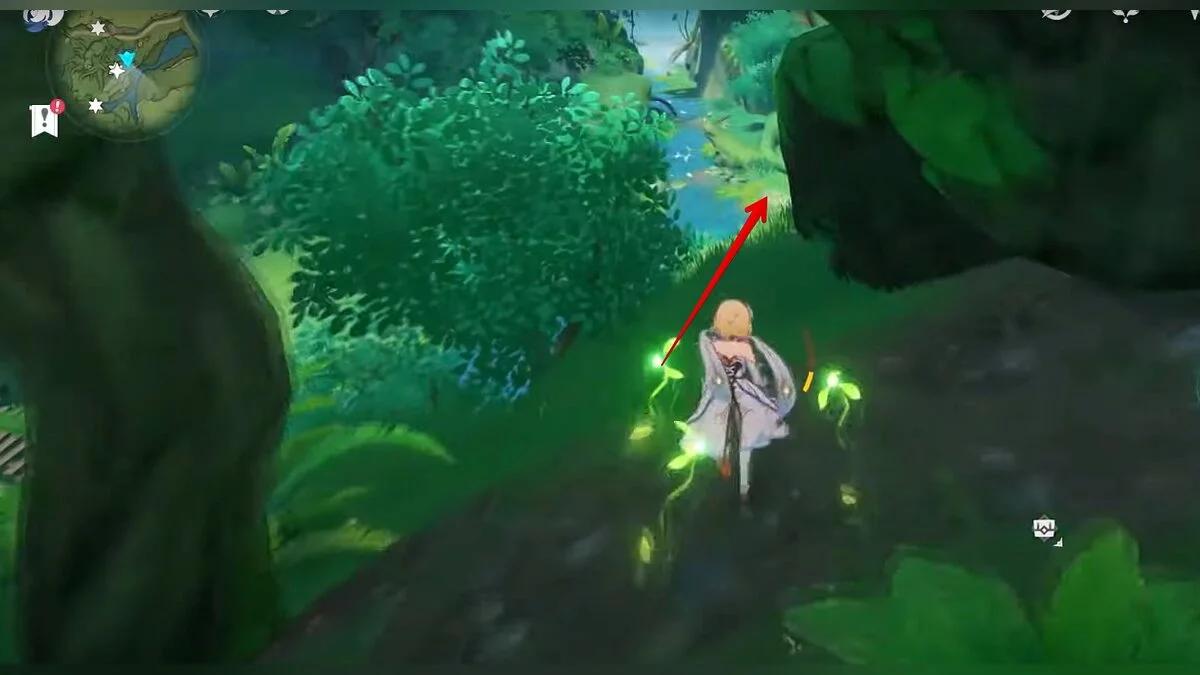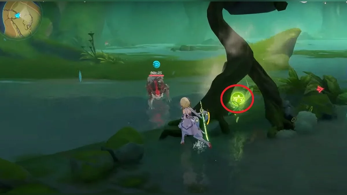 Бегите на северо-запад, пока не увидите камень, который обвязан лианами. Ударьте его дендро-стихией и заберите дендрокул.