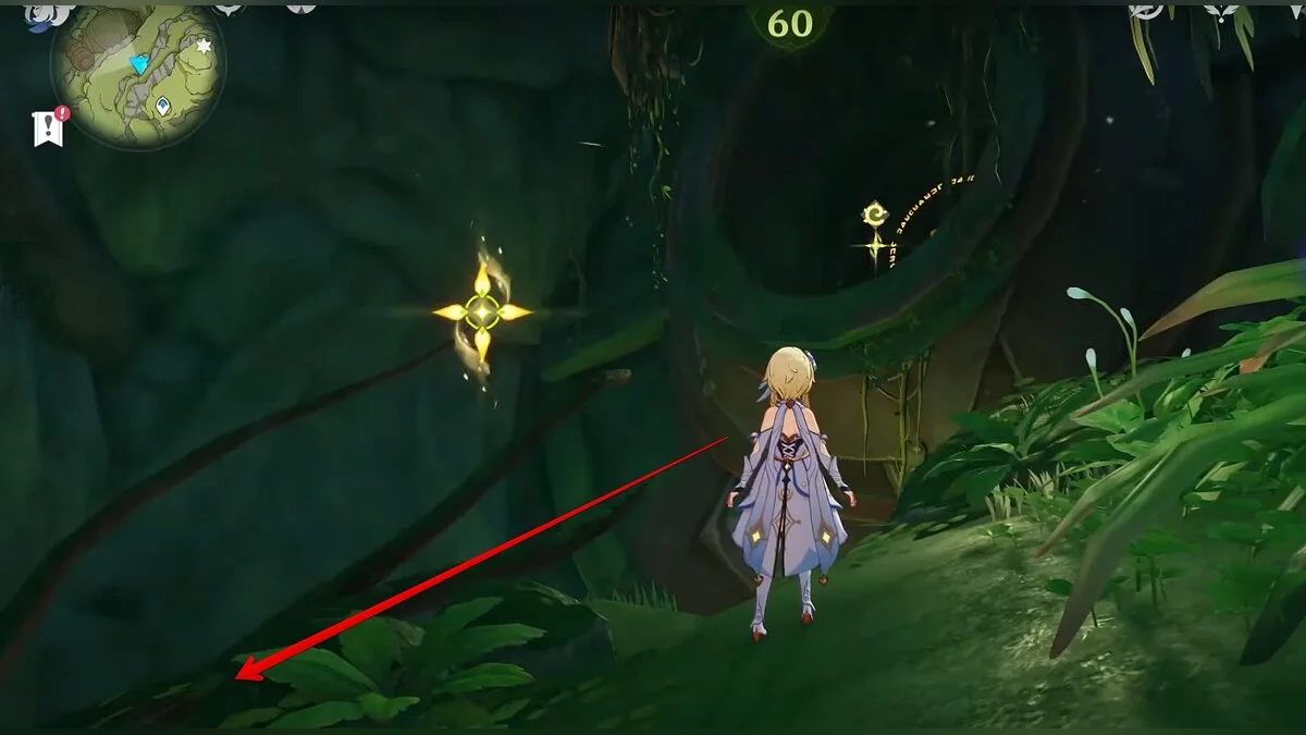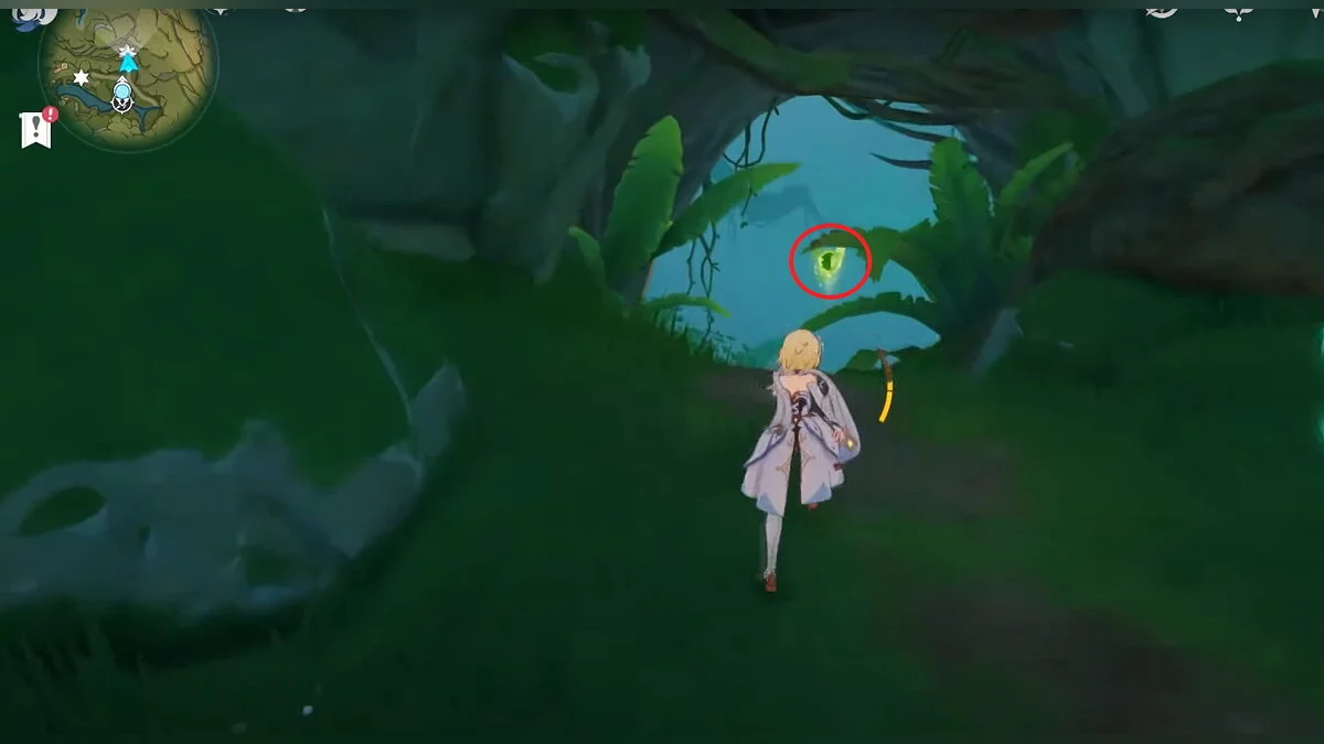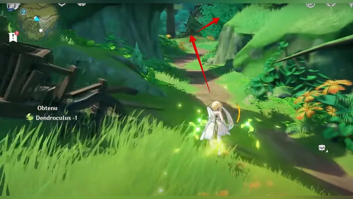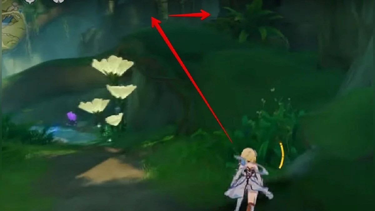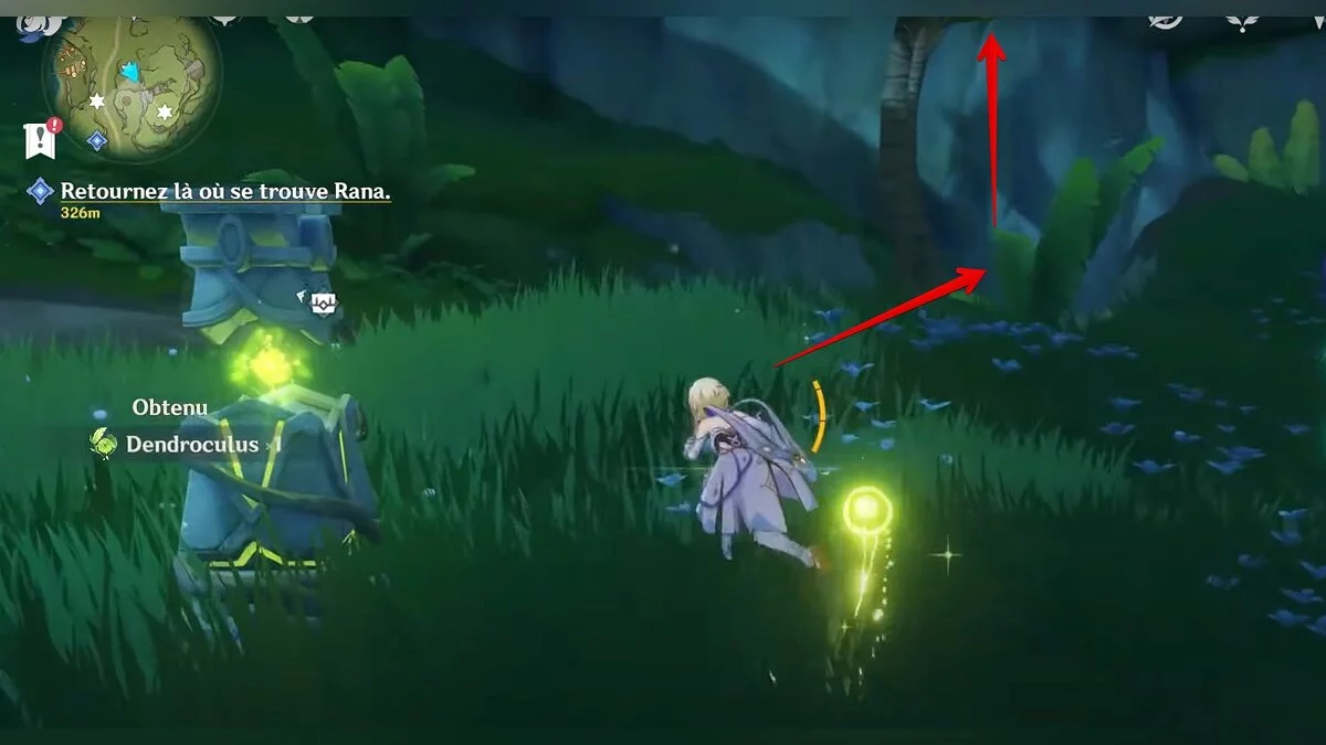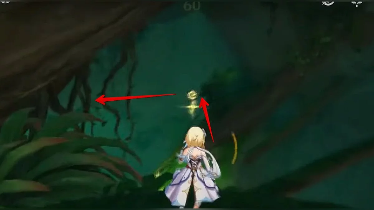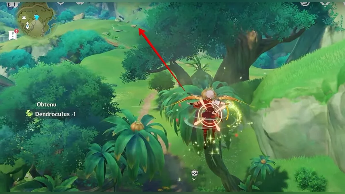 Бегите на северо-запад, пока не увидите камень, который обвязан лианами. Ударьте его дендро-стихией и заберите дендрокул.