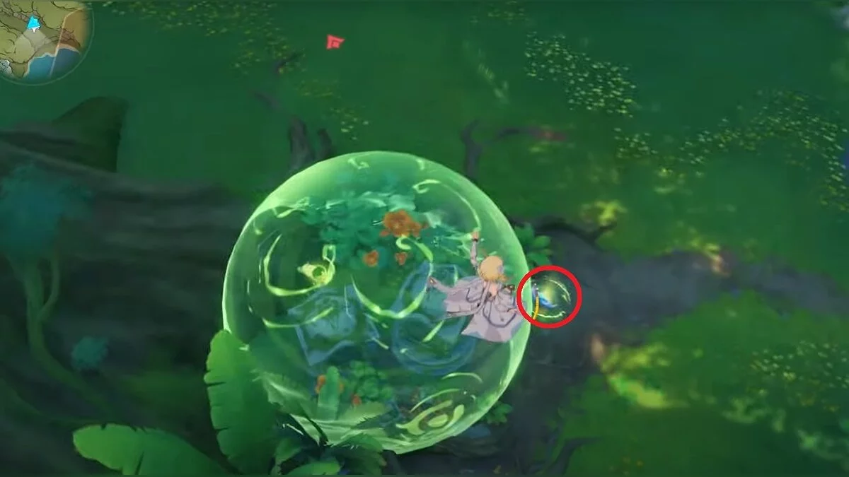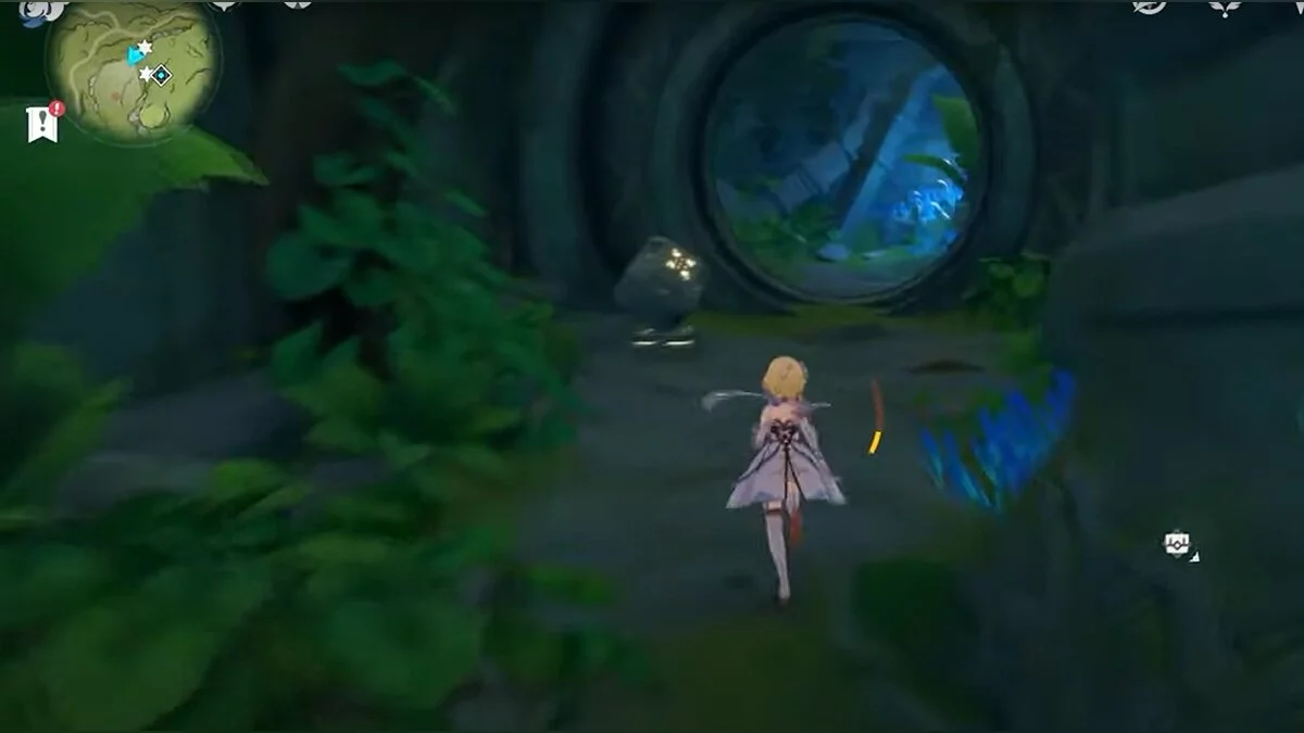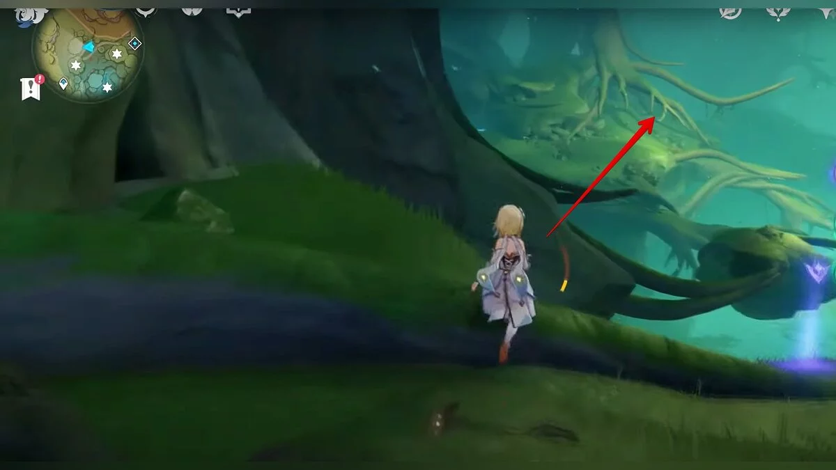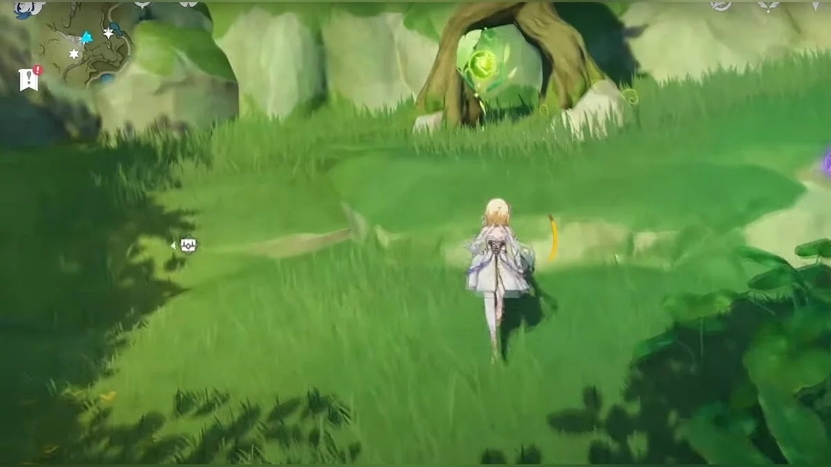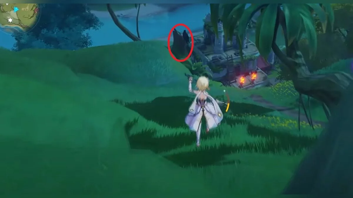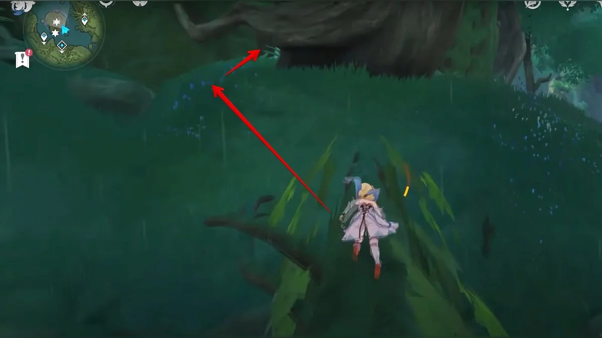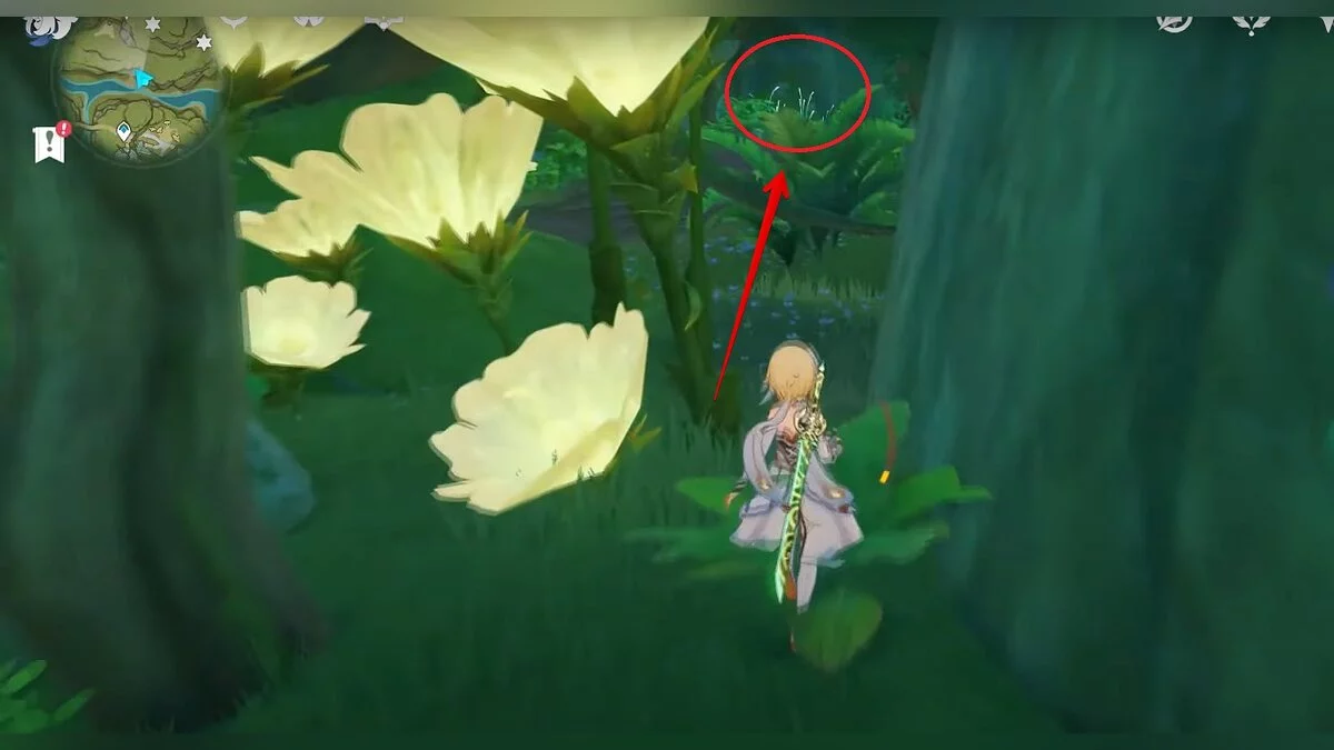 Бегите на северо-запад, пока не увидите камень, который обвязан лианами. Ударьте его дендро-стихией и заберите дендрокул.