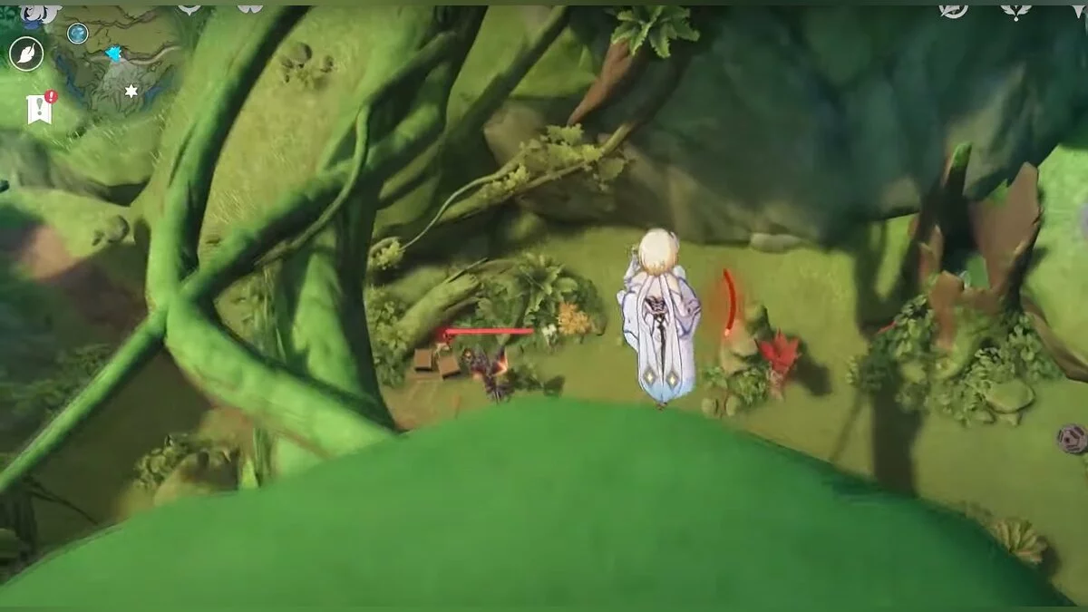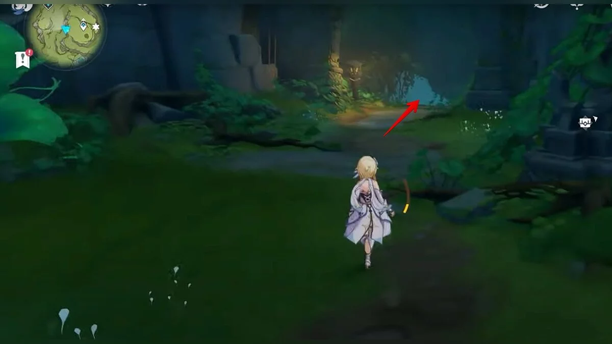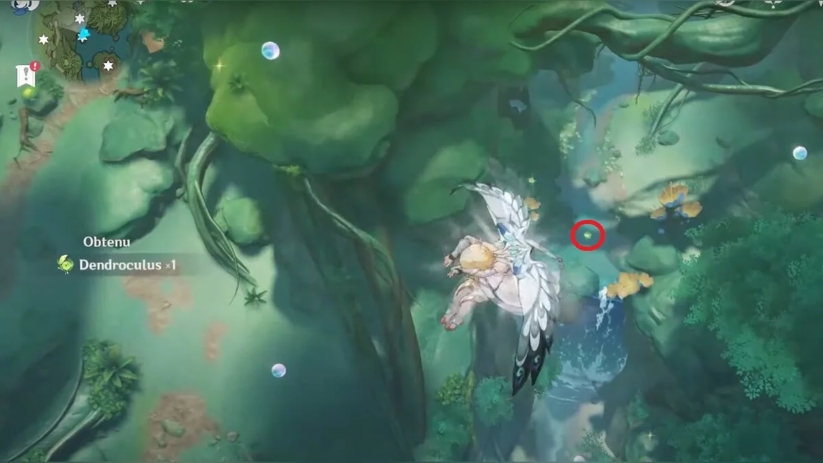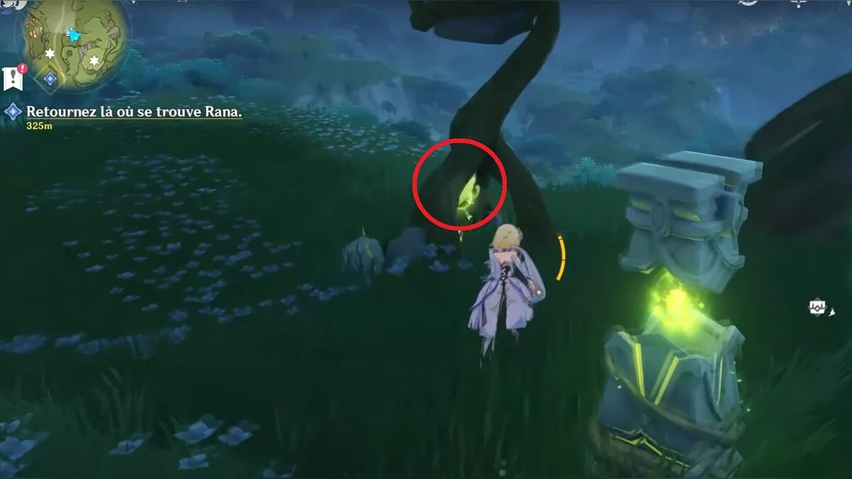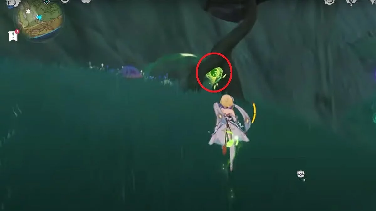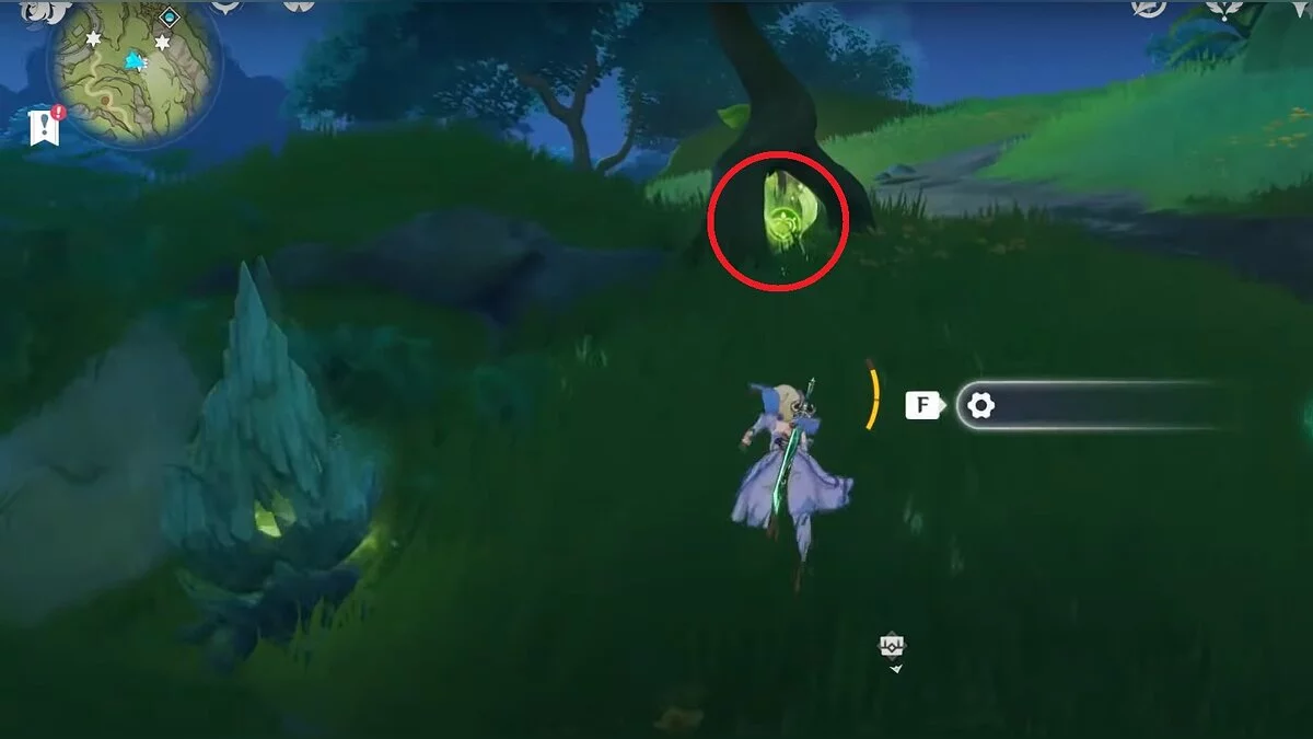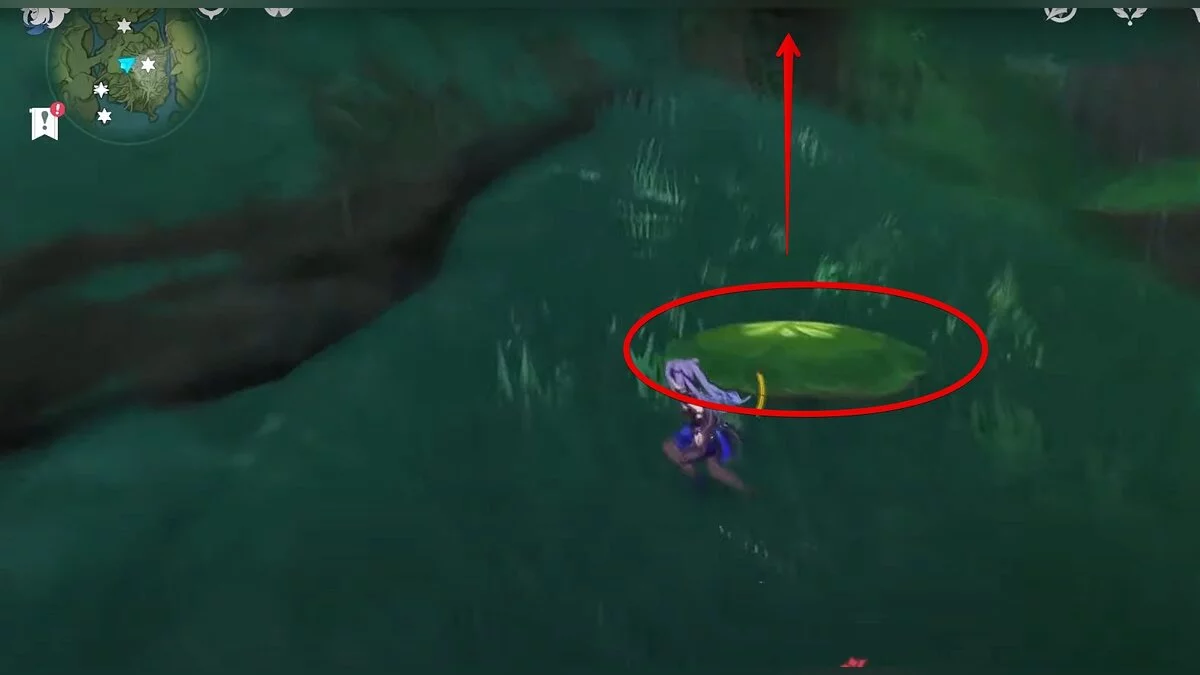 Бегите на северо-запад, пока не увидите камень, который обвязан лианами. Ударьте его дендро-стихией и заберите дендрокул.
