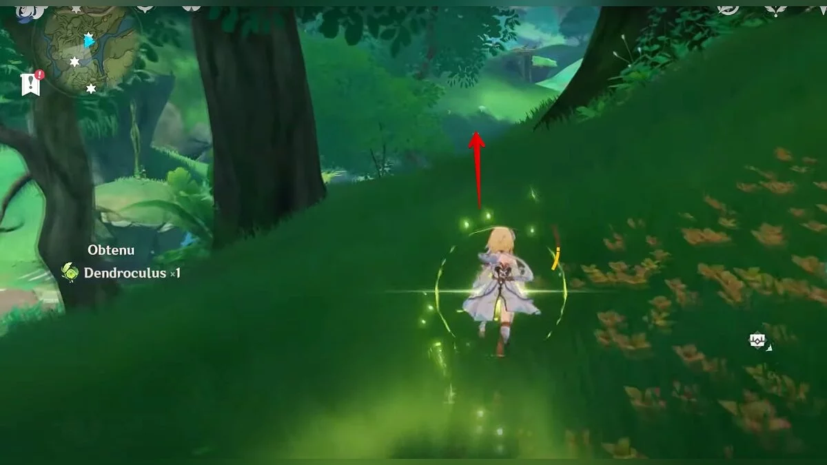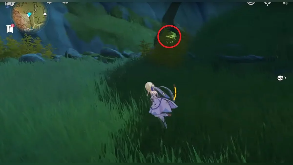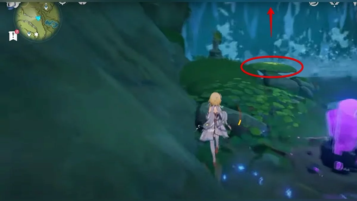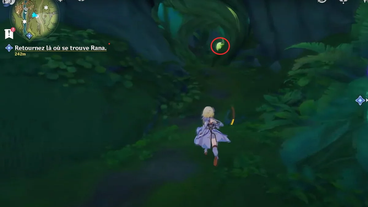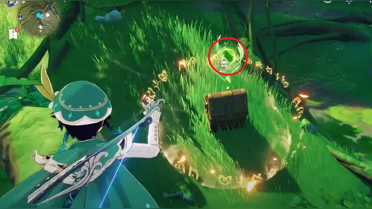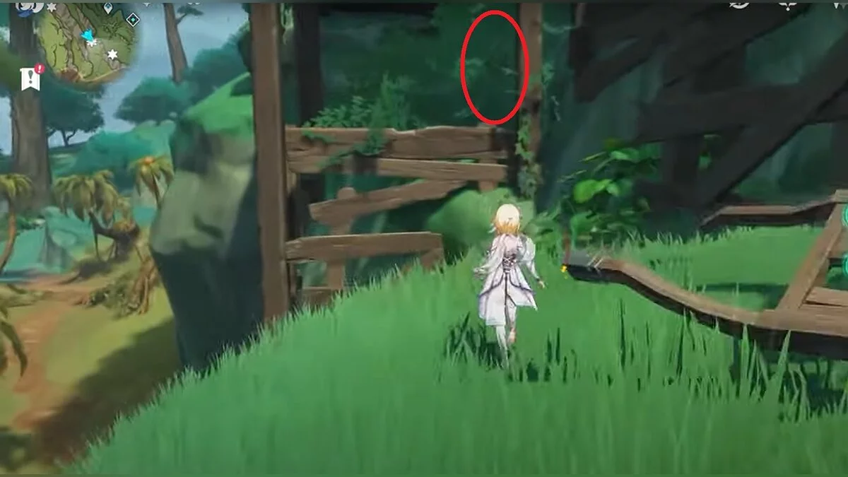 Бегите на северо-запад, пока не увидите камень, который обвязан лианами. Ударьте его дендро-стихией и заберите дендрокул.