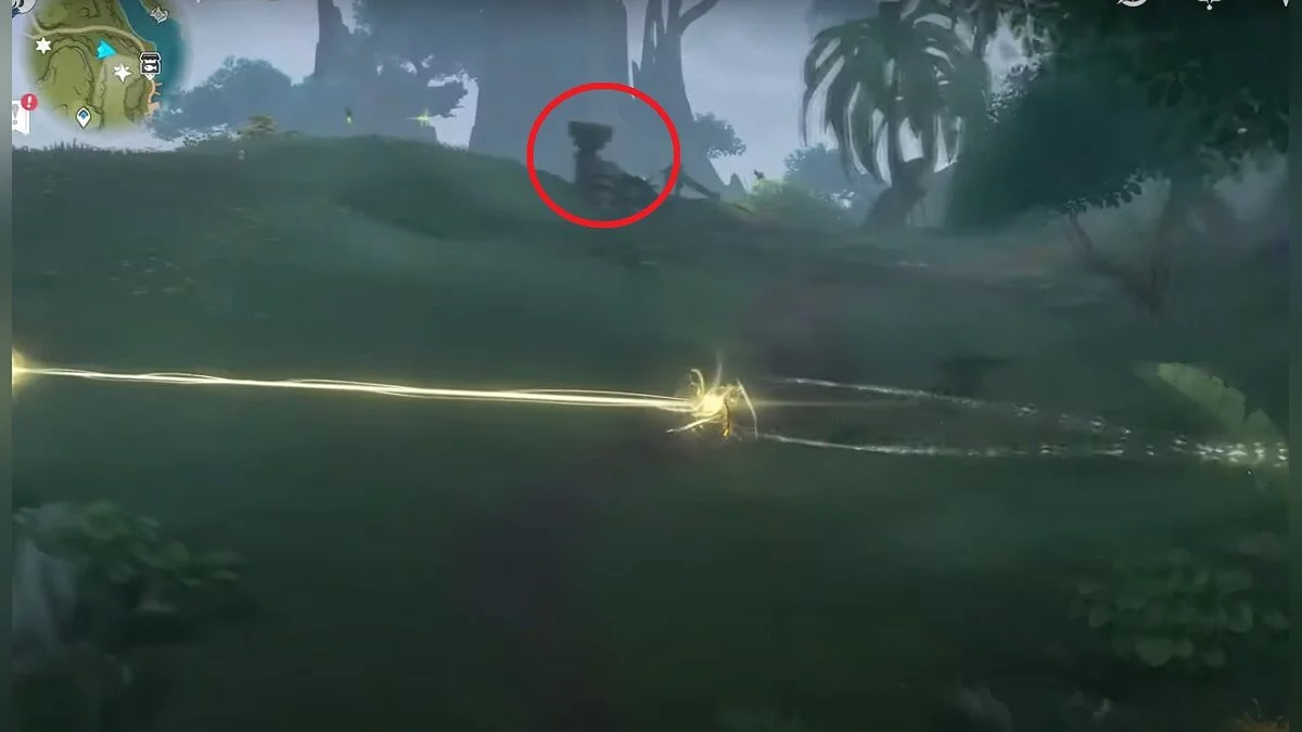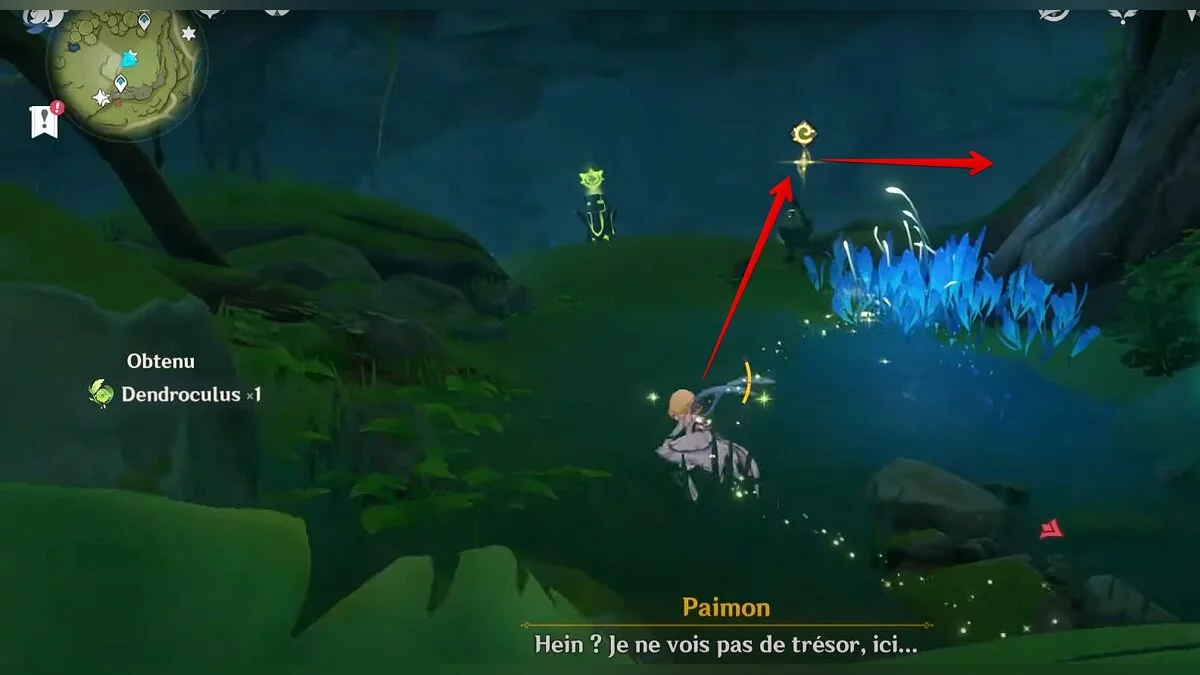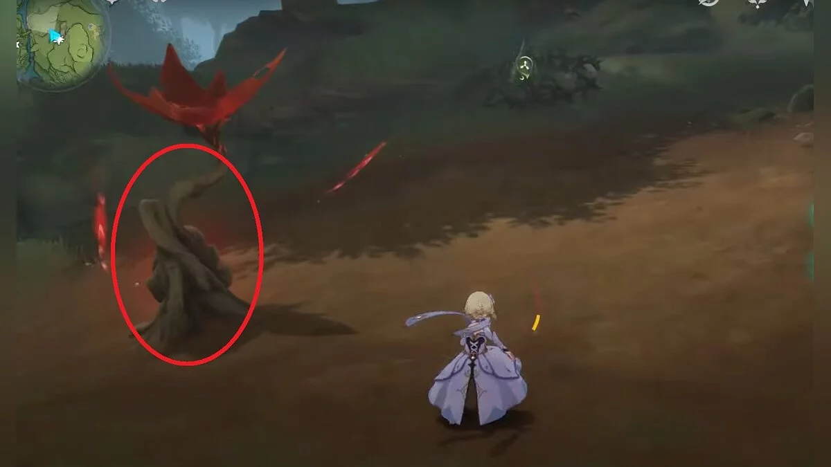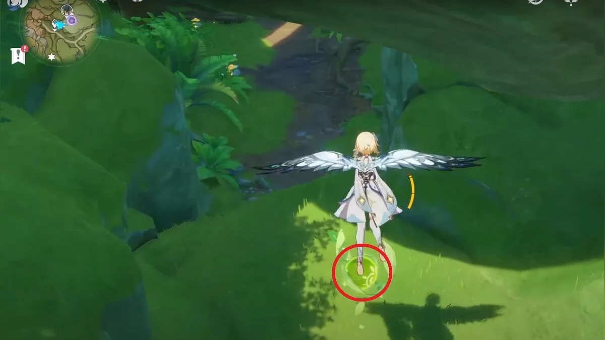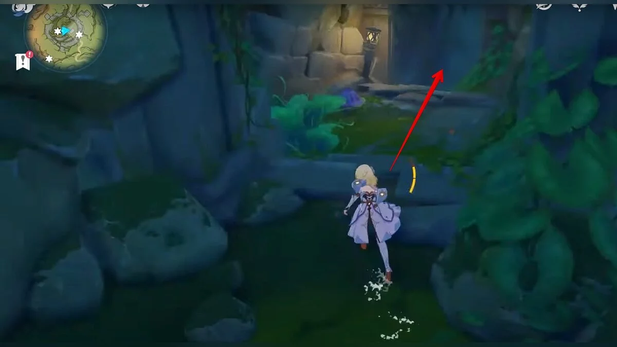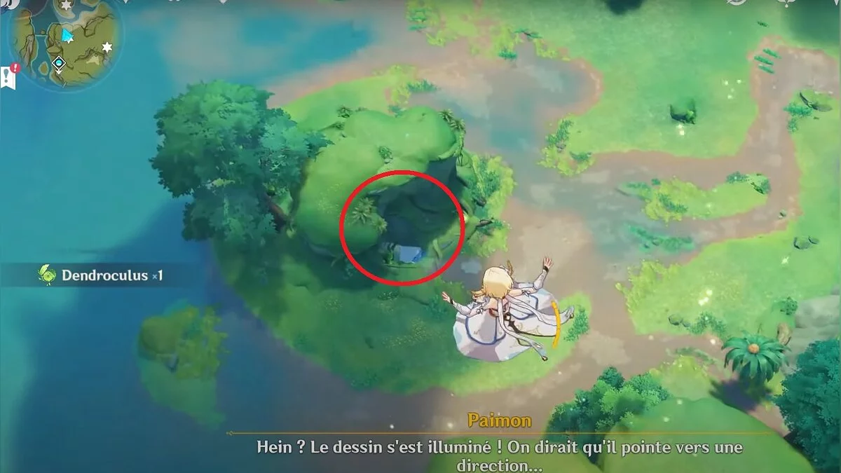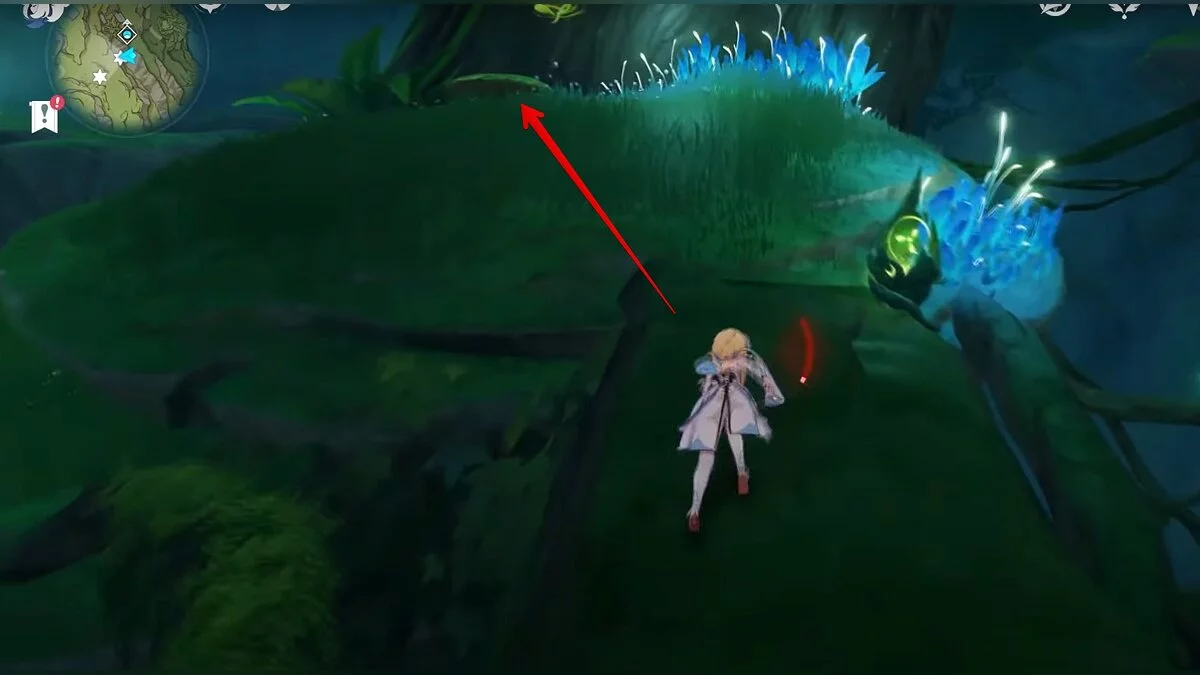 Бегите на северо-запад, пока не увидите камень, который обвязан лианами. Ударьте его дендро-стихией и заберите дендрокул.
