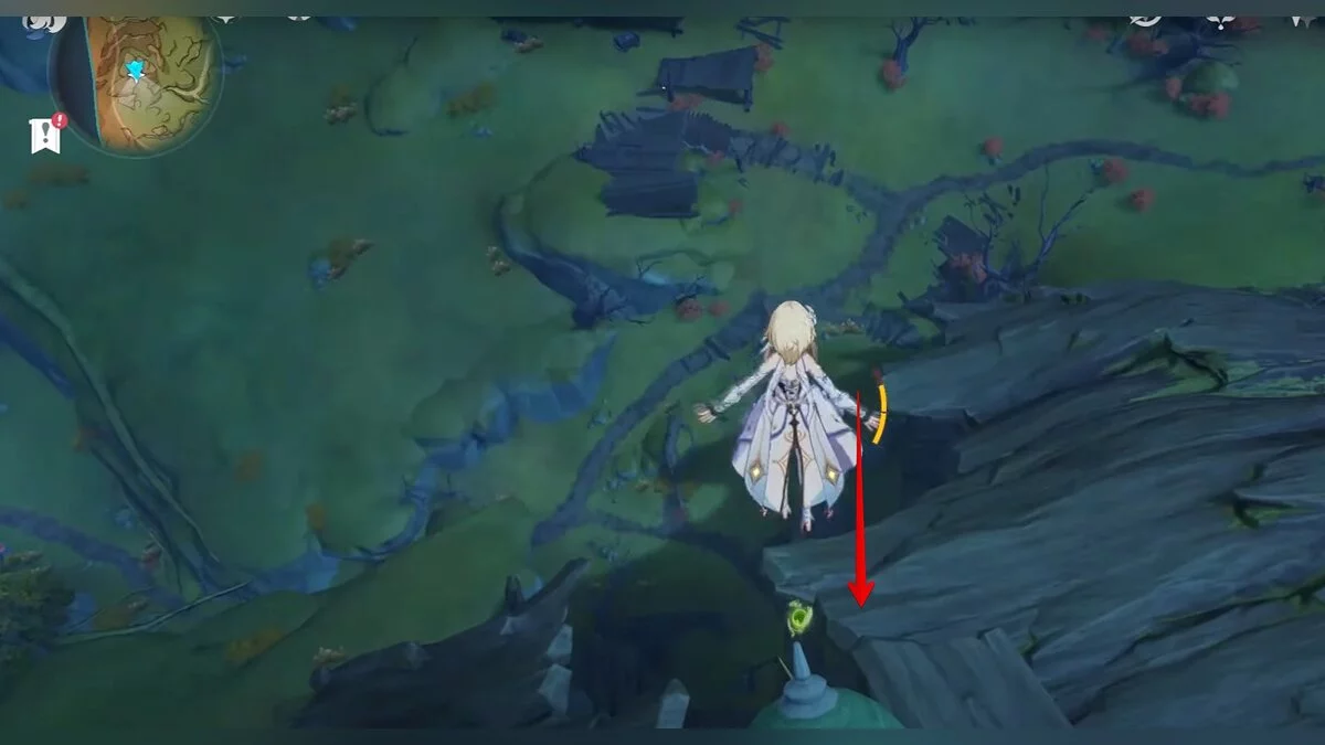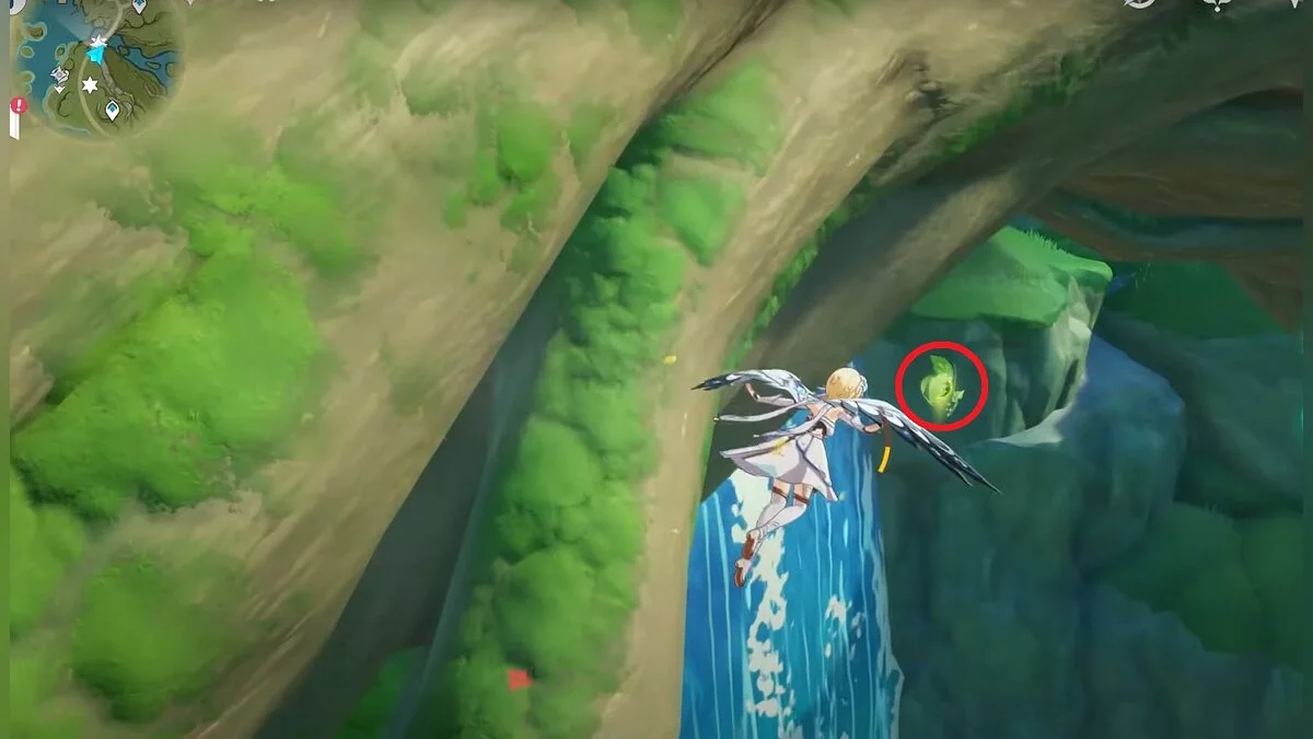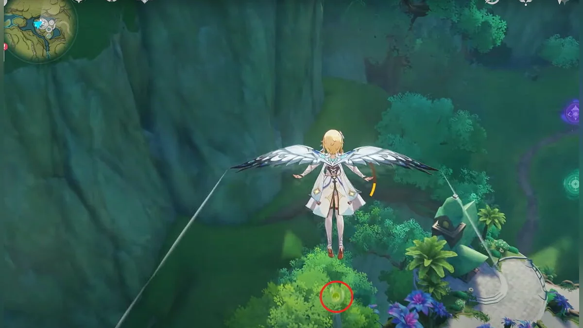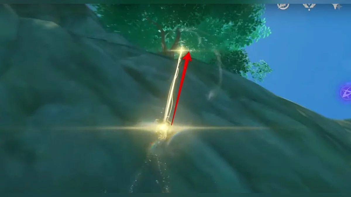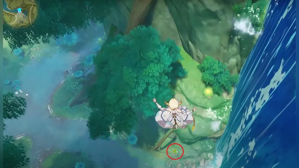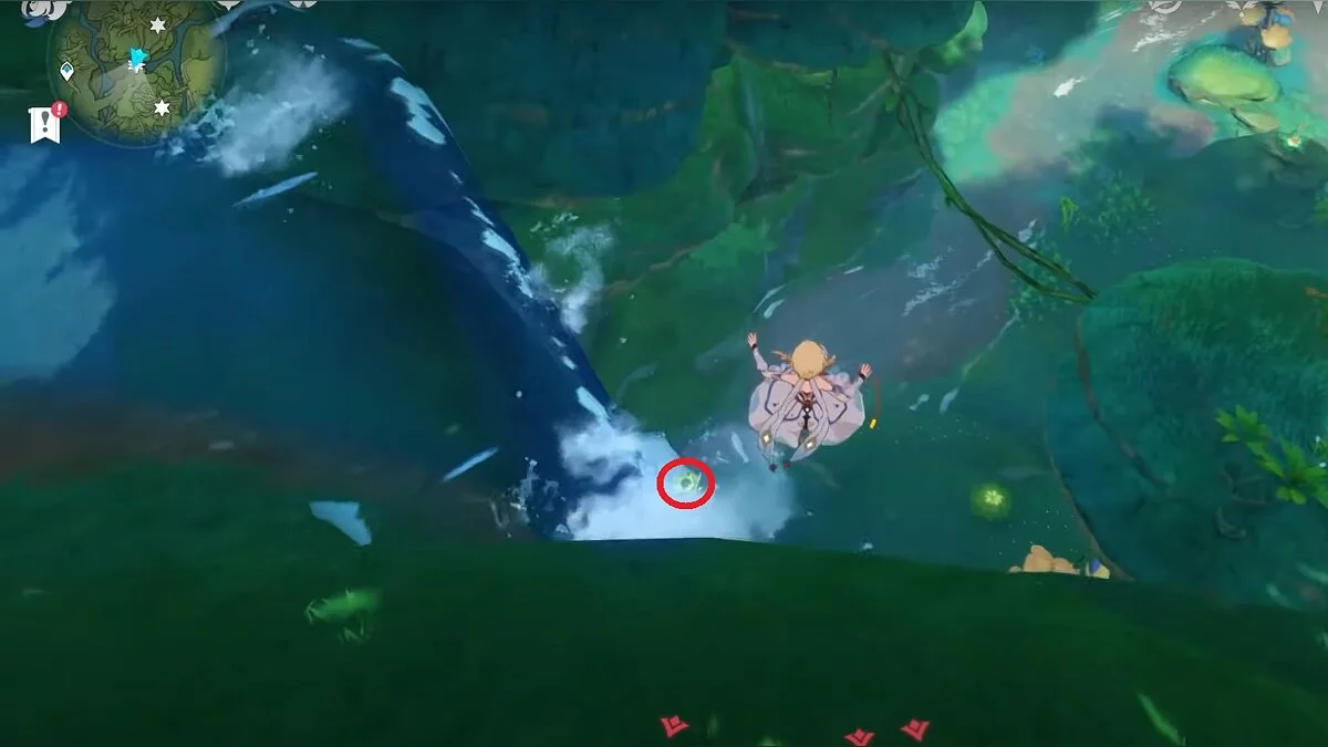 28-й дендрокул. От предыдущей точки бегите на юг и взбирайтесь на скалу. Вам нужно взаимодействовать с красным цветком, а затем использовать дендро-удар на камне с лианами. Дендрокул находится под ним.
