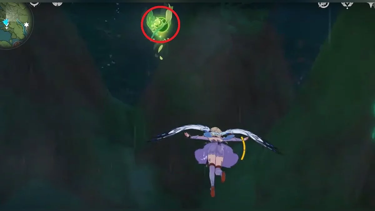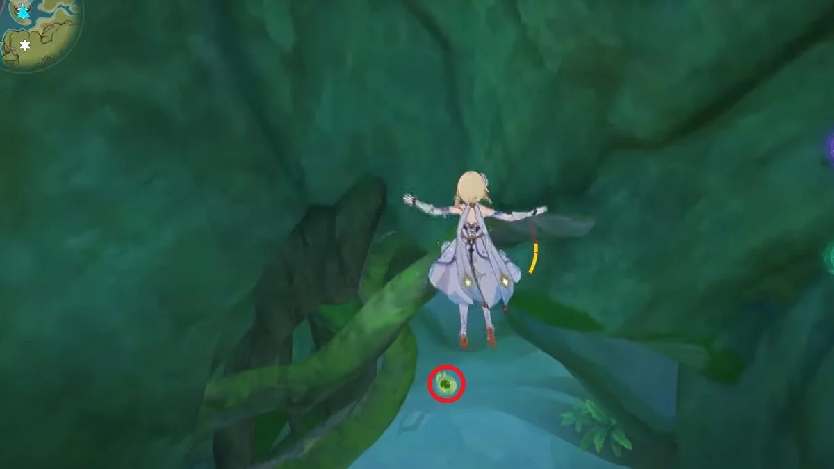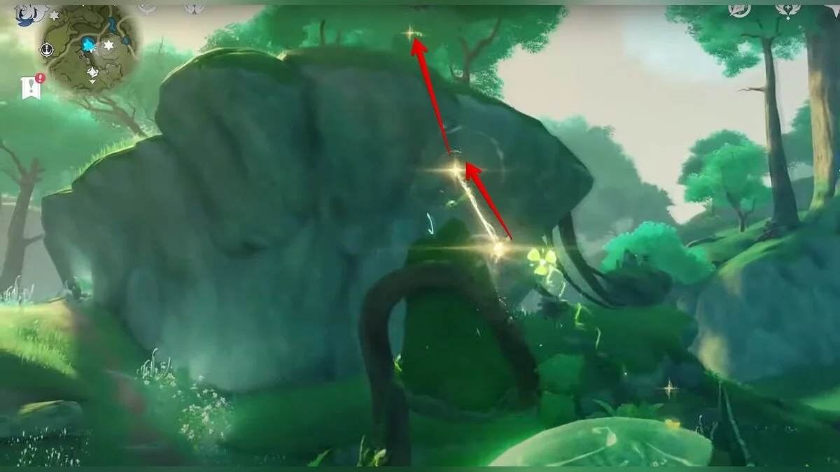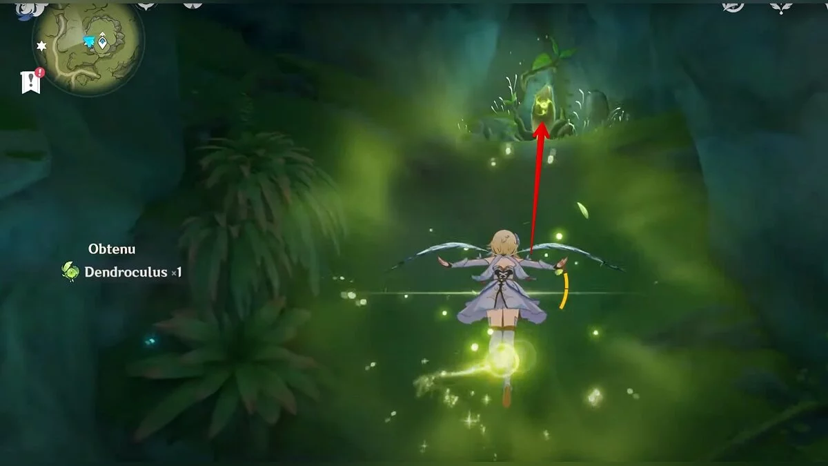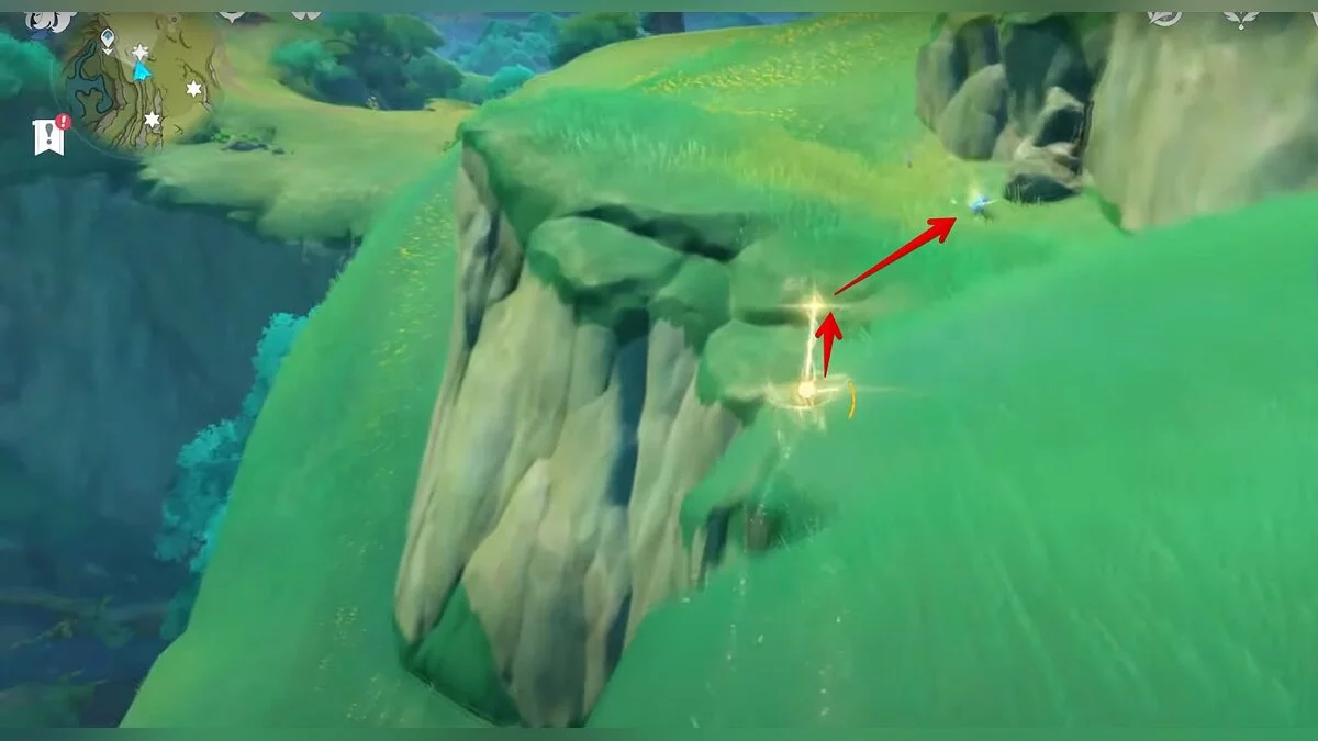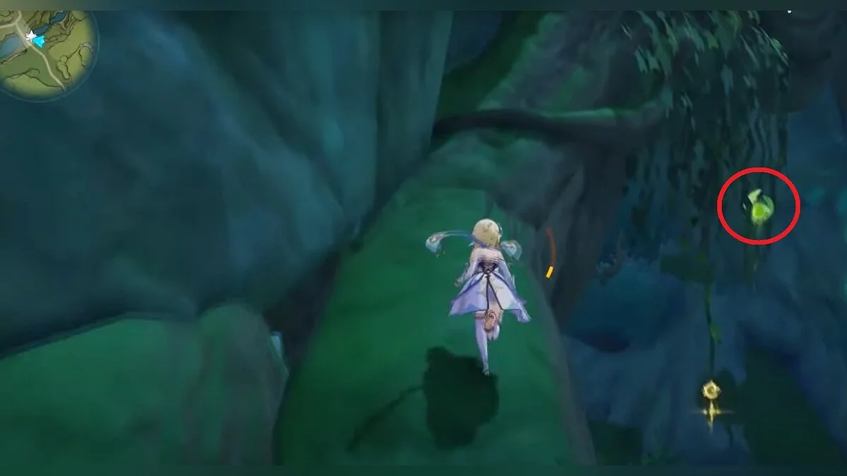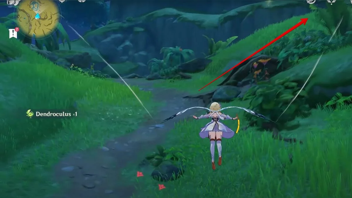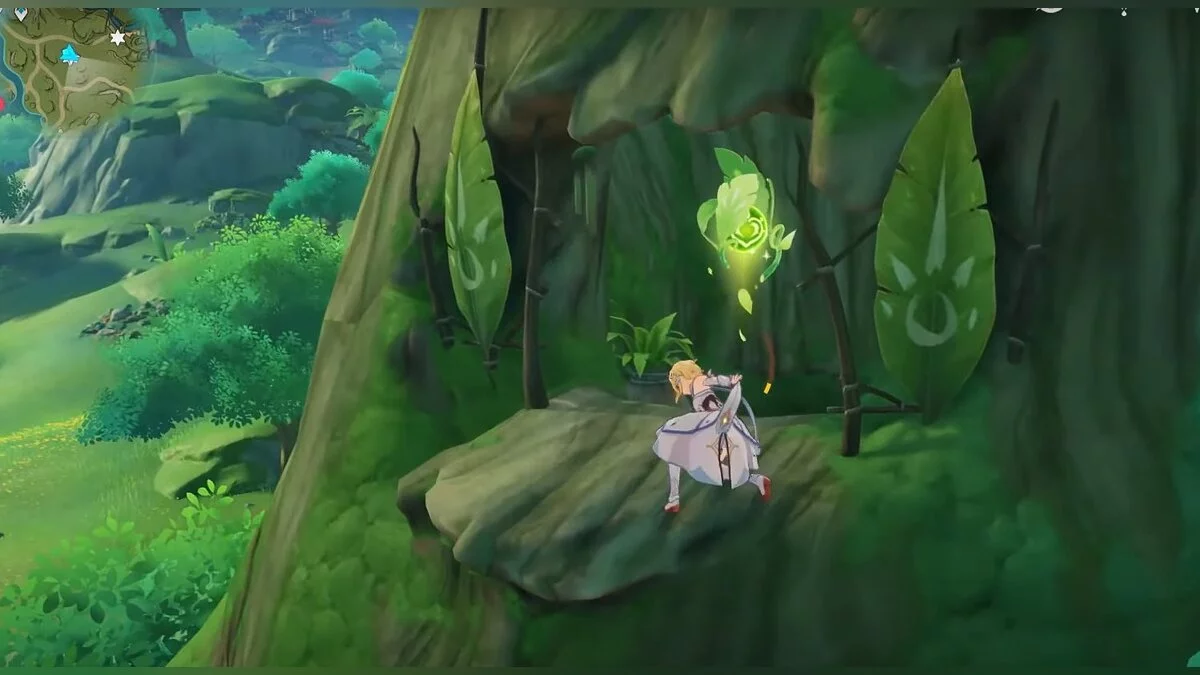 13-й дендрокул. От места, где вы подобрали предыдущий дендрокул, двигайтесь на север, а затем карабкайтесь по скалам на самый верх. Активируйте бутон стихией Дендро, чтобы вызвать четырёхлистный символ, за который можно зацепиться. Используйте его, чтобы подобрать дендрокул.