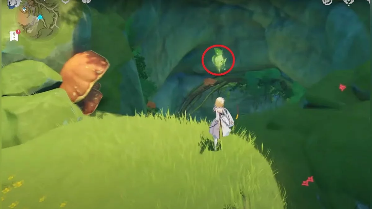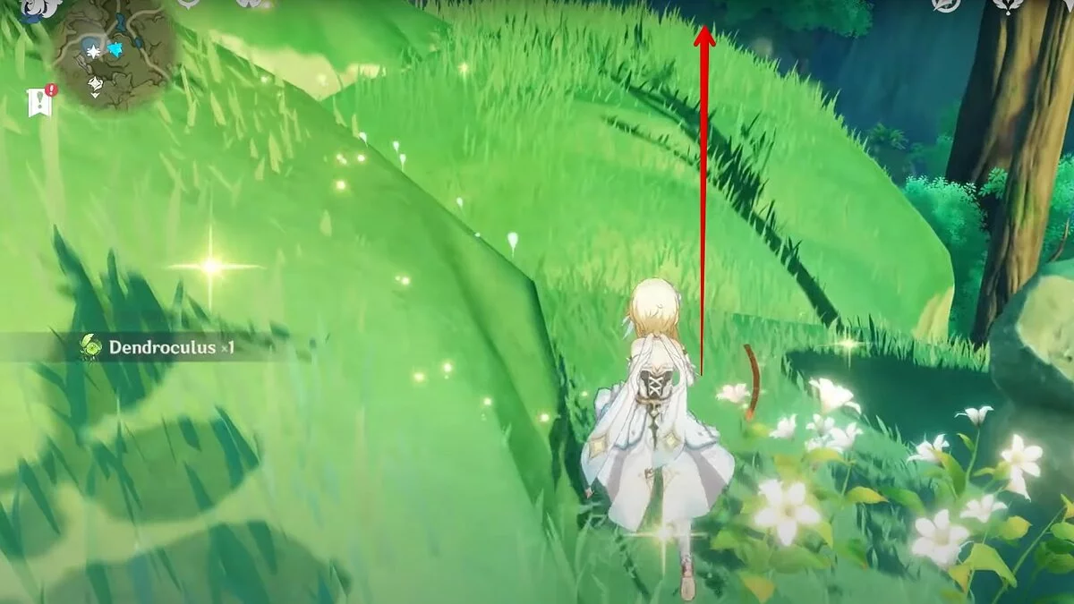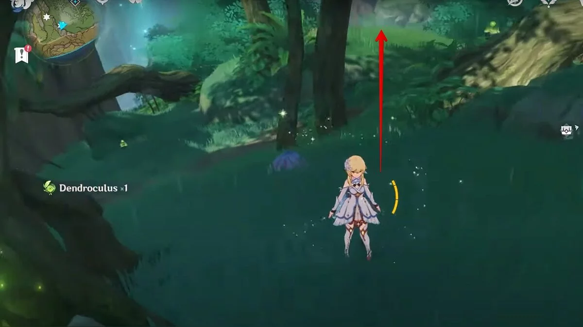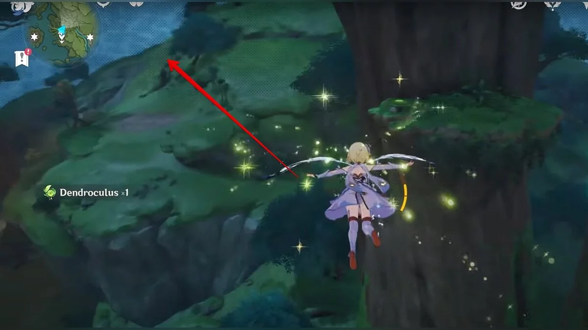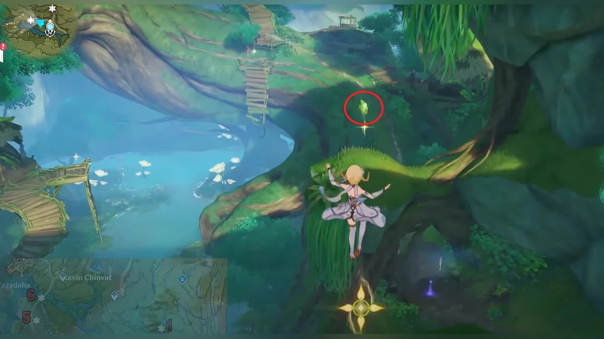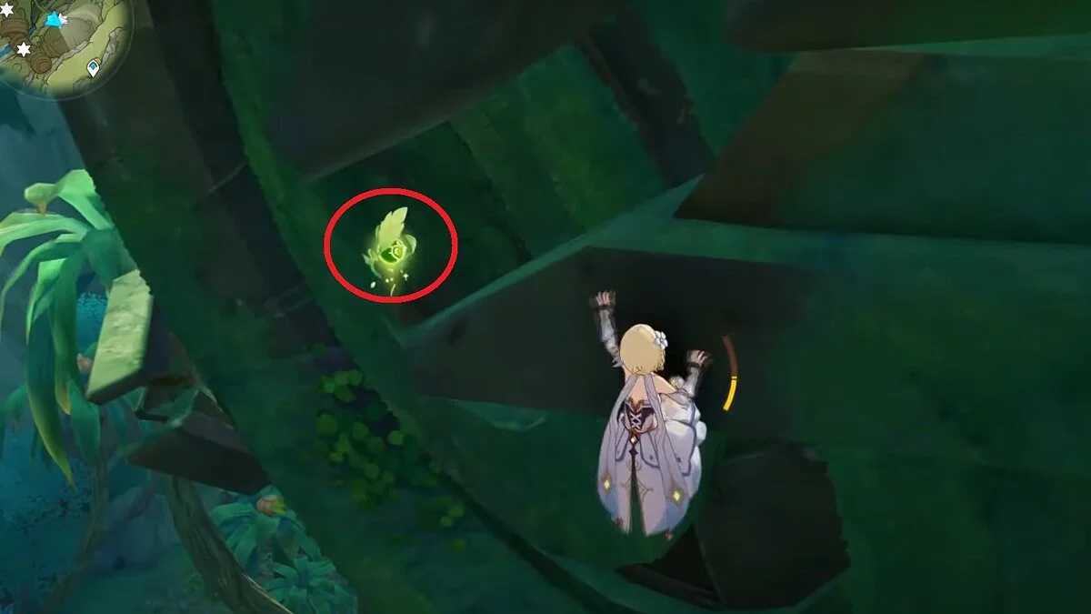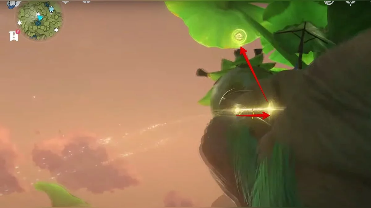 13-й дендрокул. От места, где вы подобрали предыдущий дендрокул, двигайтесь на север, а затем карабкайтесь по скалам на самый верх. Активируйте бутон стихией Дендро, чтобы вызвать четырёхлистный символ, за который можно зацепиться. Используйте его, чтобы подобрать дендрокул.