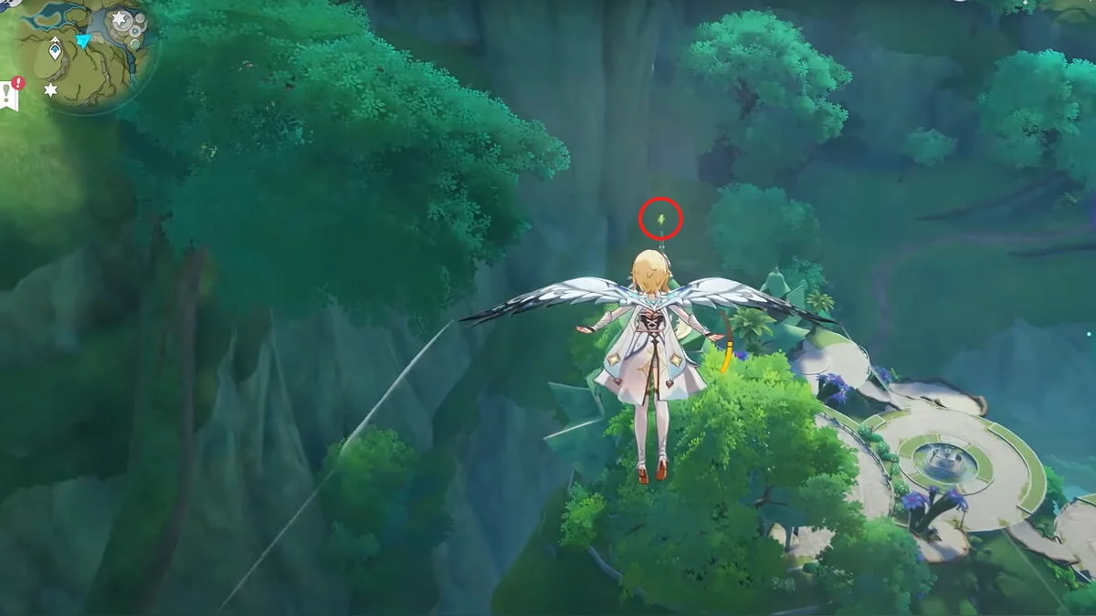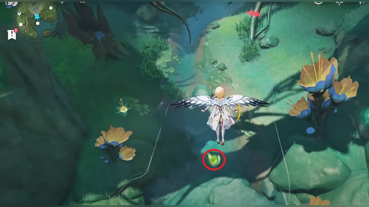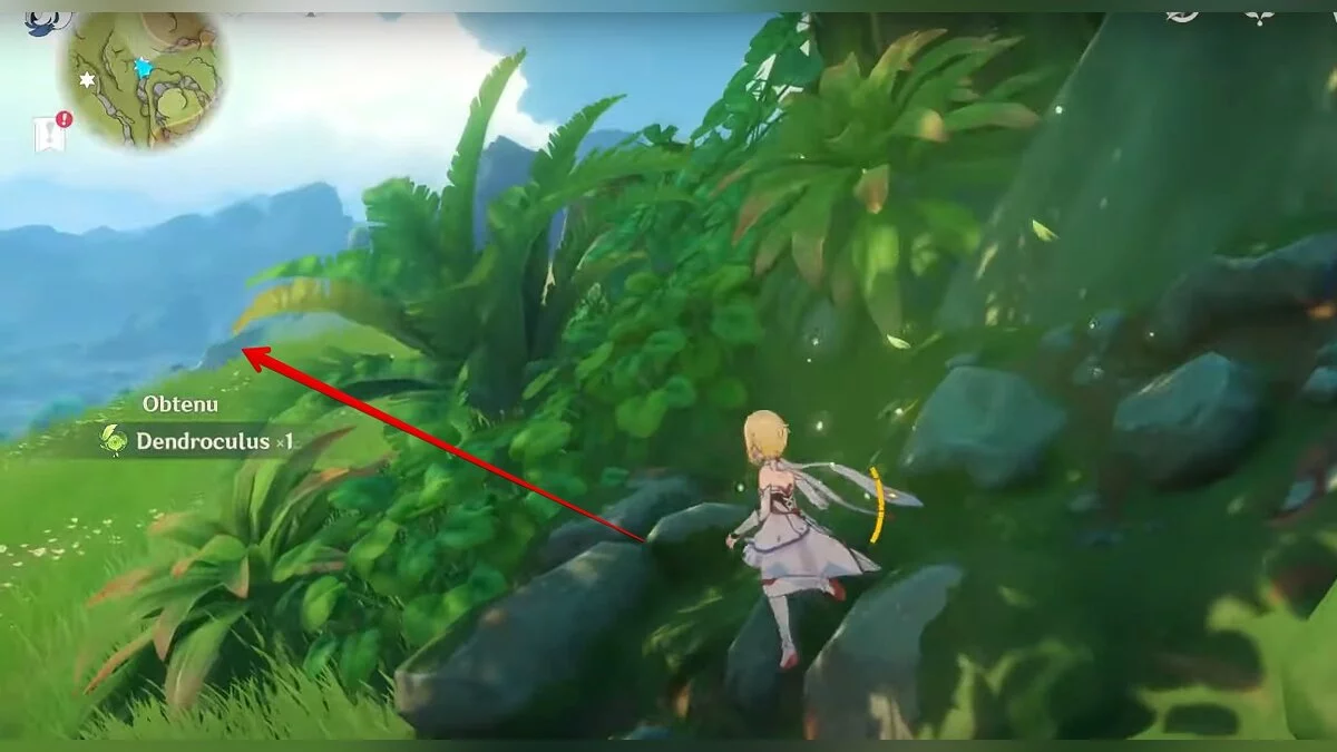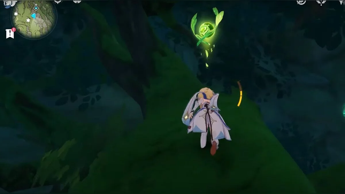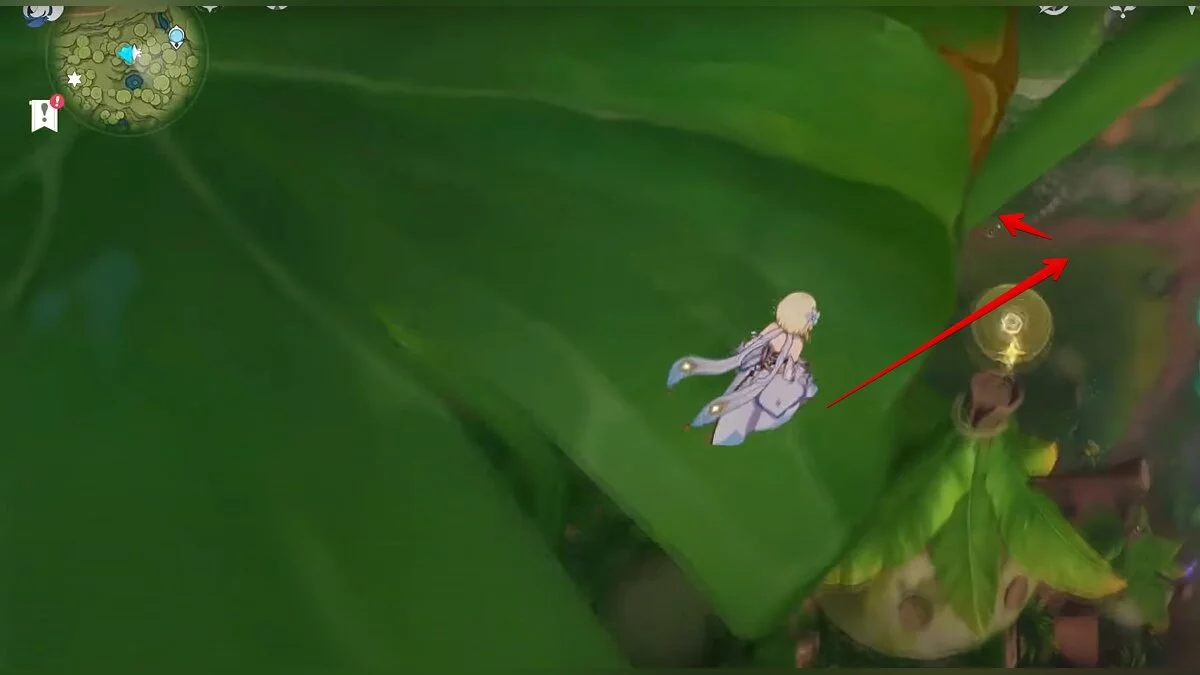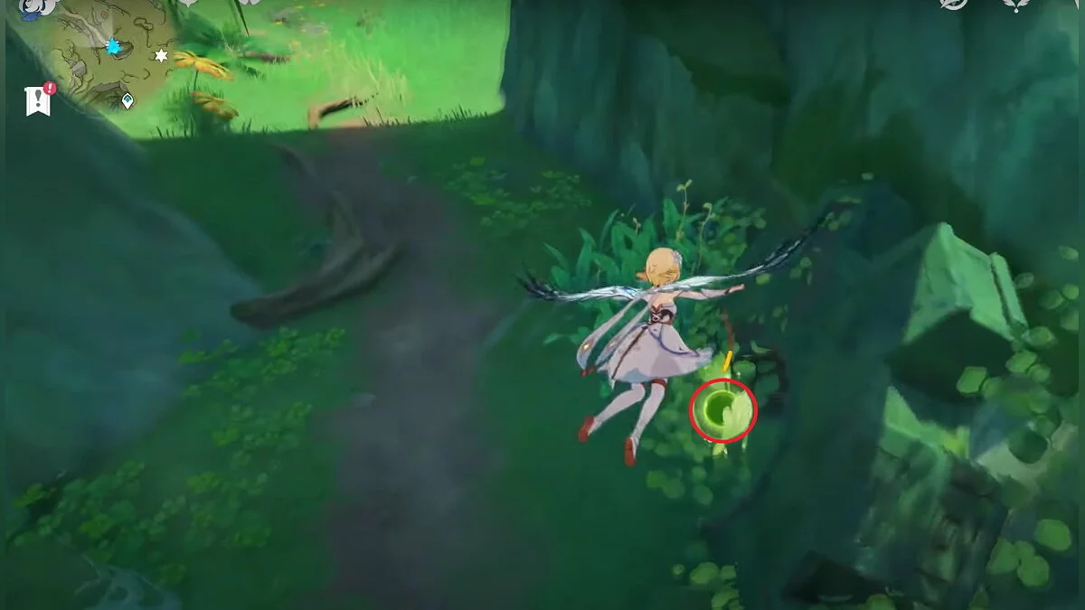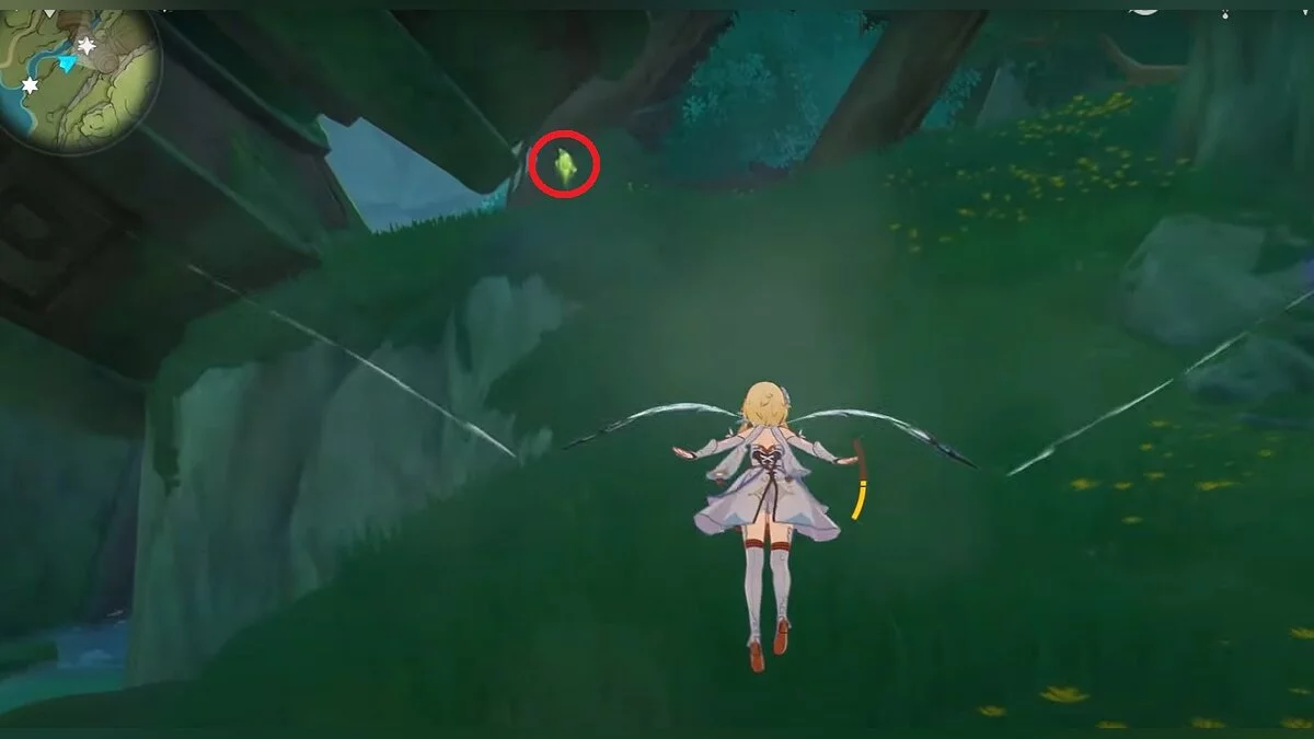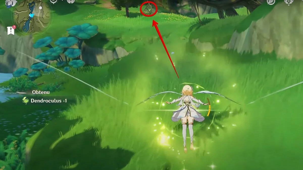 13-й дендрокул. От места, где вы подобрали предыдущий дендрокул, двигайтесь на север, а затем карабкайтесь по скалам на самый верх. Активируйте бутон стихией Дендро, чтобы вызвать четырёхлистный символ, за который можно зацепиться. Используйте его, чтобы подобрать дендрокул.