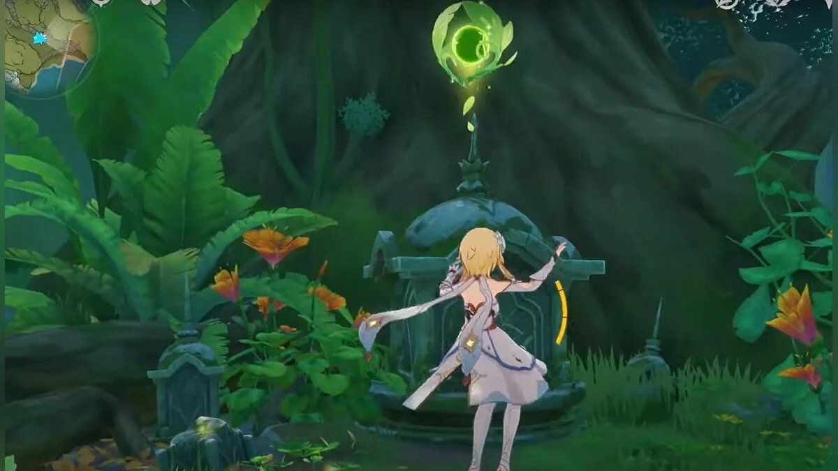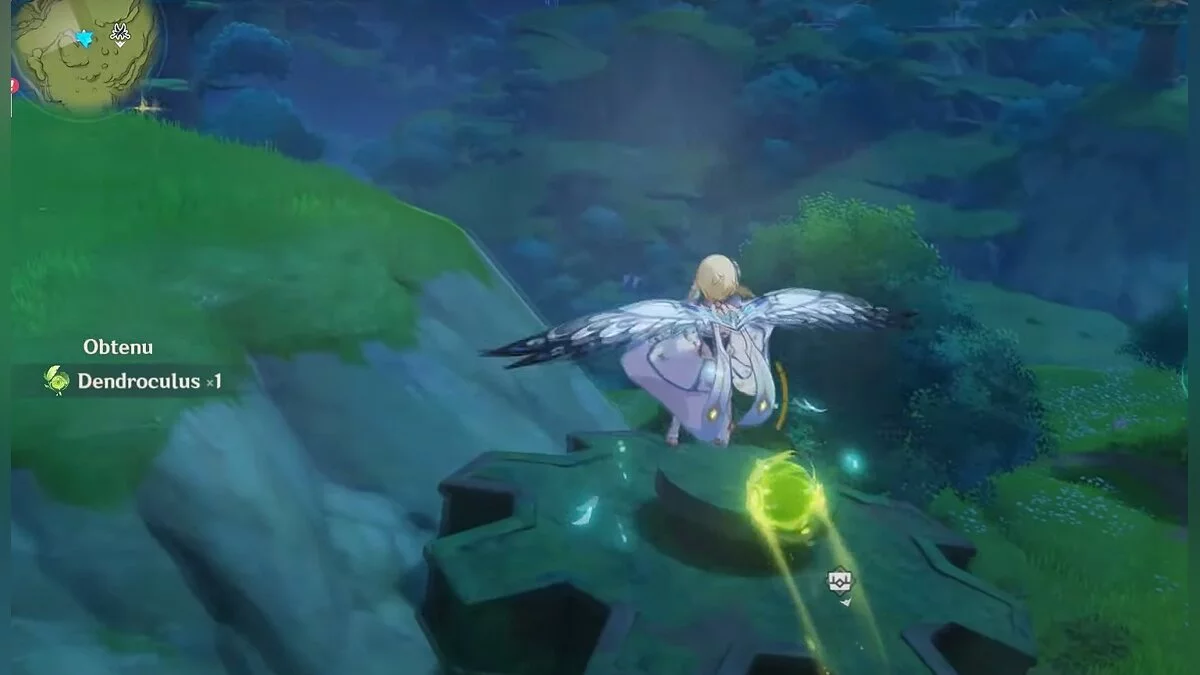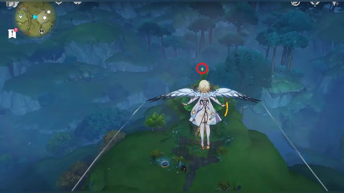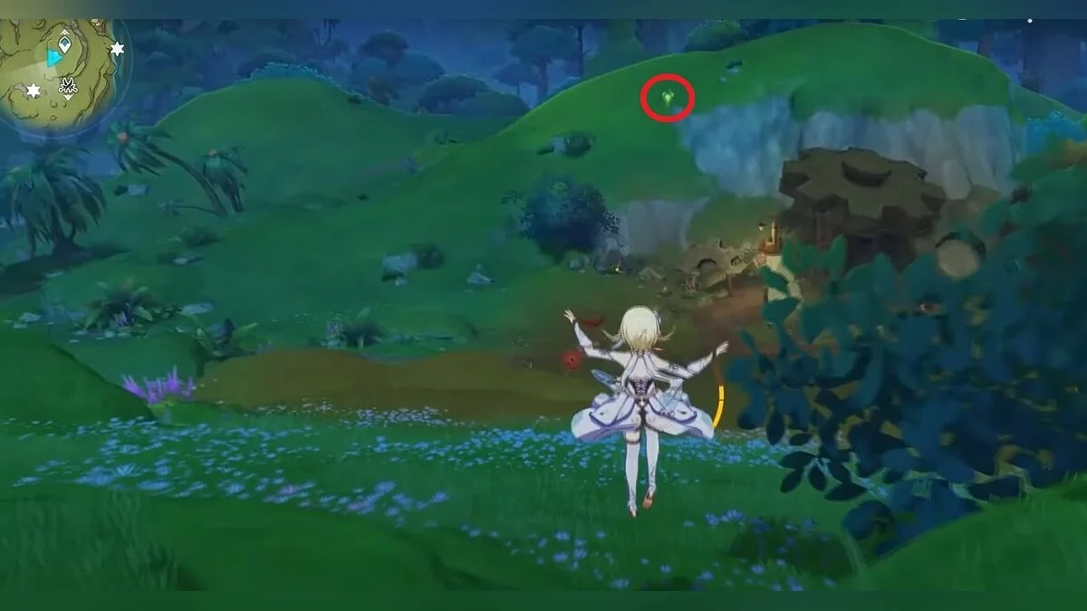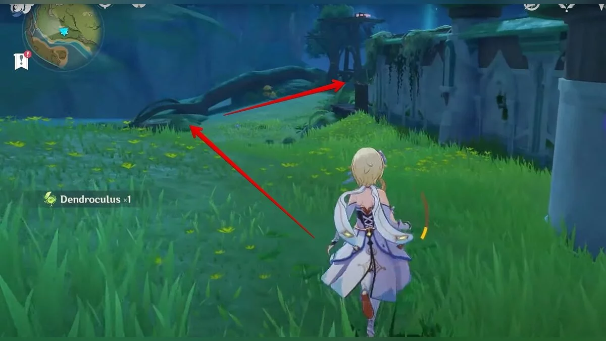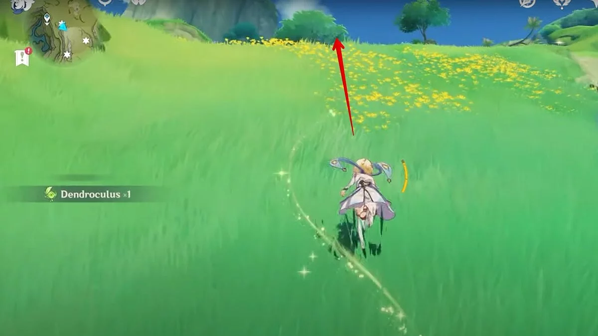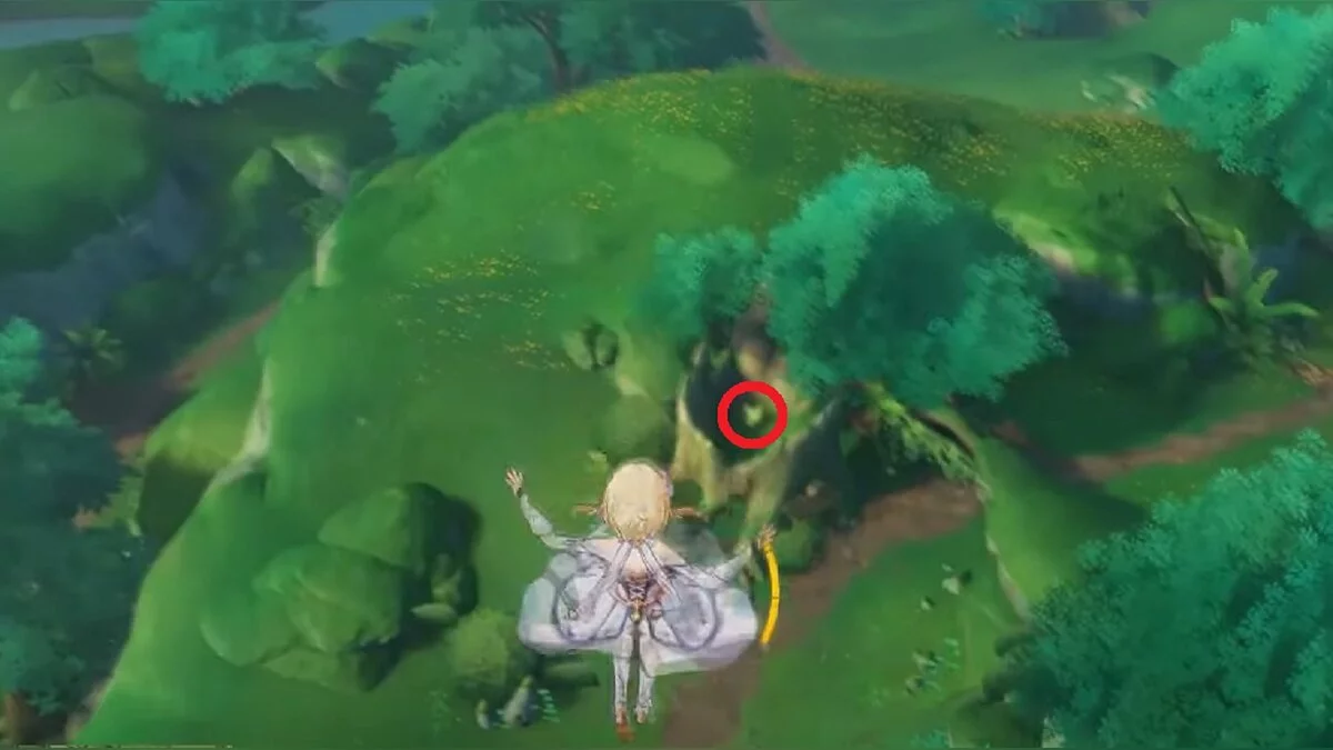 13-й дендрокул. От места, где вы подобрали предыдущий дендрокул, двигайтесь на север, а затем карабкайтесь по скалам на самый верх. Активируйте бутон стихией Дендро, чтобы вызвать четырёхлистный символ, за который можно зацепиться. Используйте его, чтобы подобрать дендрокул.