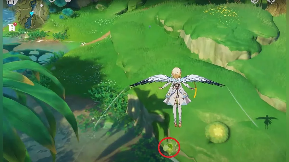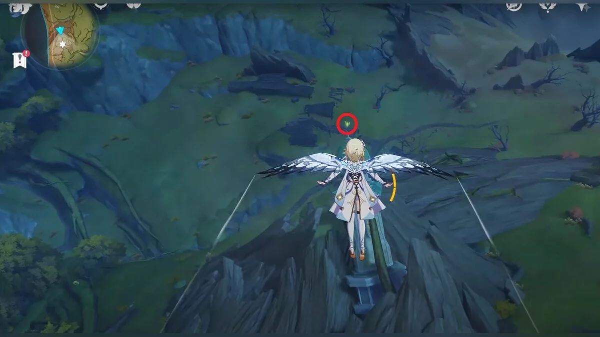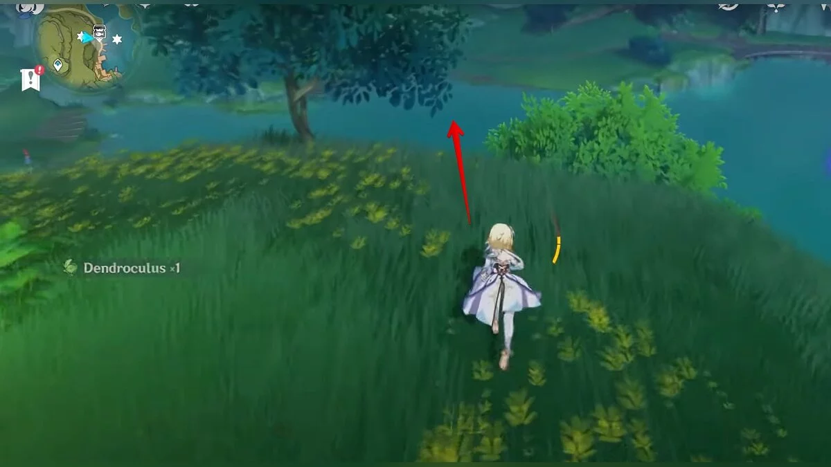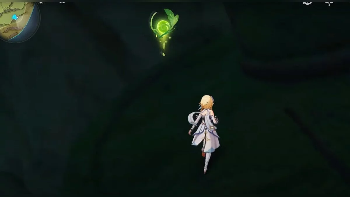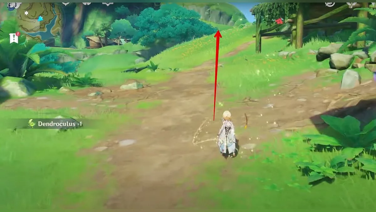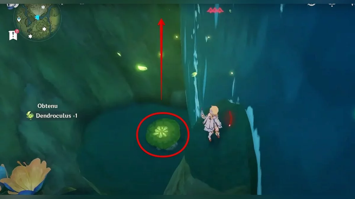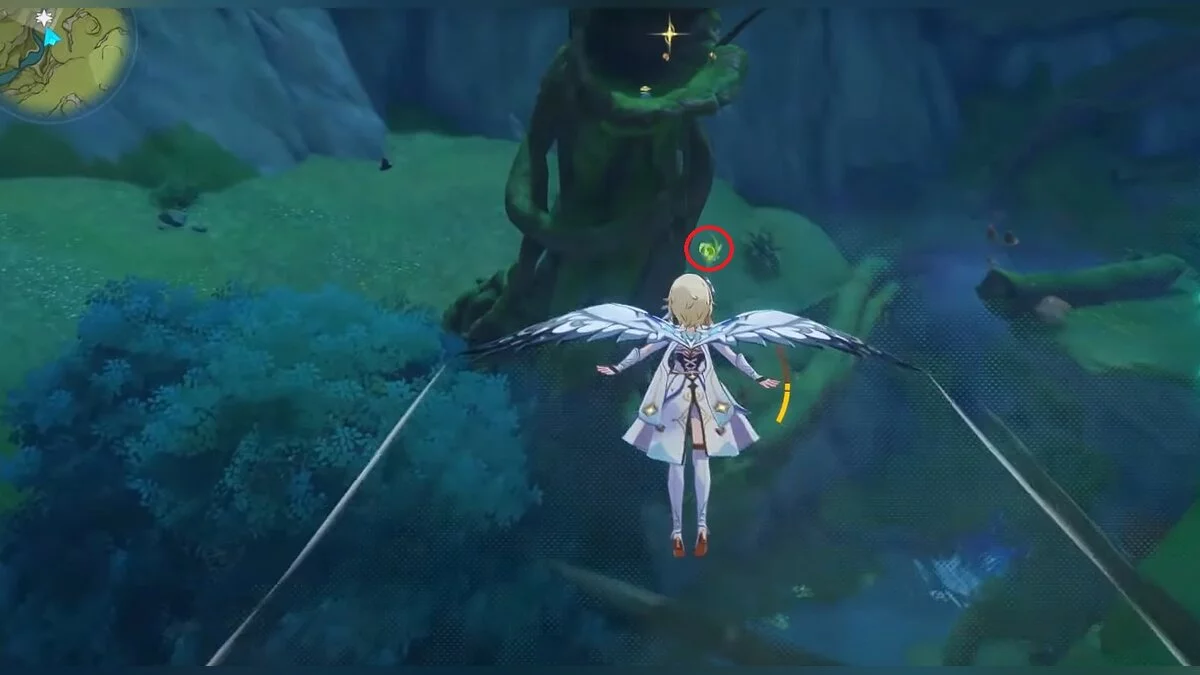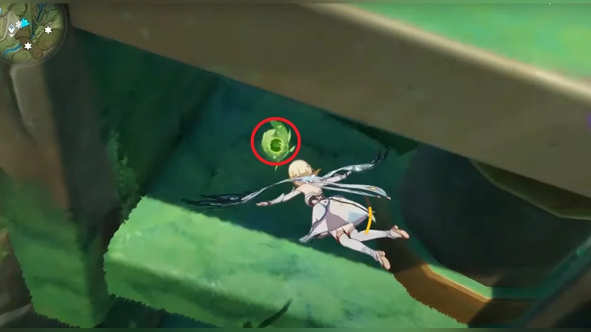 13-й дендрокул. От места, где вы подобрали предыдущий дендрокул, двигайтесь на север, а затем карабкайтесь по скалам на самый верх. Активируйте бутон стихией Дендро, чтобы вызвать четырёхлистный символ, за который можно зацепиться. Используйте его, чтобы подобрать дендрокул.