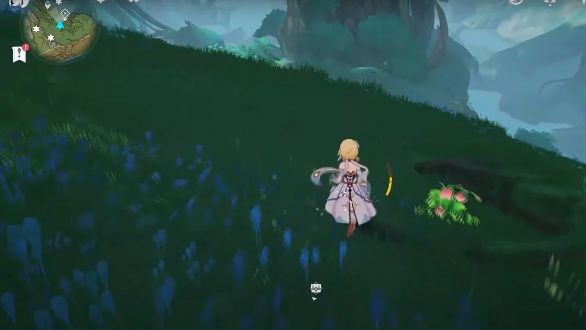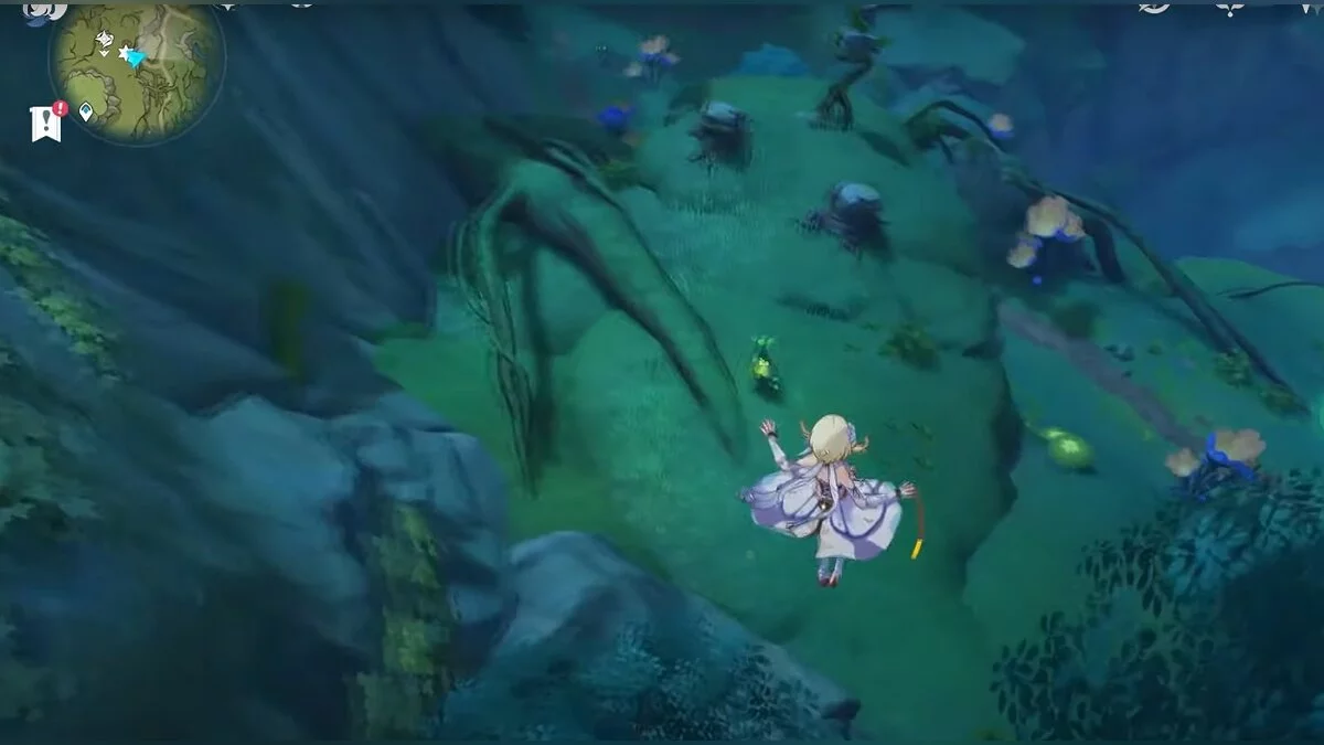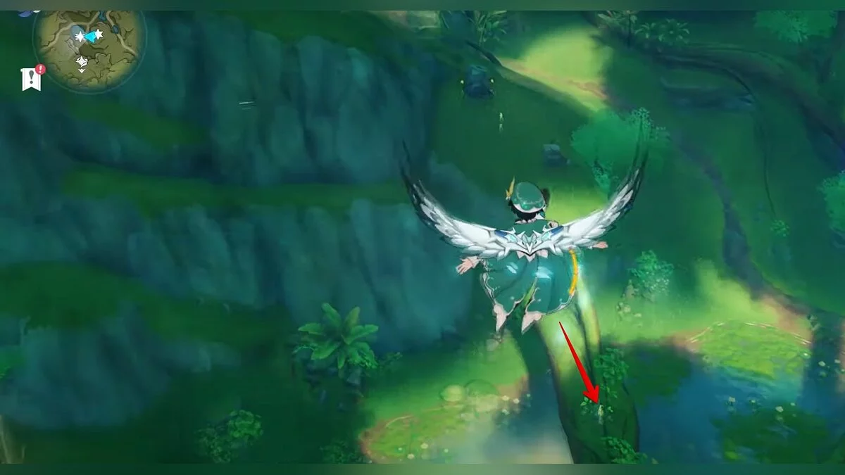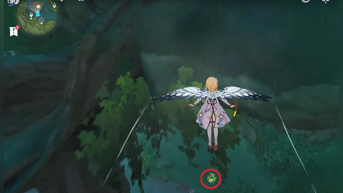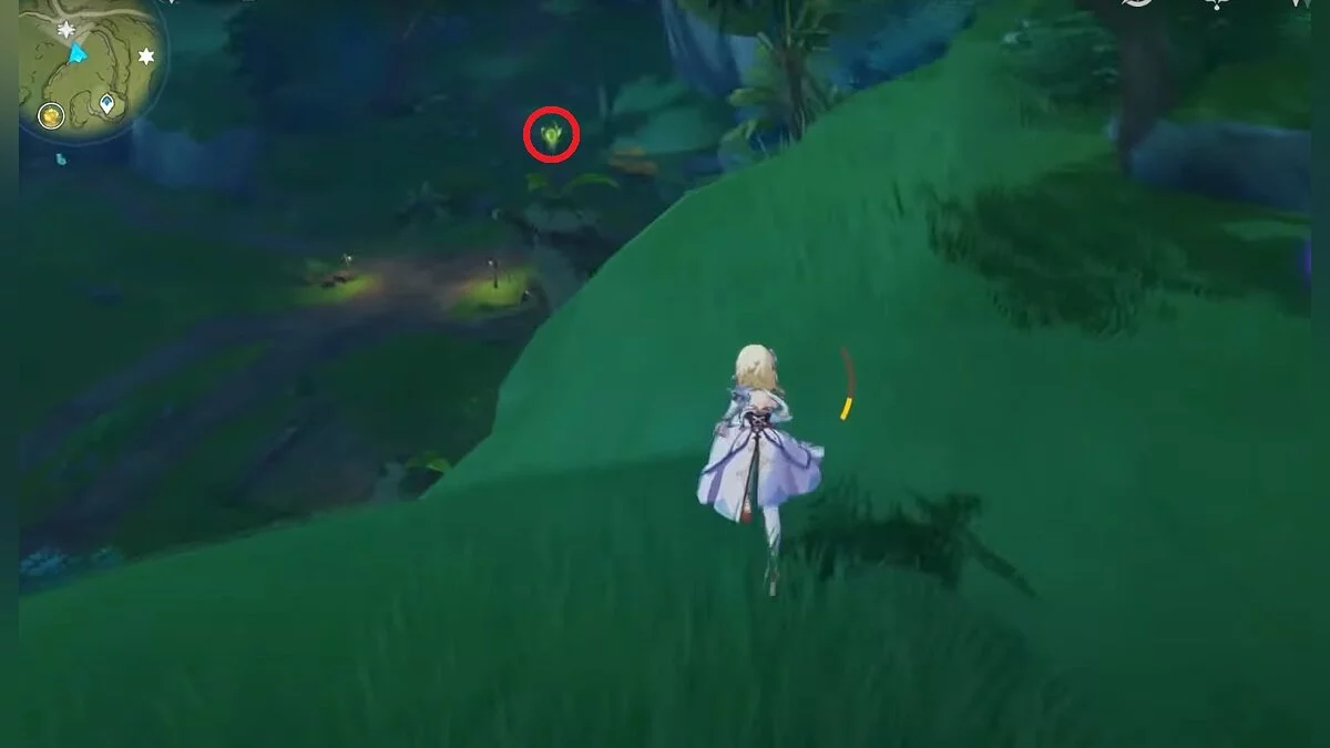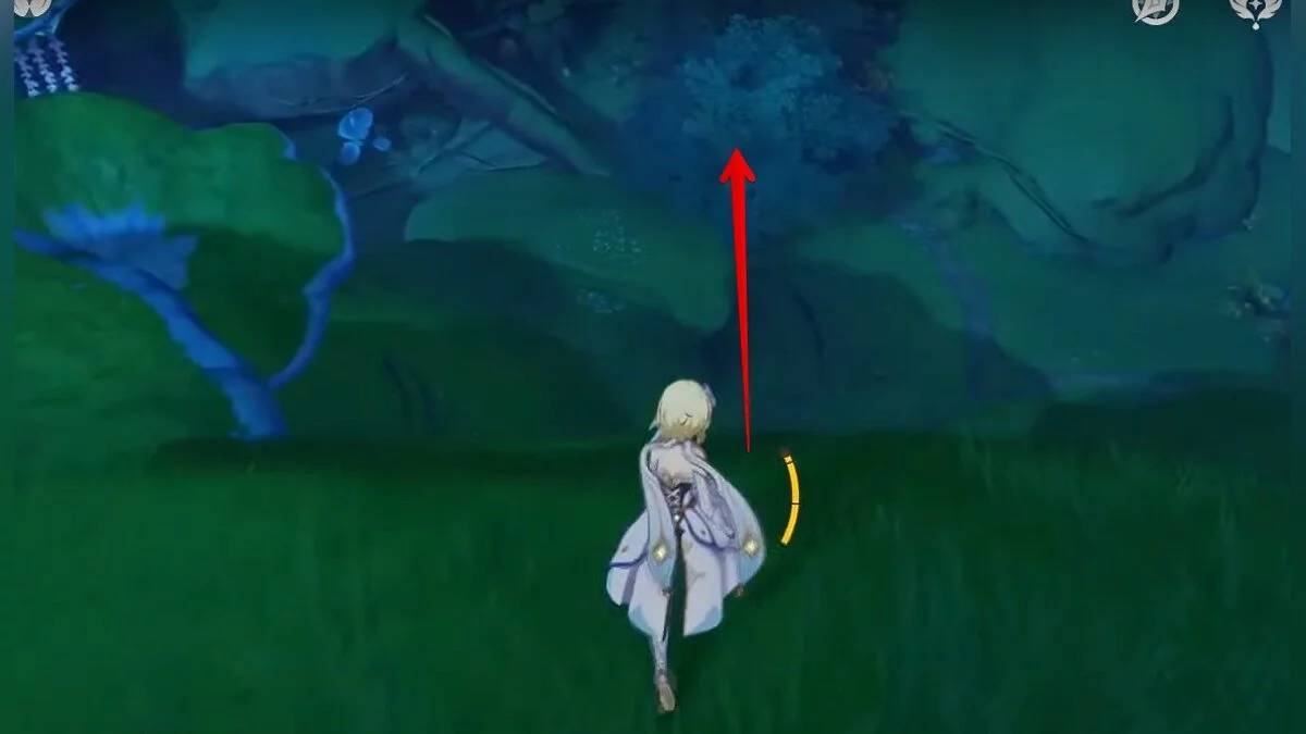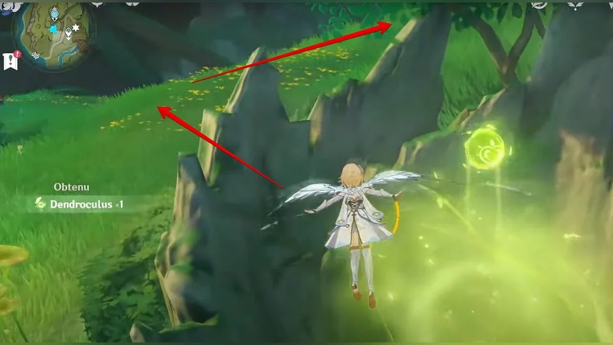 13-й дендрокул. От места, где вы подобрали предыдущий дендрокул, двигайтесь на север, а затем карабкайтесь по скалам на самый верх. Активируйте бутон стихией Дендро, чтобы вызвать четырёхлистный символ, за который можно зацепиться. Используйте его, чтобы подобрать дендрокул.