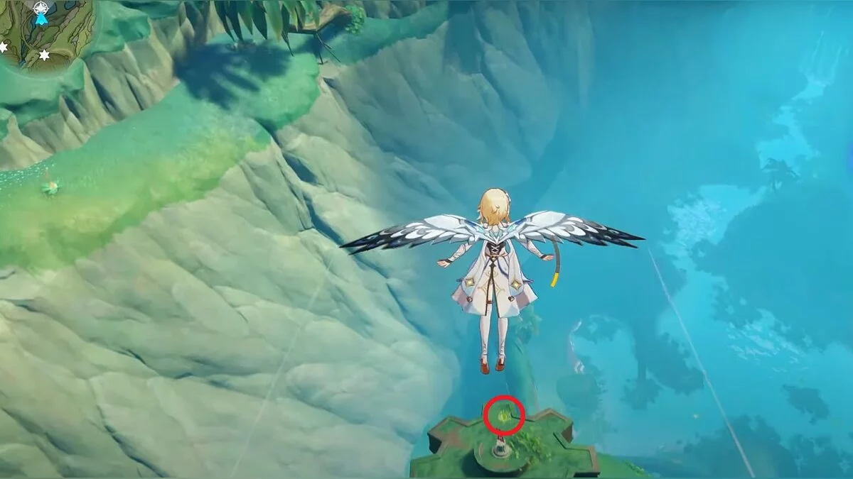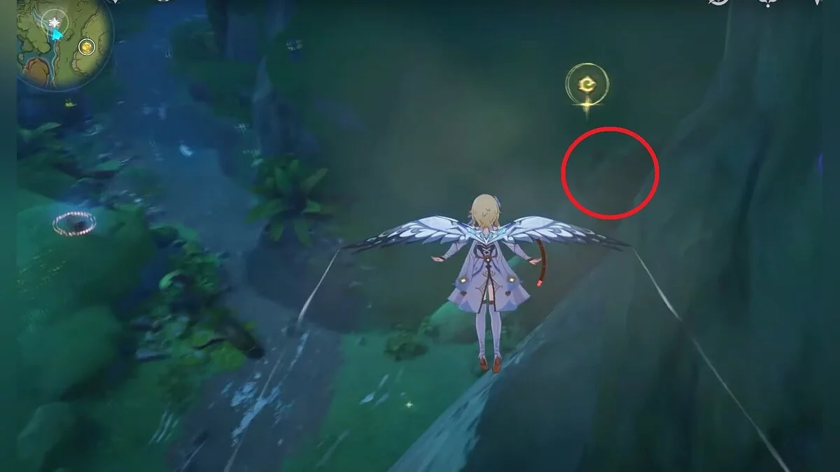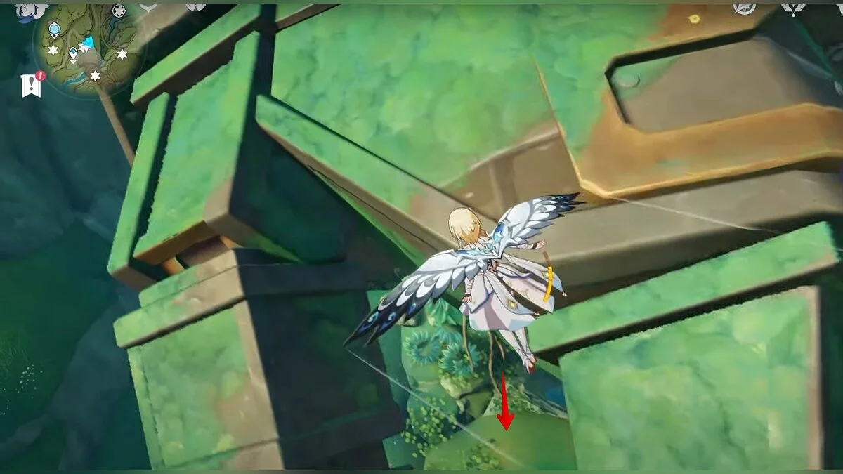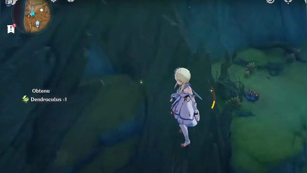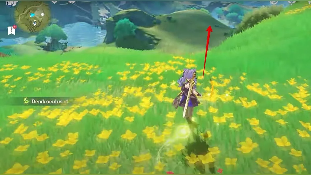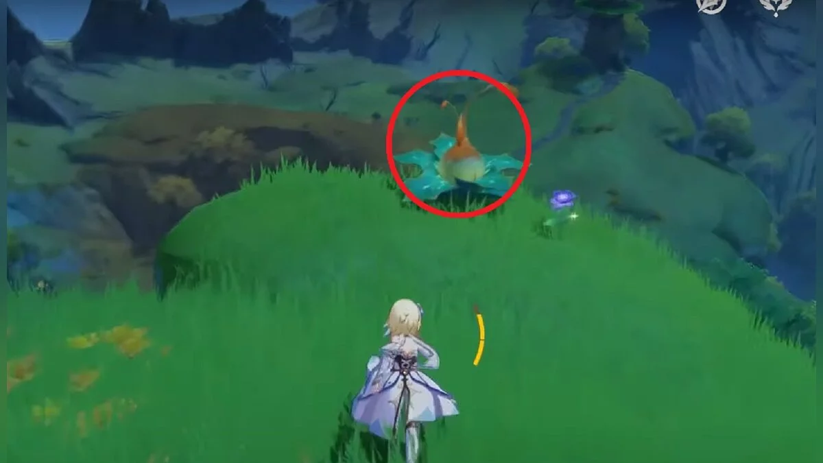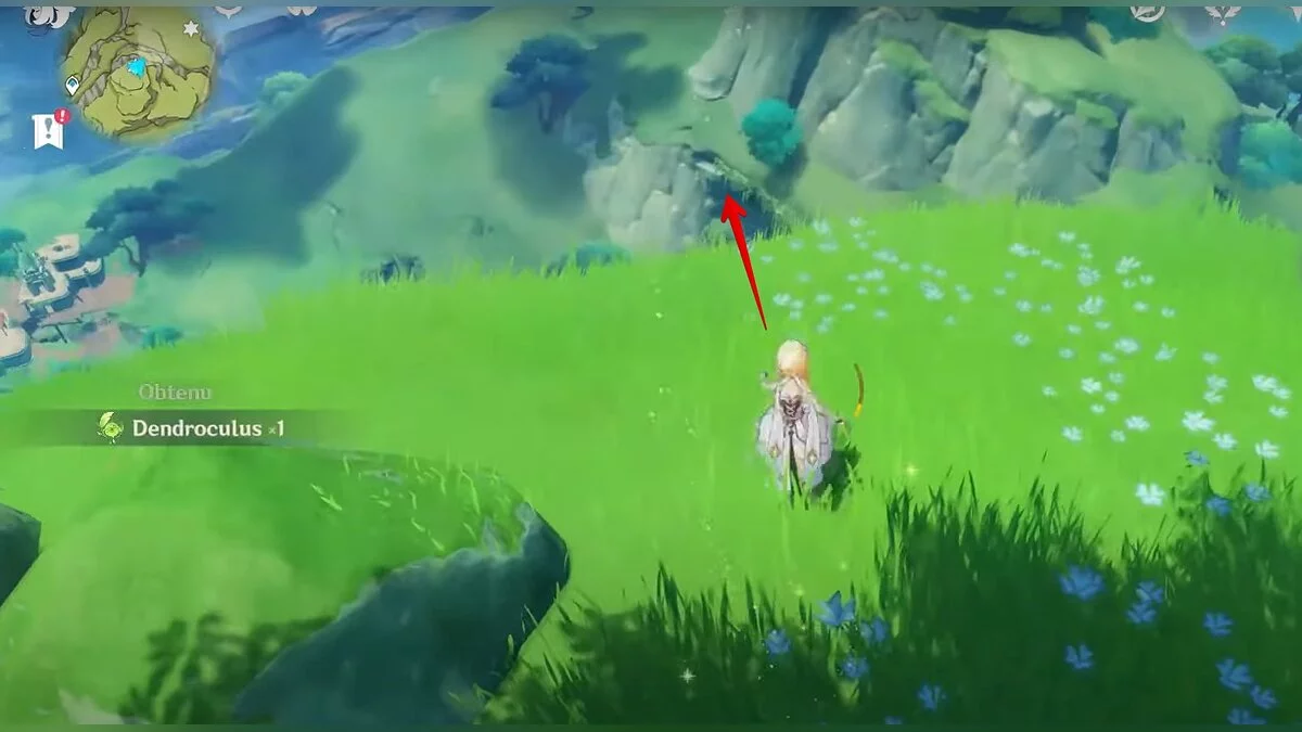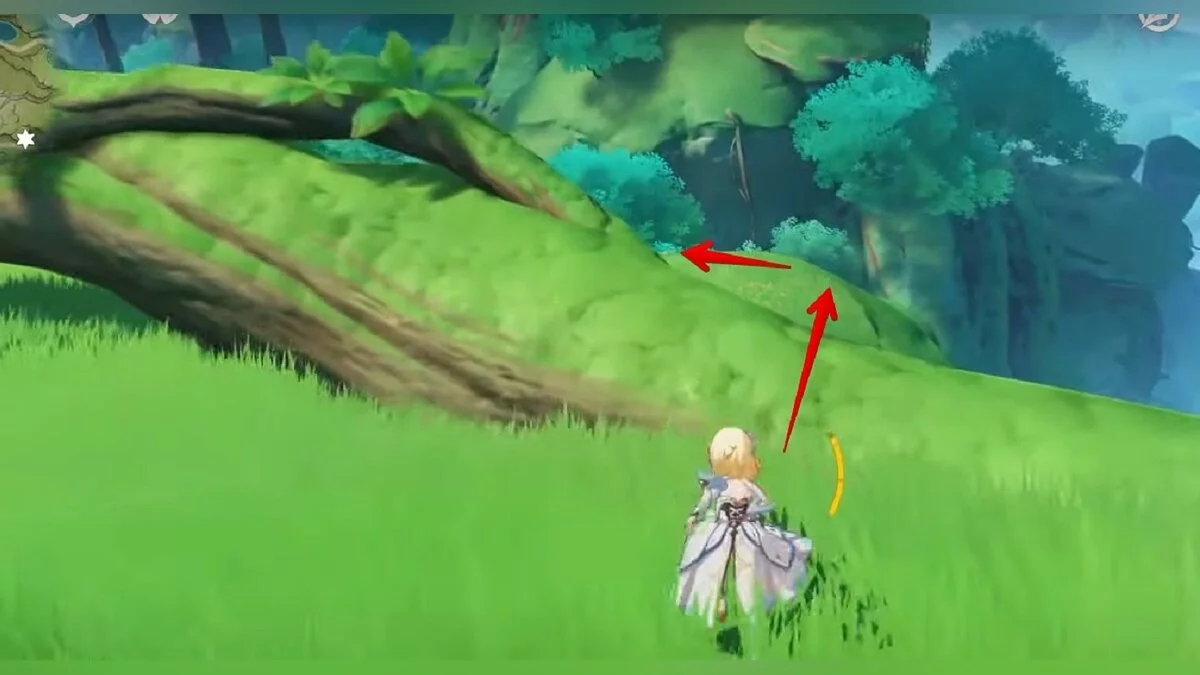 13-й дендрокул. От места, где вы подобрали предыдущий дендрокул, двигайтесь на север, а затем карабкайтесь по скалам на самый верх. Активируйте бутон стихией Дендро, чтобы вызвать четырёхлистный символ, за который можно зацепиться. Используйте его, чтобы подобрать дендрокул.