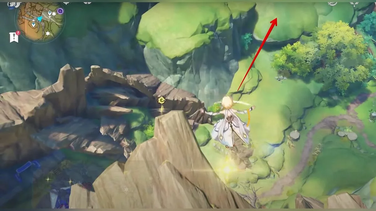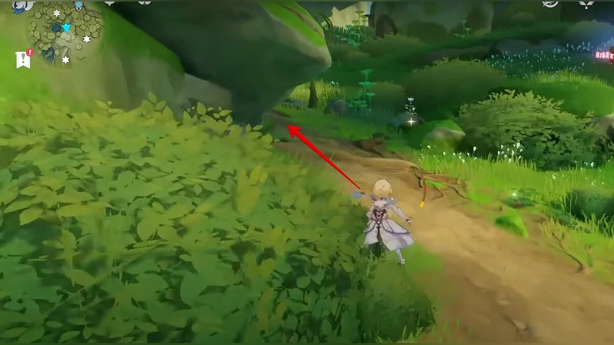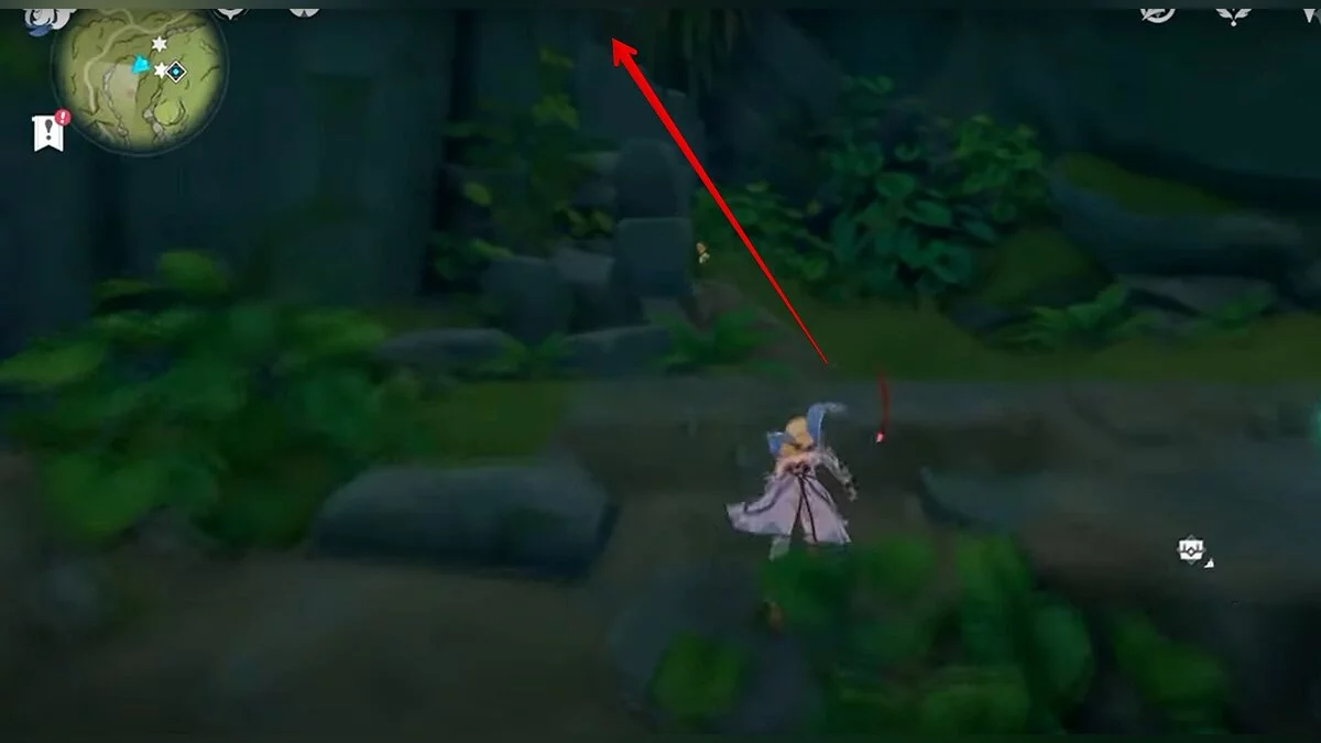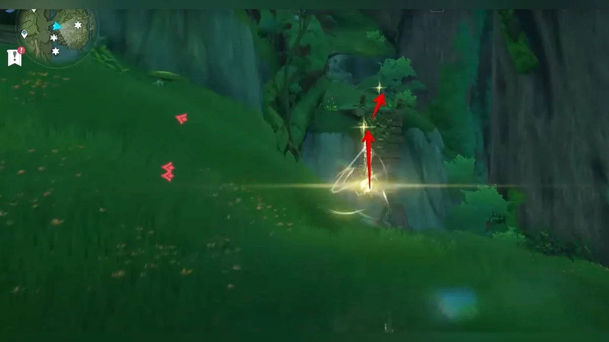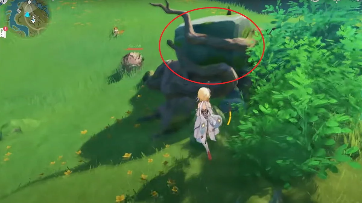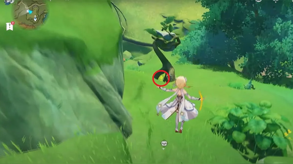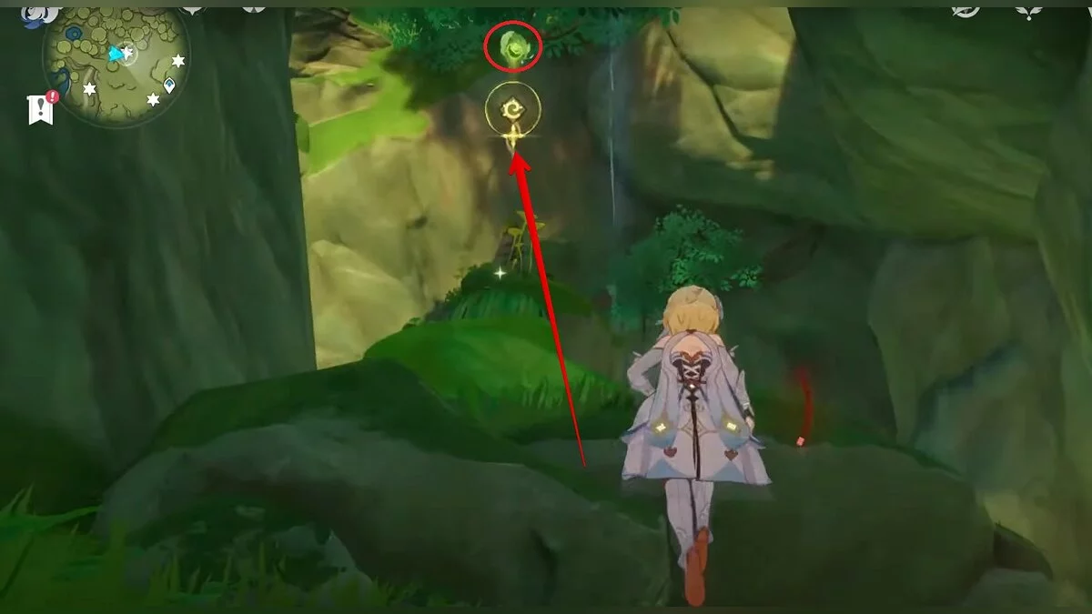 Бегите на север, пока не увидите камень, который можно поднять ударом Дендро-стихии. Он поднимется наверх, а вы сможете подобрать ресурс.