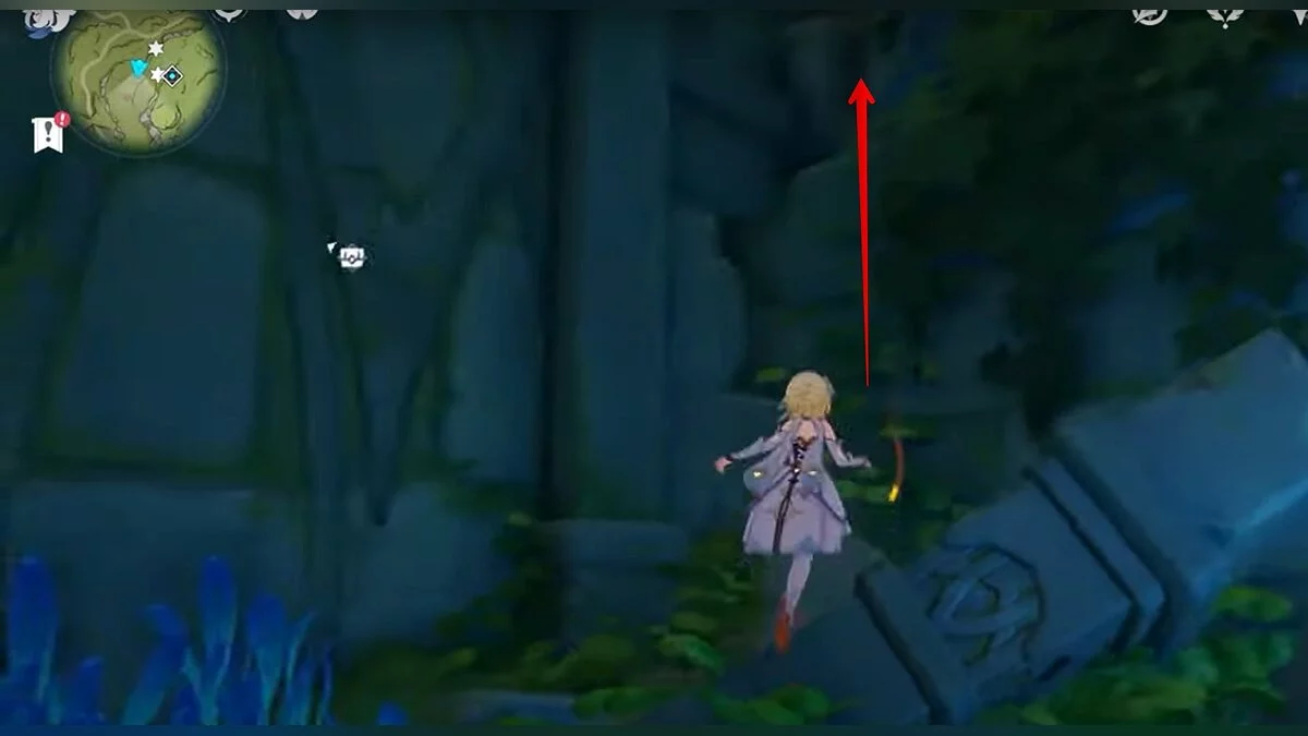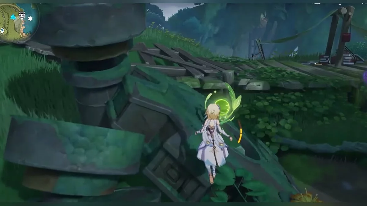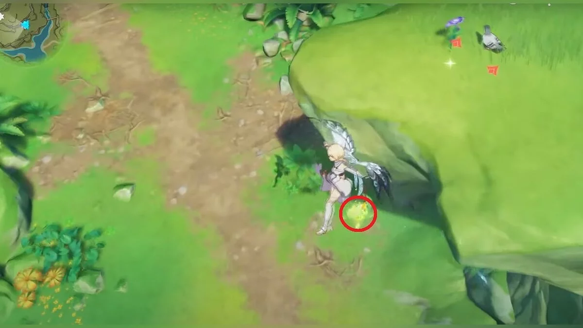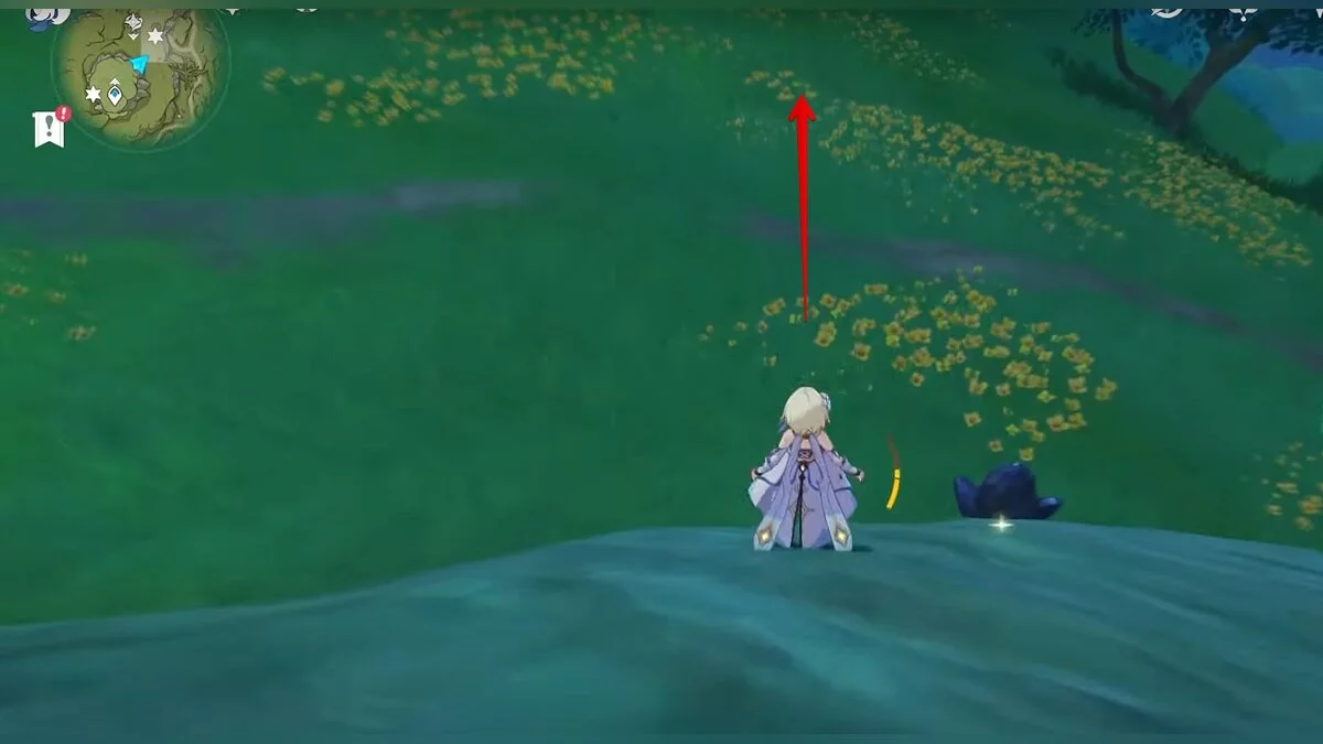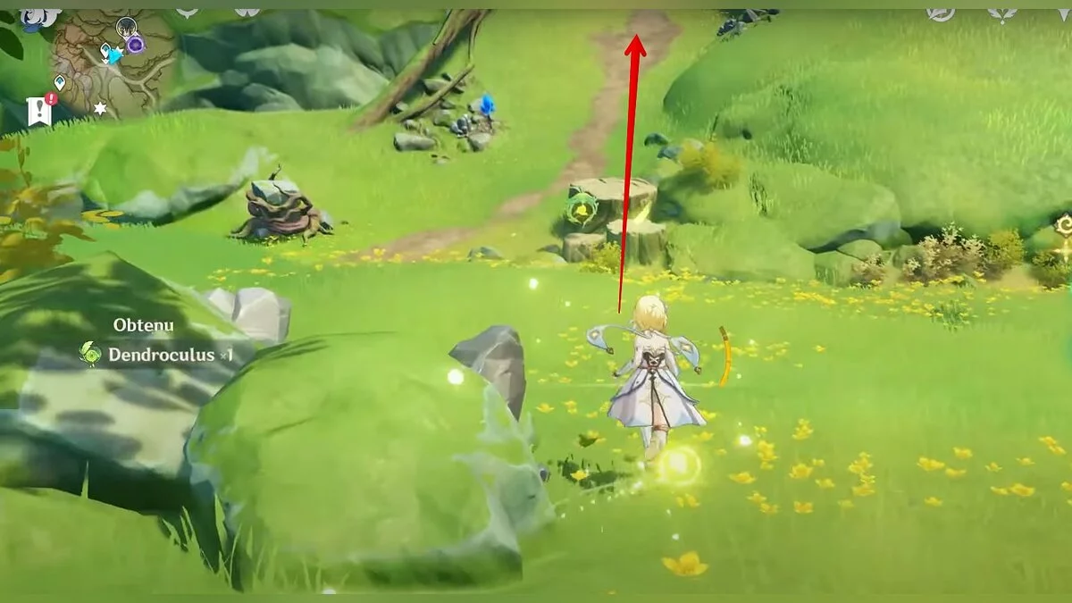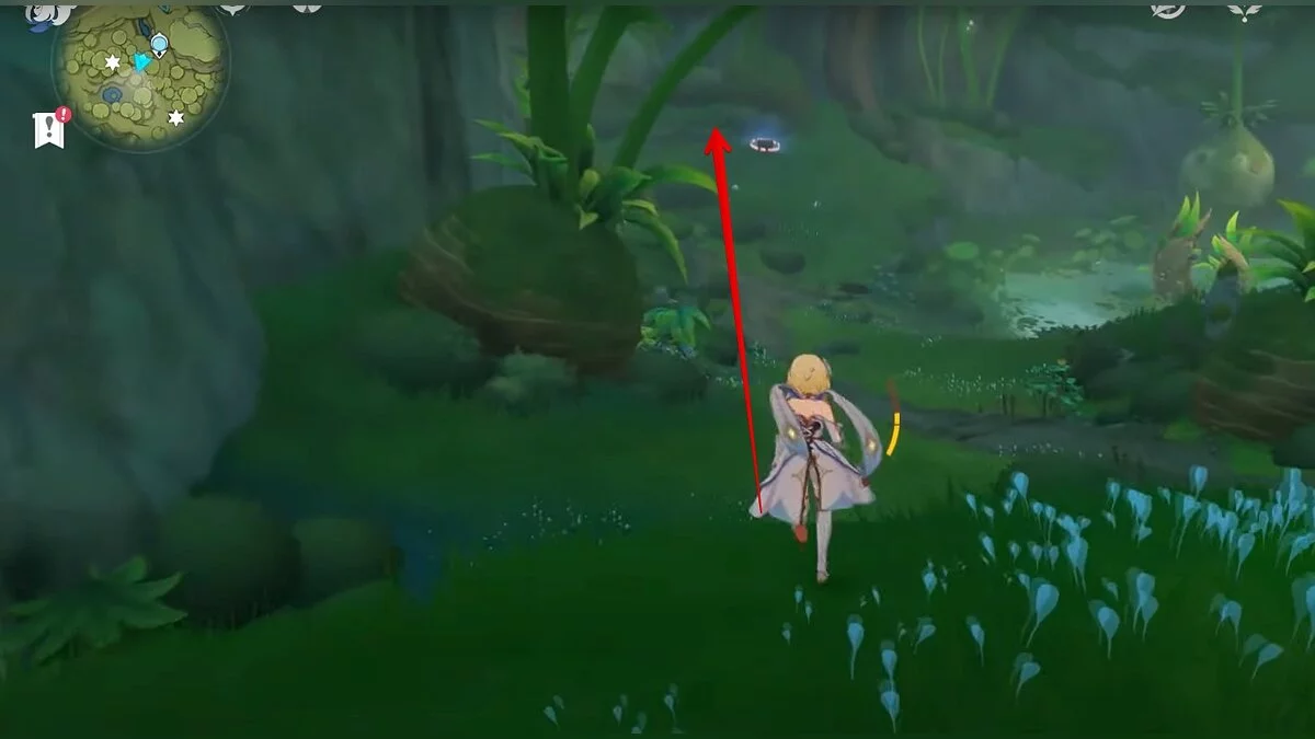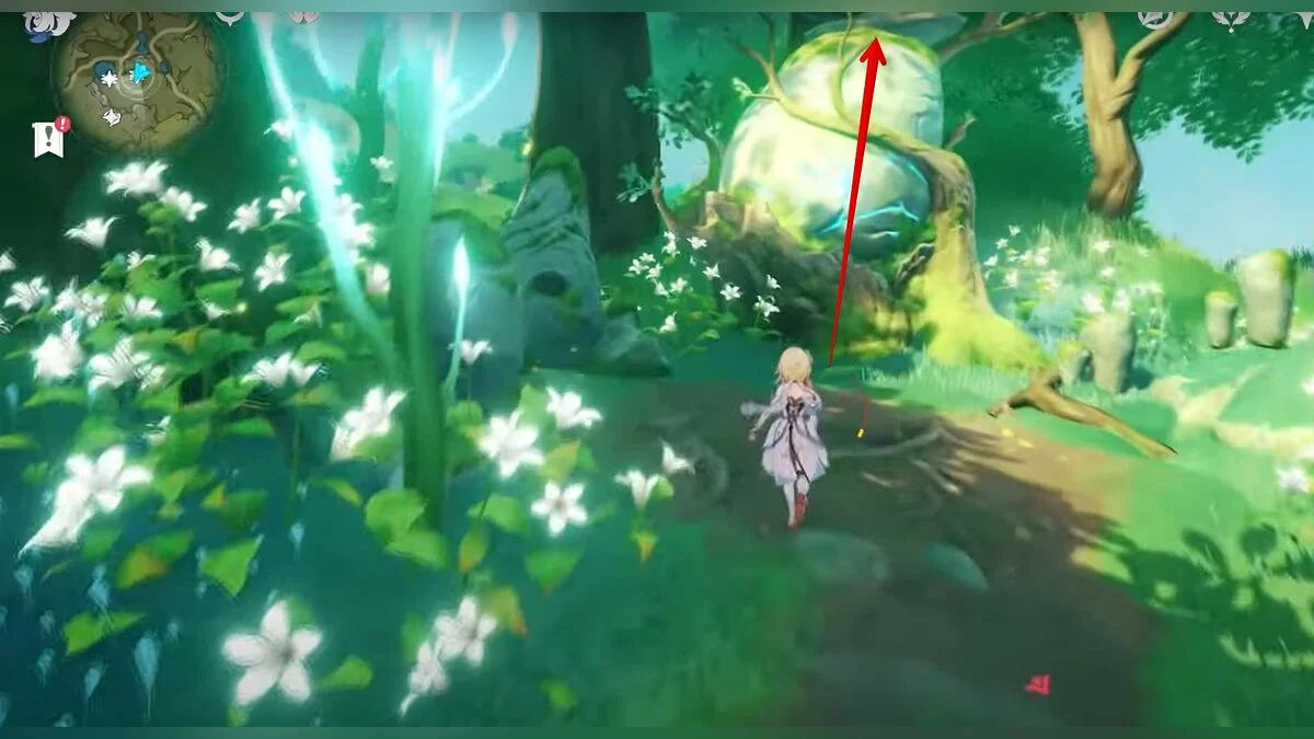 Бегите на север, пока не увидите камень, который можно поднять ударом Дендро-стихии. Он поднимется наверх, а вы сможете подобрать ресурс.