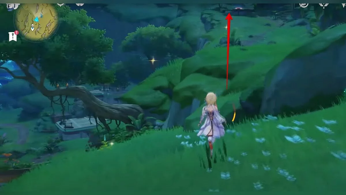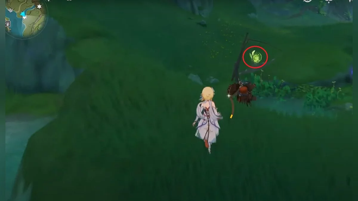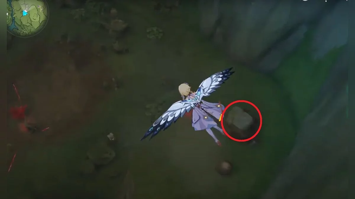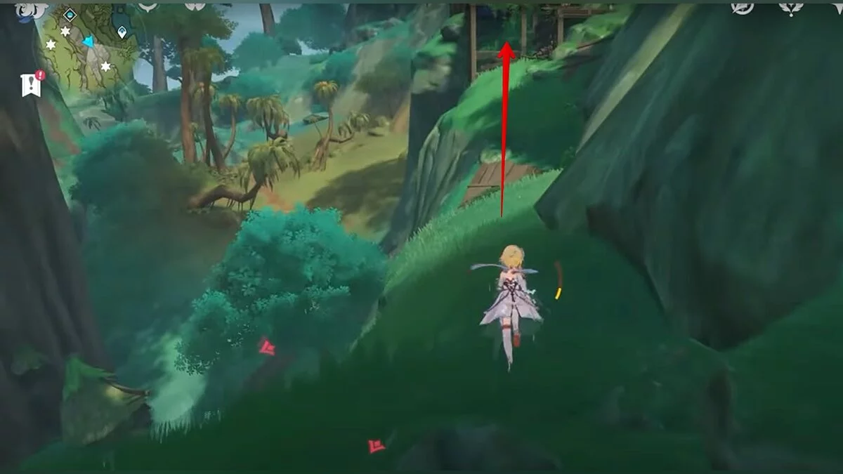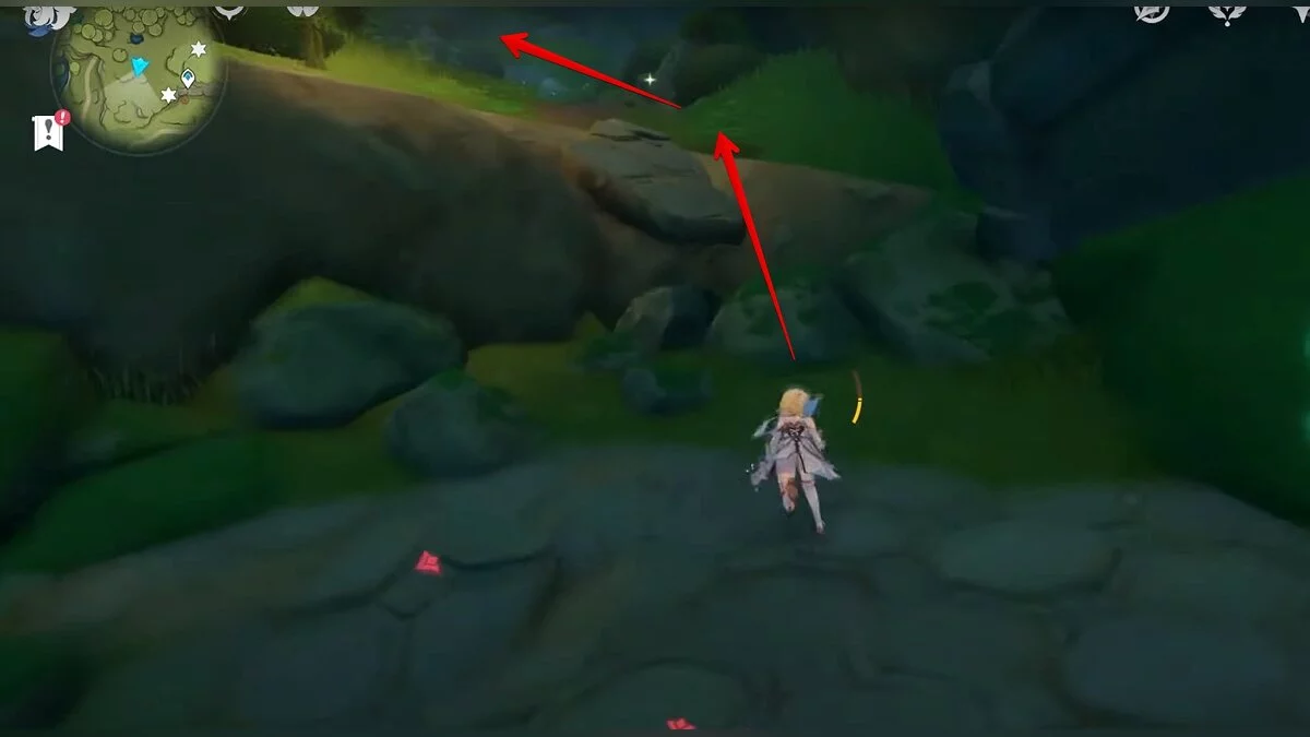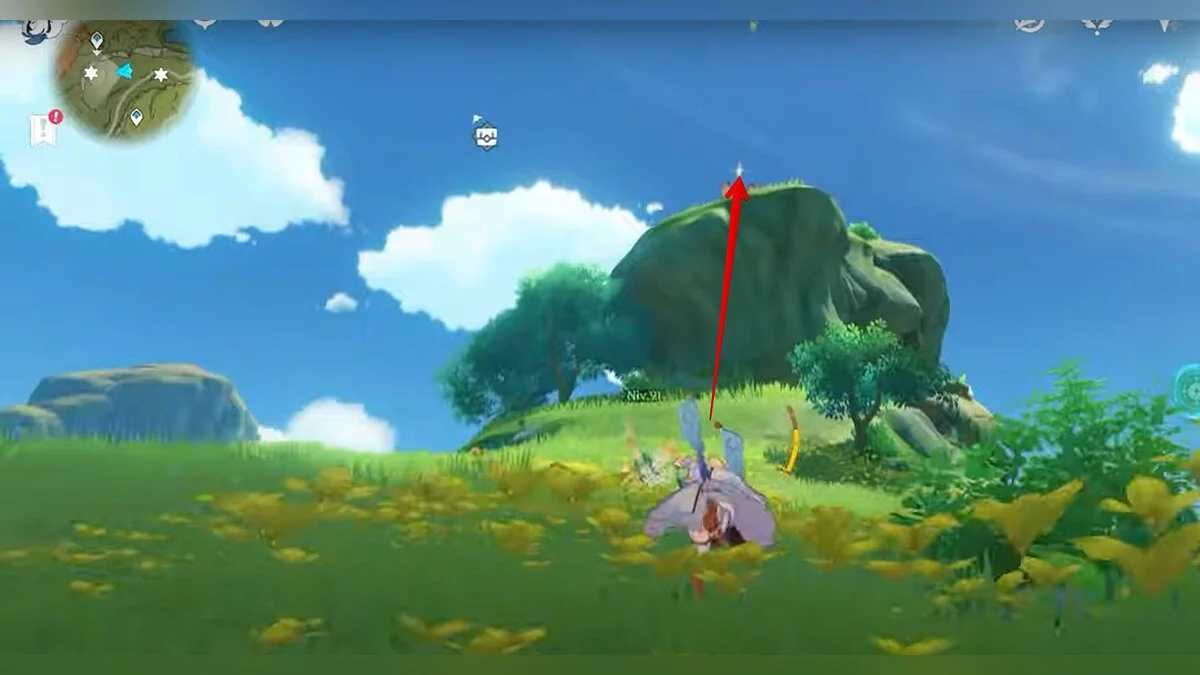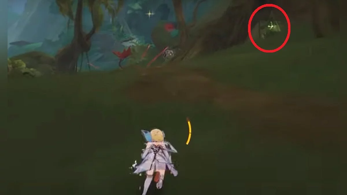 Бегите на север, пока не увидите камень, который можно поднять ударом Дендро-стихии. Он поднимется наверх, а вы сможете подобрать ресурс.