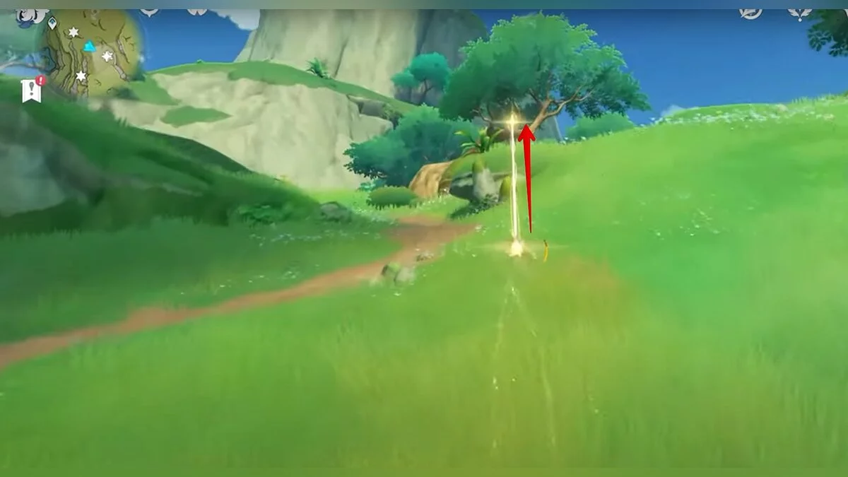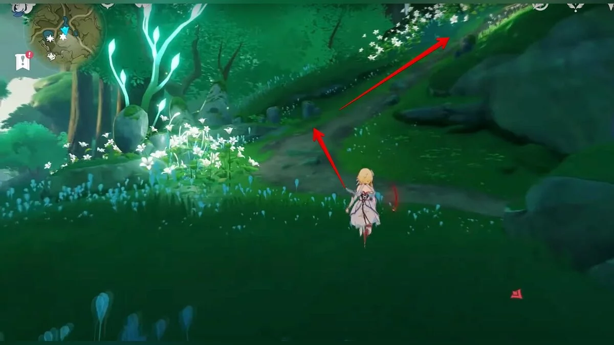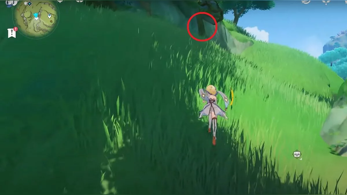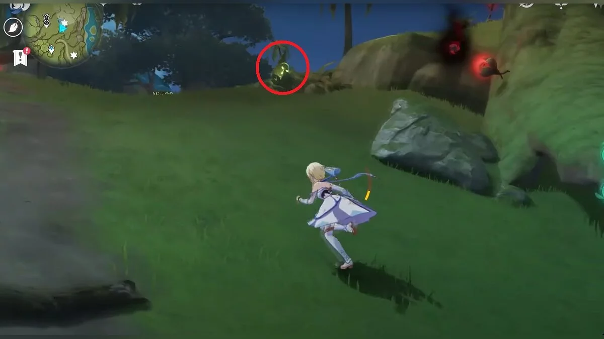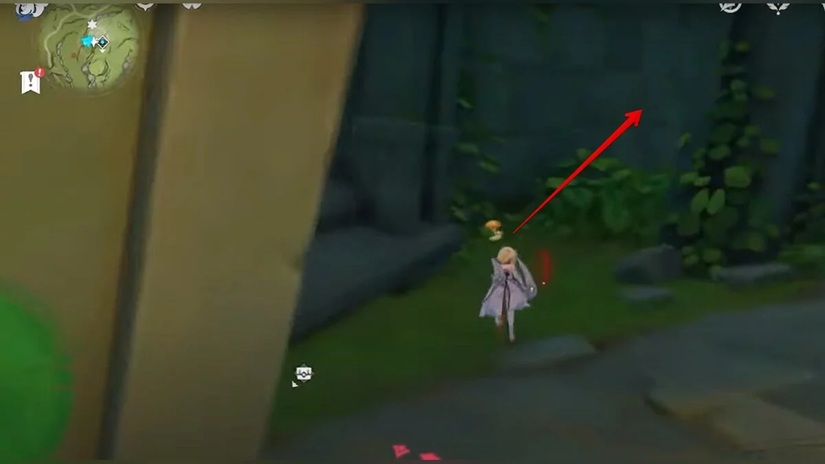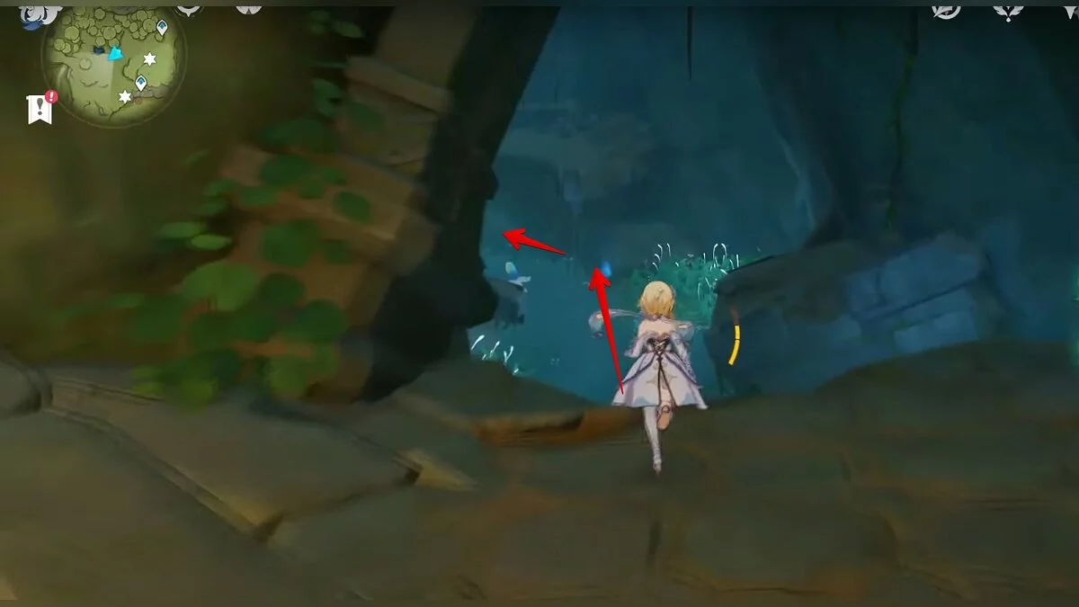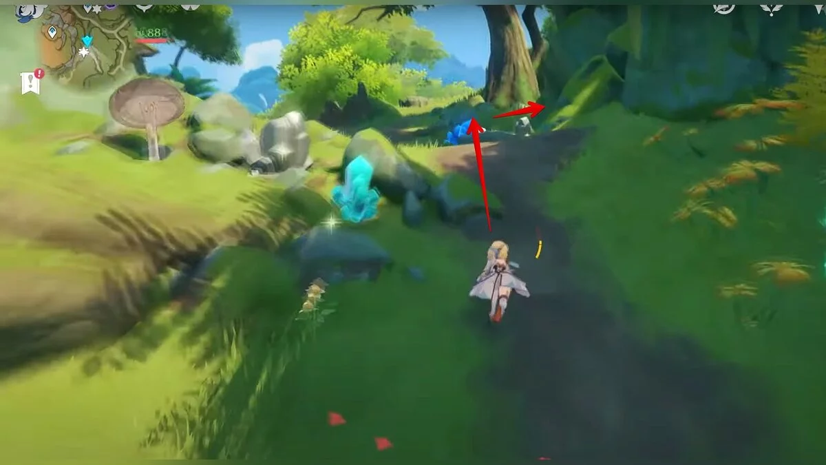 Бегите на север, пока не увидите камень, который можно поднять ударом Дендро-стихии. Он поднимется наверх, а вы сможете подобрать ресурс.