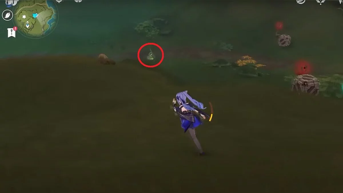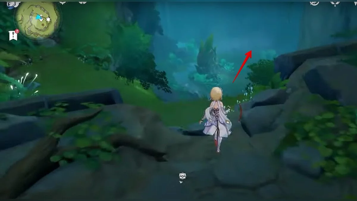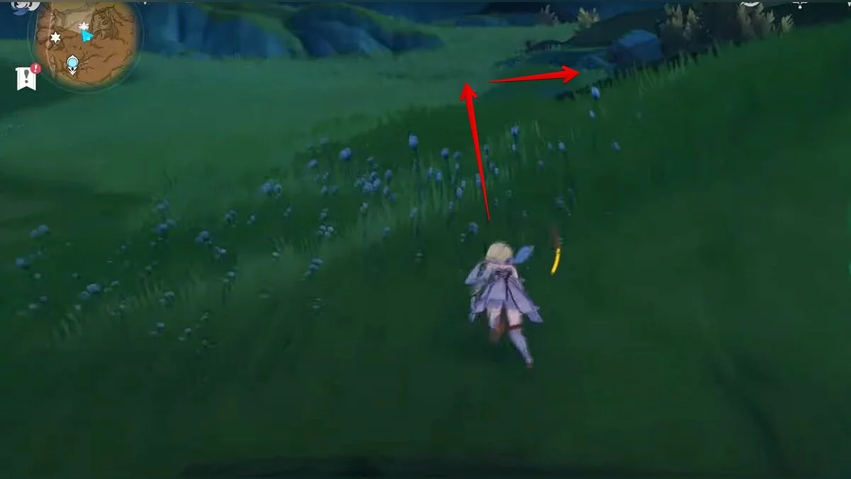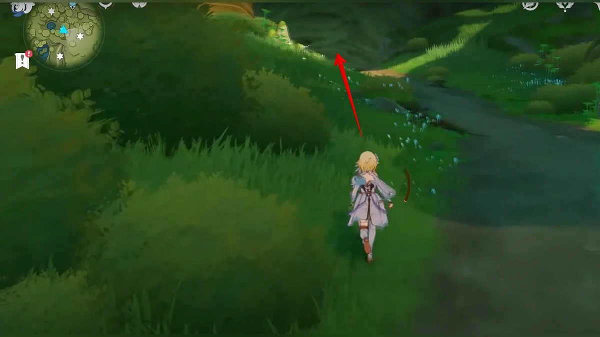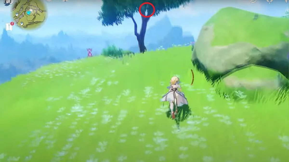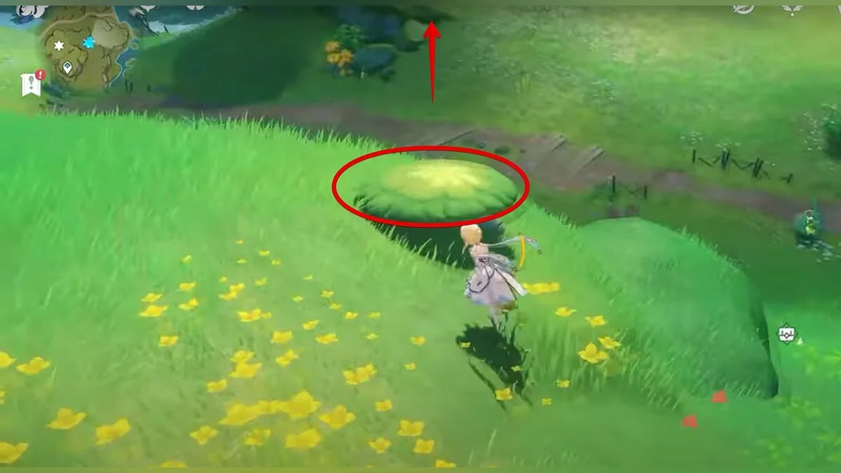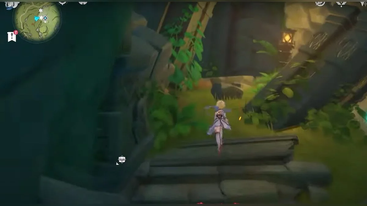 Бегите на север, пока не увидите камень, который можно поднять ударом Дендро-стихии. Он поднимется наверх, а вы сможете подобрать ресурс.