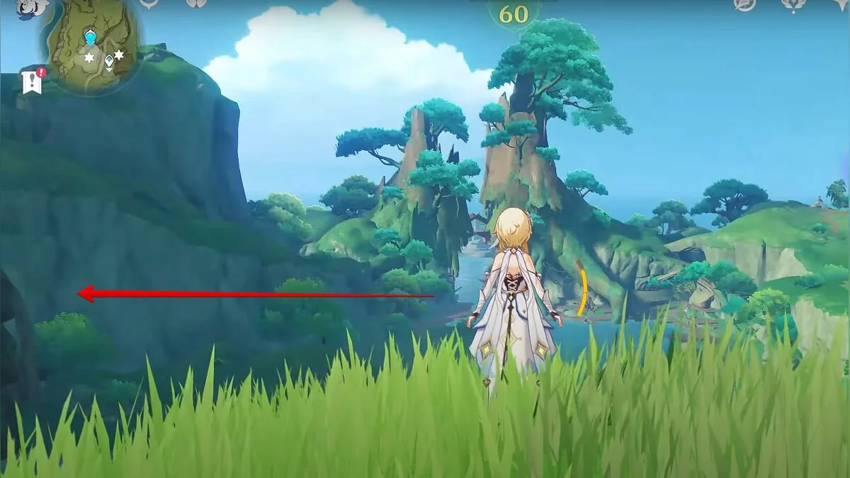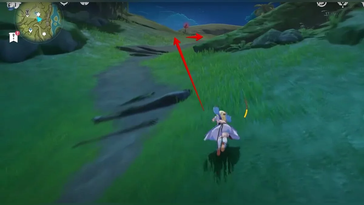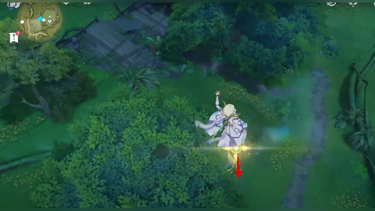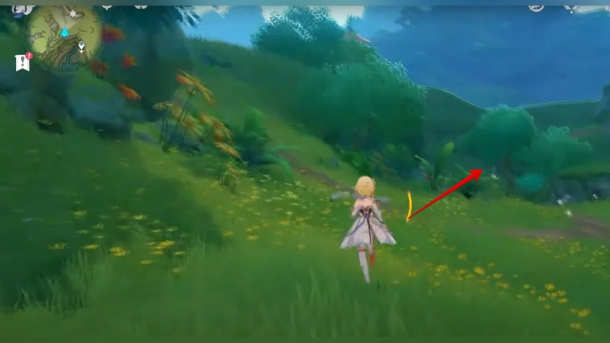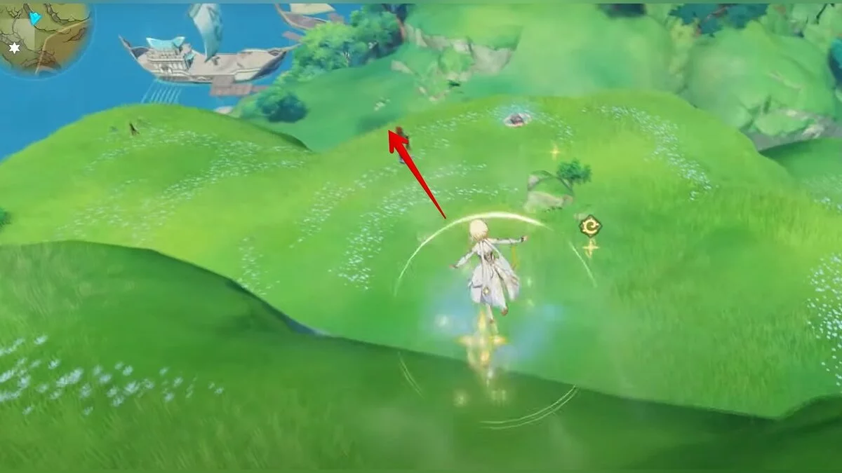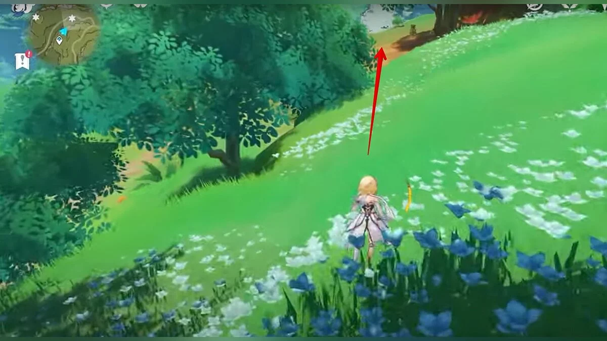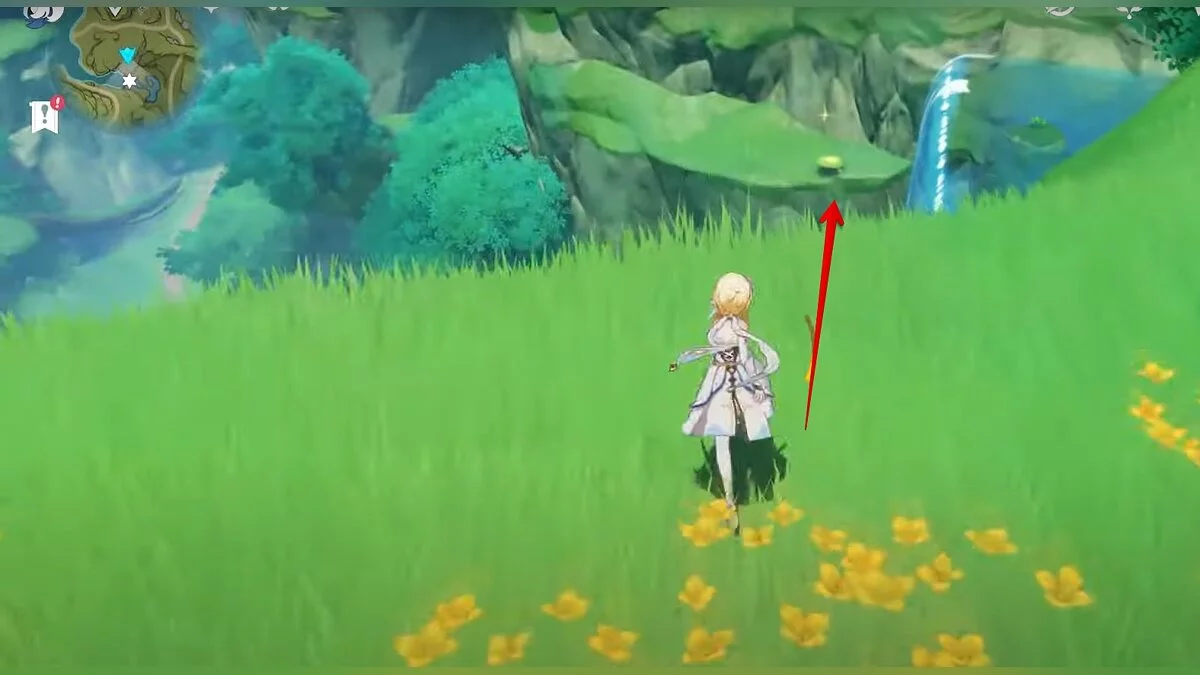 Бегите на север, пока не увидите камень, который можно поднять ударом Дендро-стихии. Он поднимется наверх, а вы сможете подобрать ресурс.