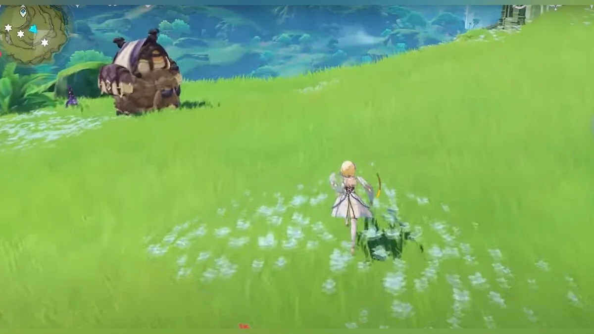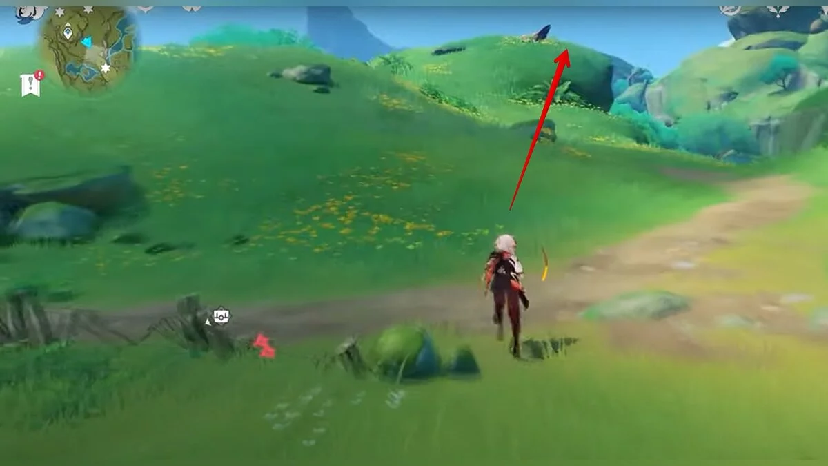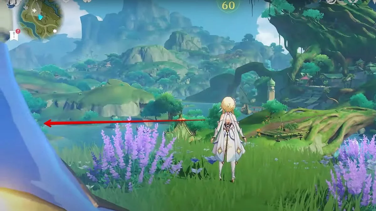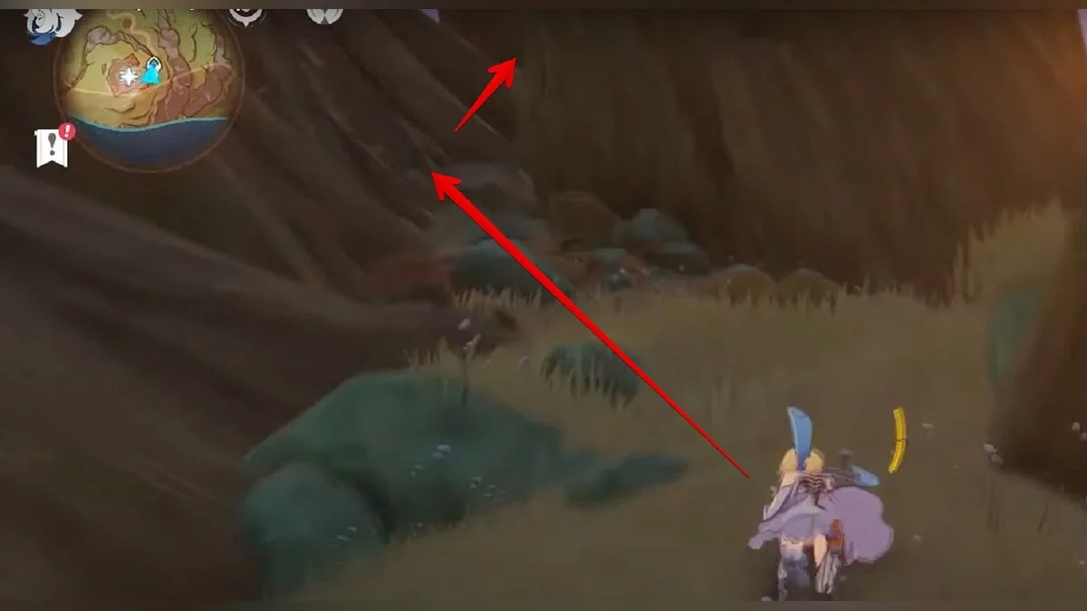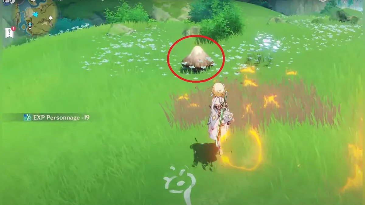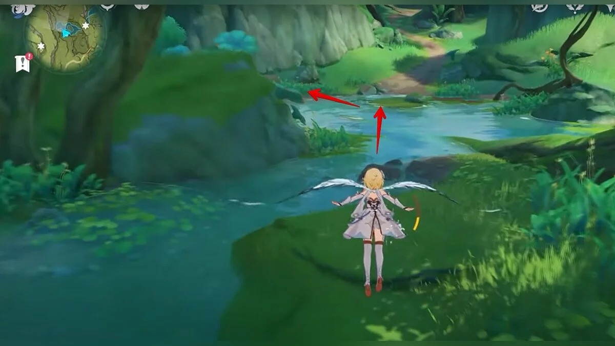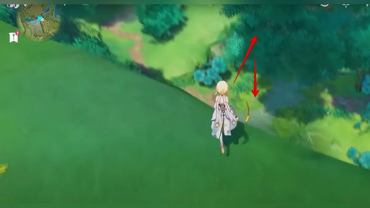Бегите на север, пока не увидите камень, который можно поднять ударом Дендро-стихии. Он поднимется наверх, а вы сможете подобрать ресурс.
