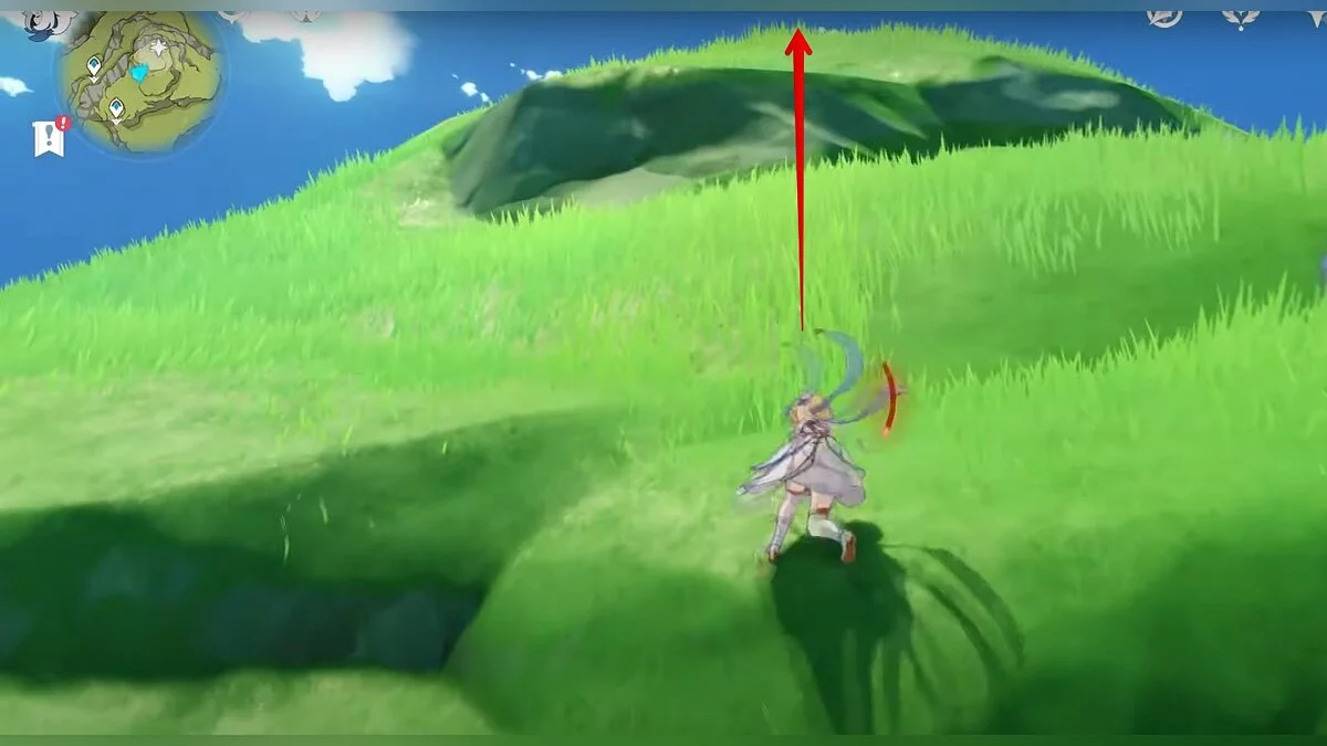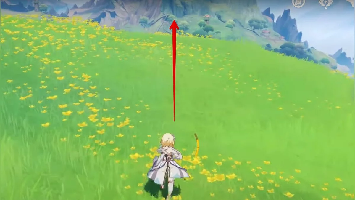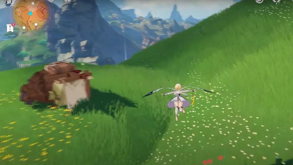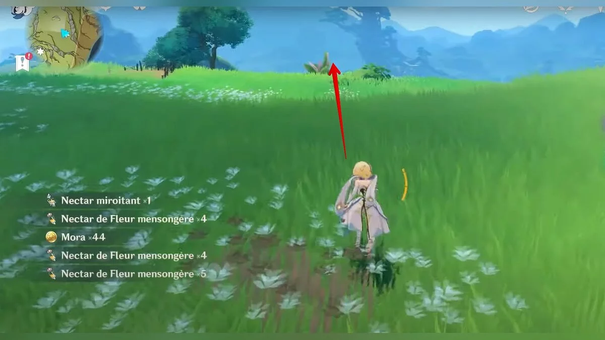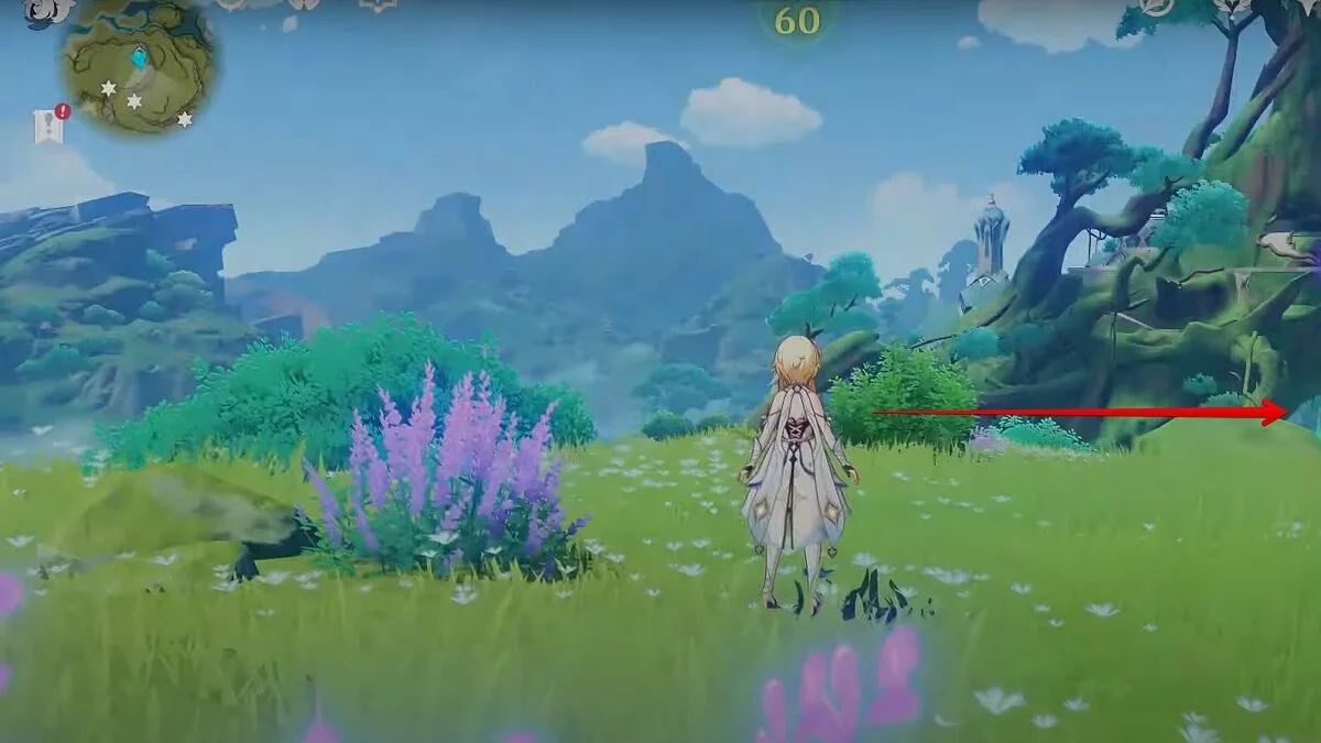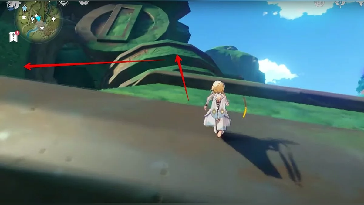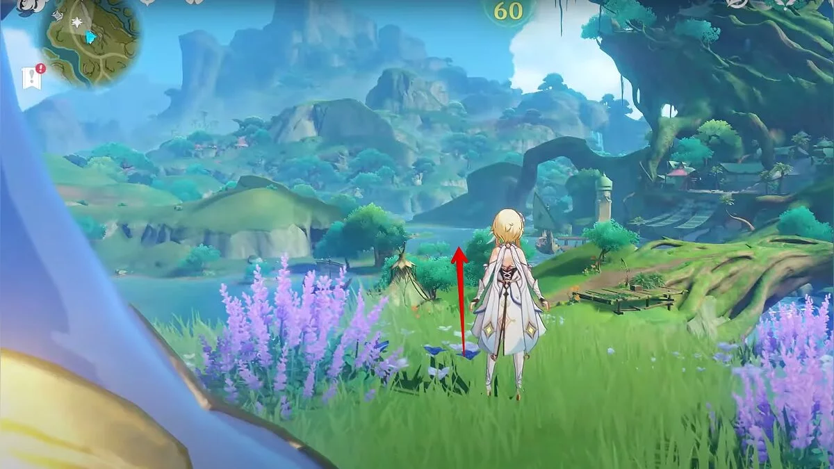 Бегите на север, пока не увидите камень, который можно поднять ударом Дендро-стихии. Он поднимется наверх, а вы сможете подобрать ресурс.