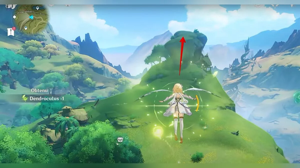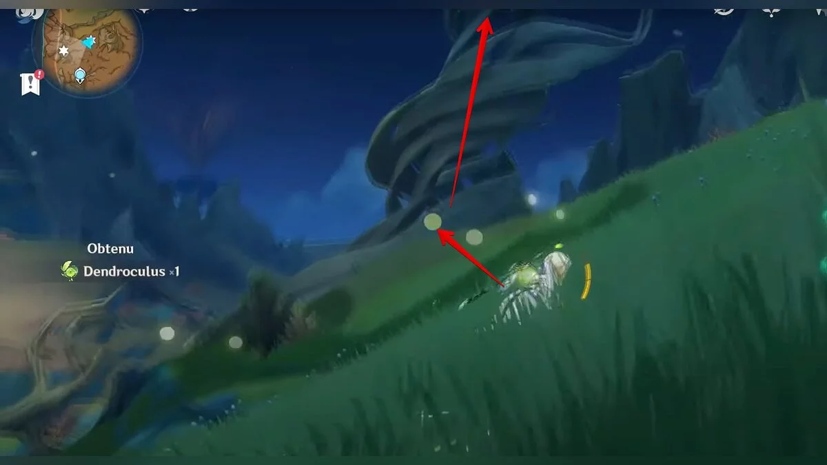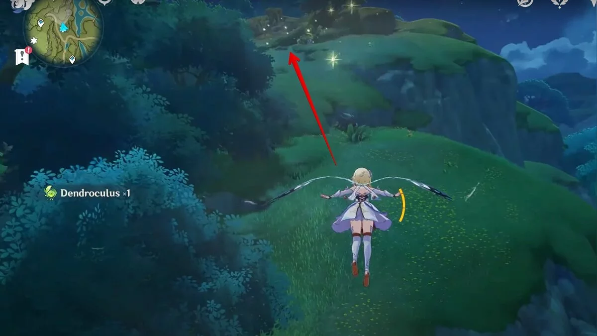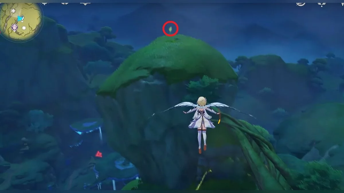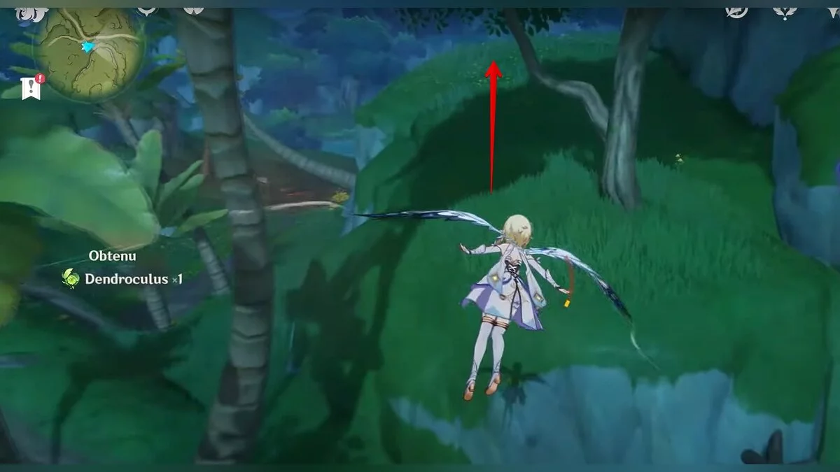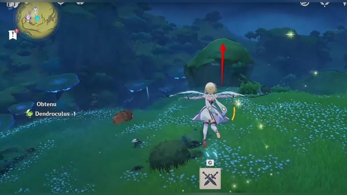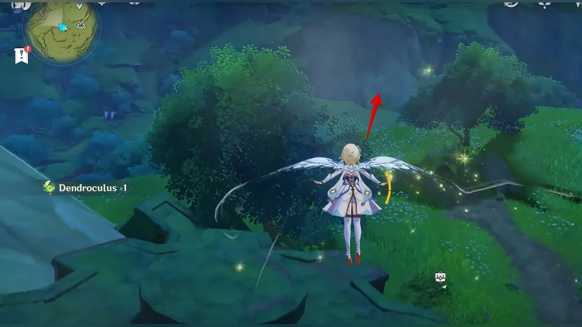 Бегите на восток, поднимайтесь на возвышенность и взаимодействуйте со светлячком, чтобы взлететь повыше. Слева от него парит дендрокул.