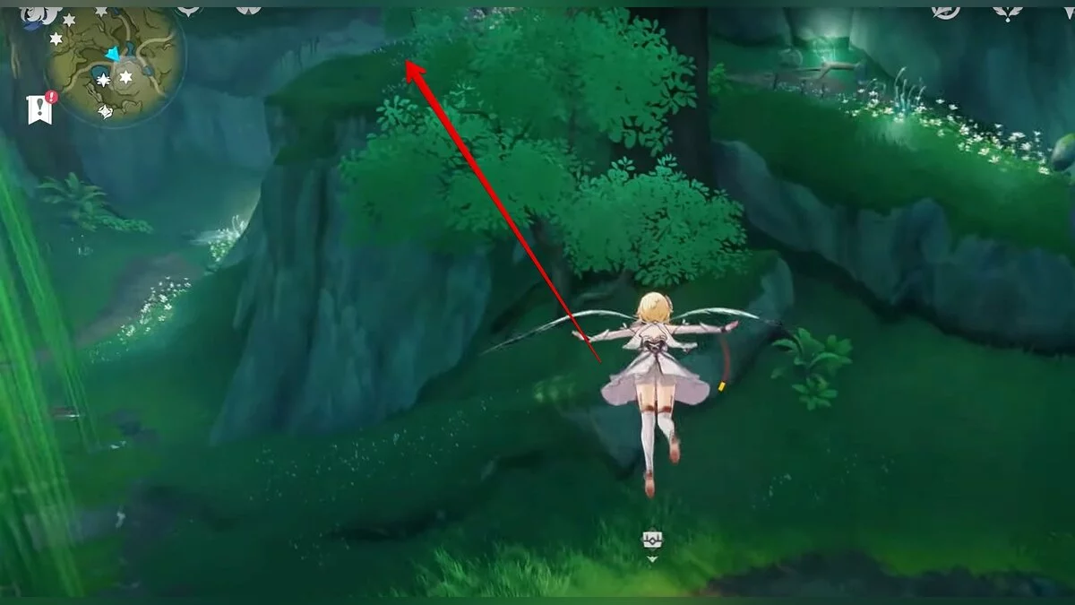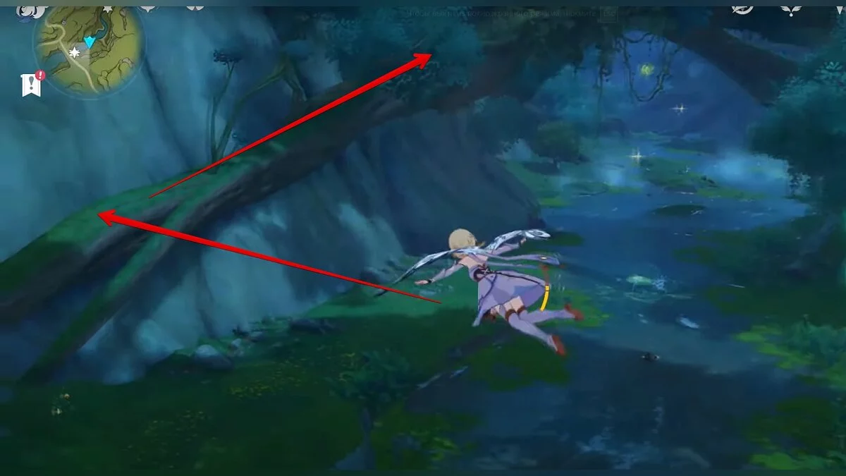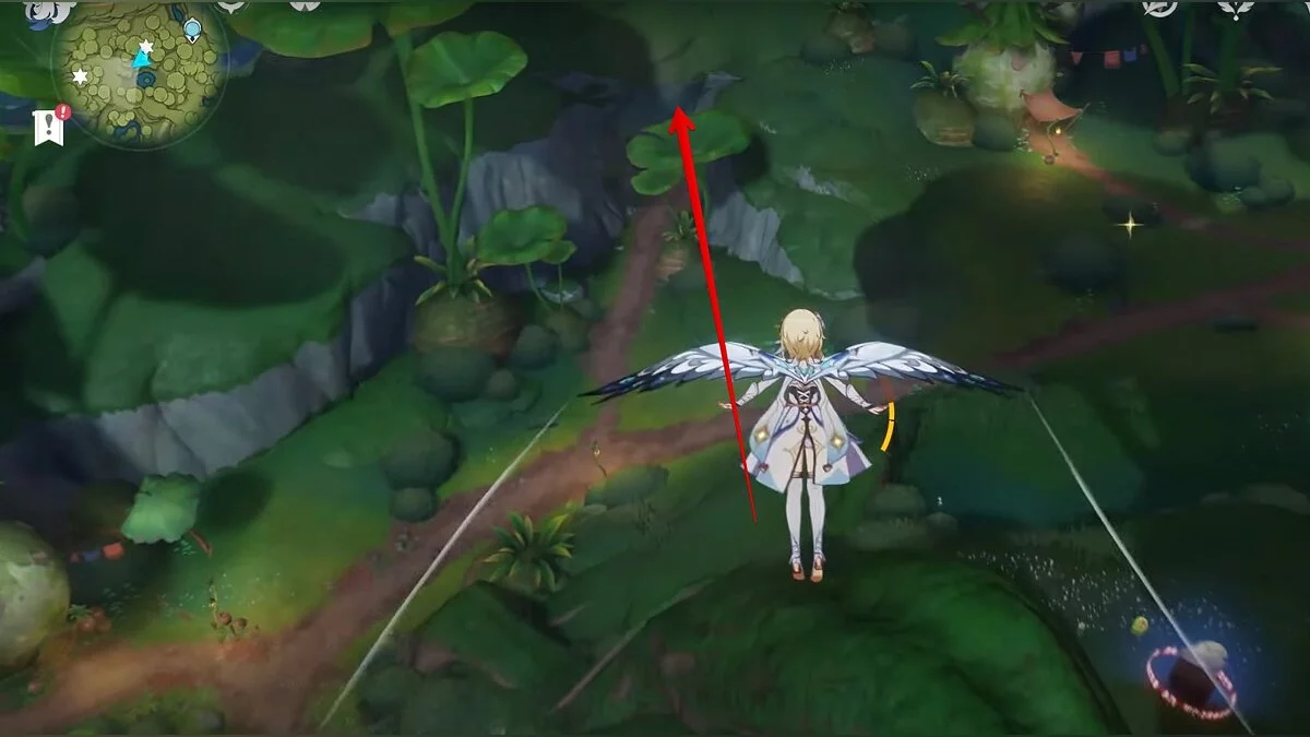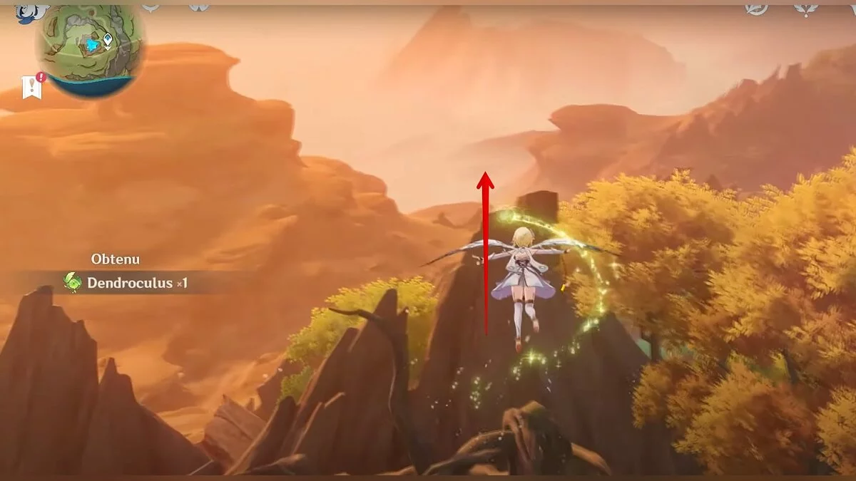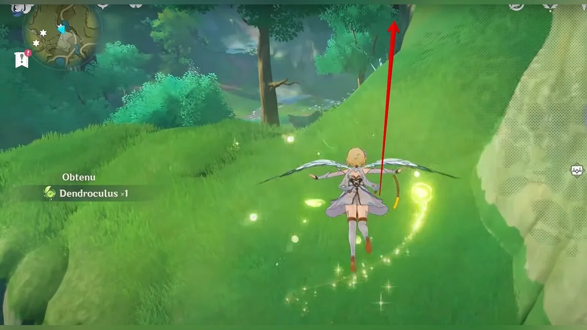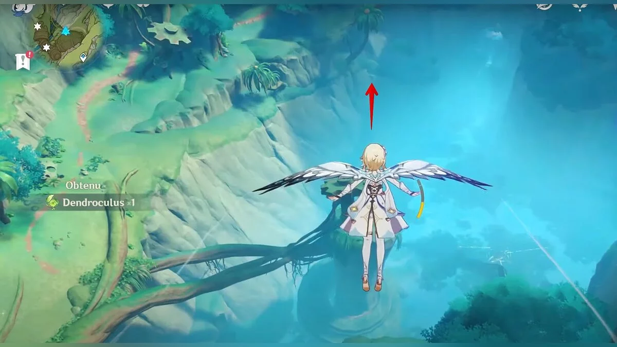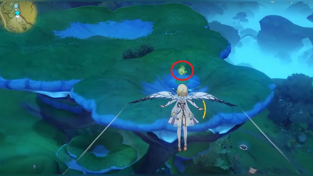 Бегите на восток, поднимайтесь на возвышенность и взаимодействуйте со светлячком, чтобы взлететь повыше. Слева от него парит дендрокул.