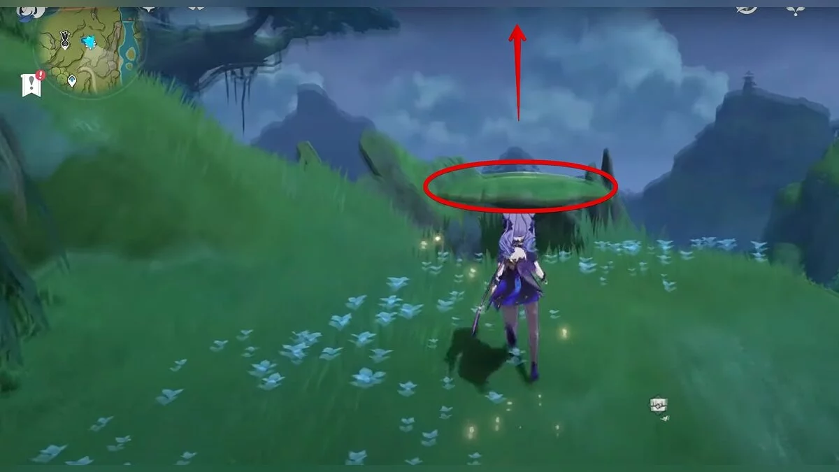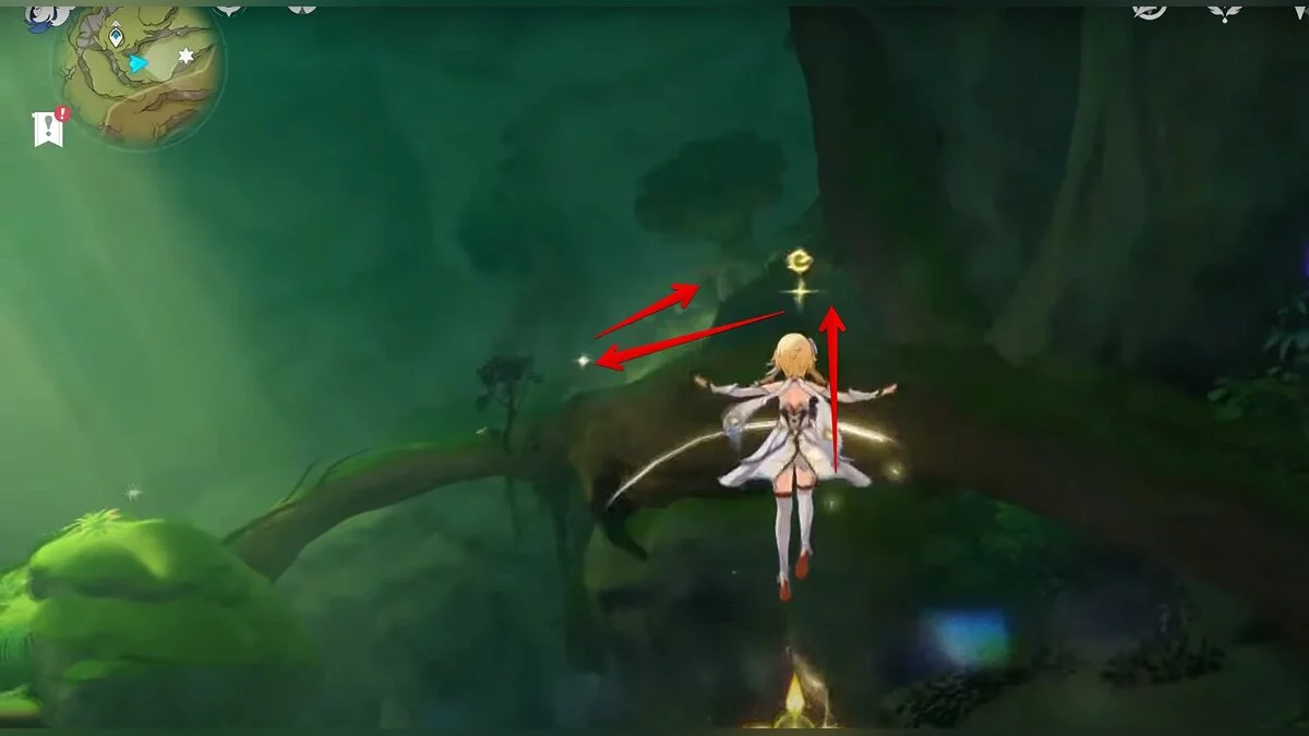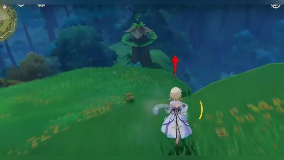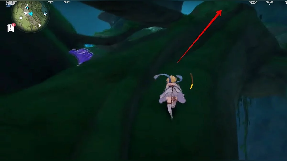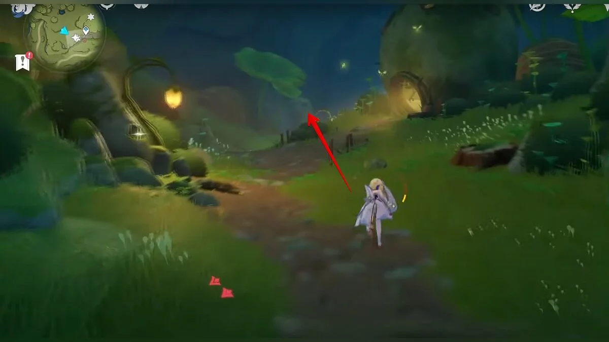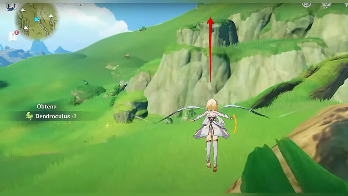 Бегите на восток, поднимайтесь на возвышенность и взаимодействуйте со светлячком, чтобы взлететь повыше. Слева от него парит дендрокул.