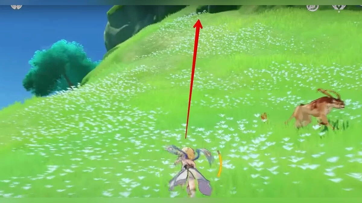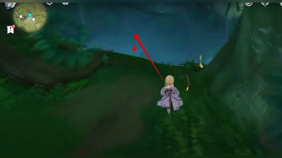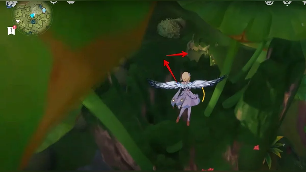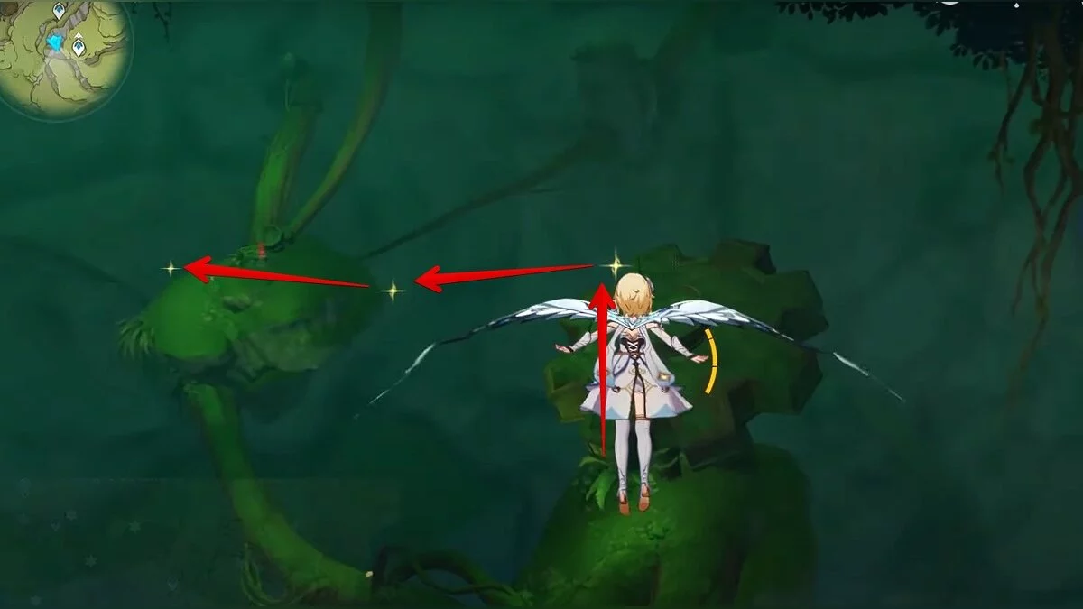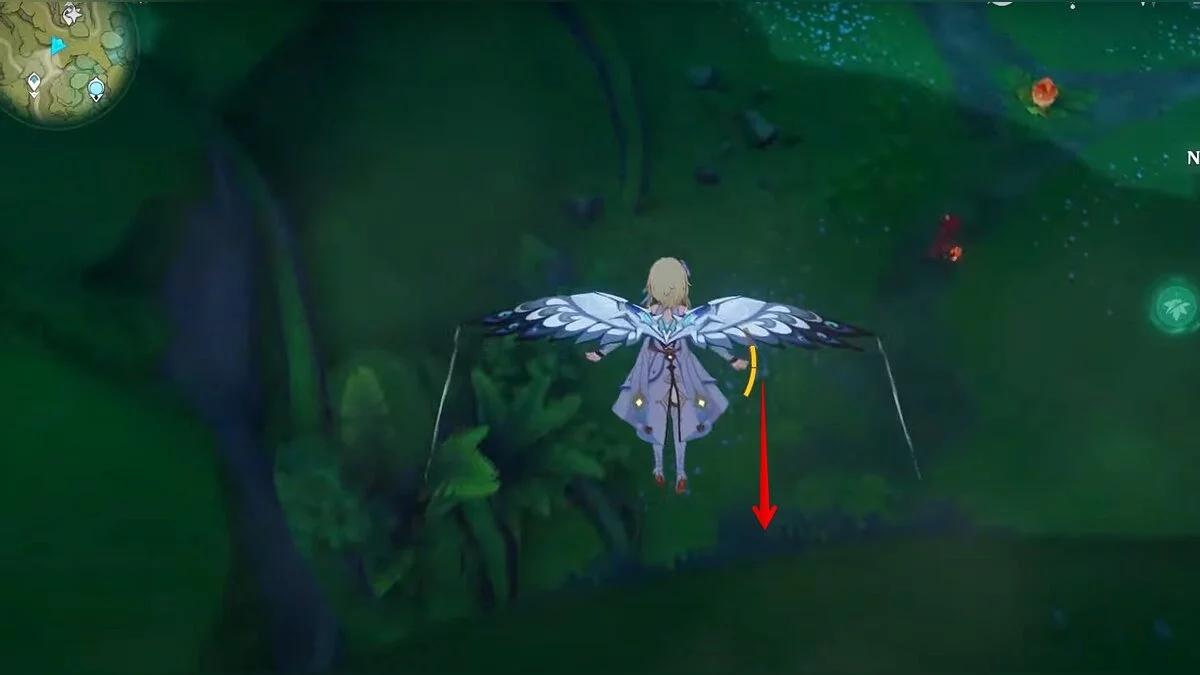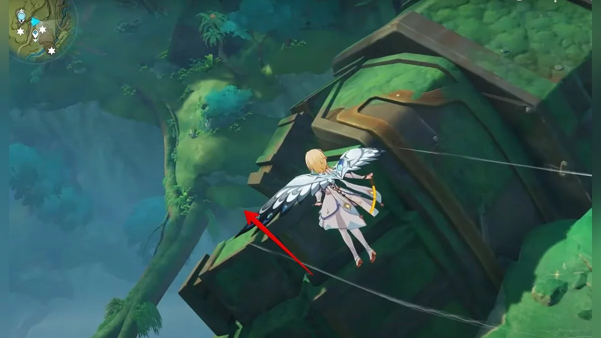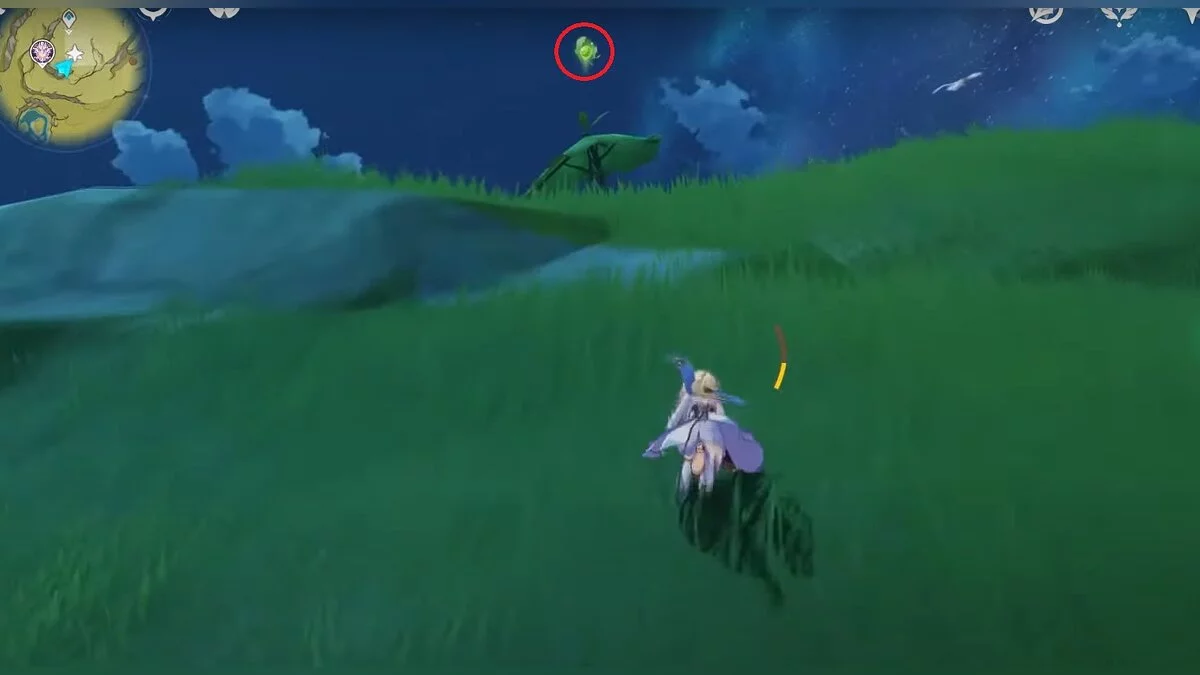 Бегите на восток, поднимайтесь на возвышенность и взаимодействуйте со светлячком, чтобы взлететь повыше. Слева от него парит дендрокул.