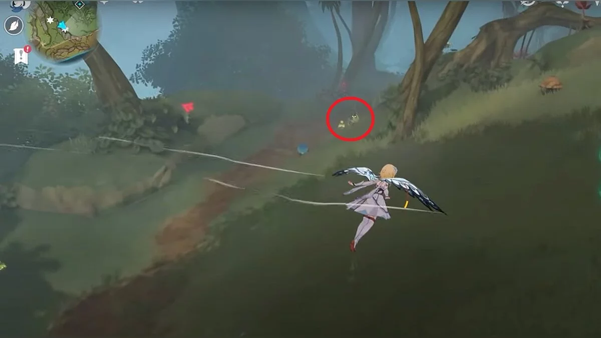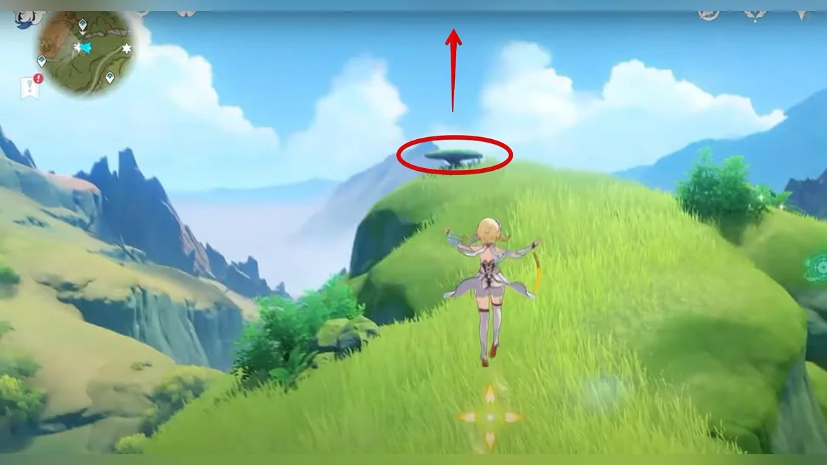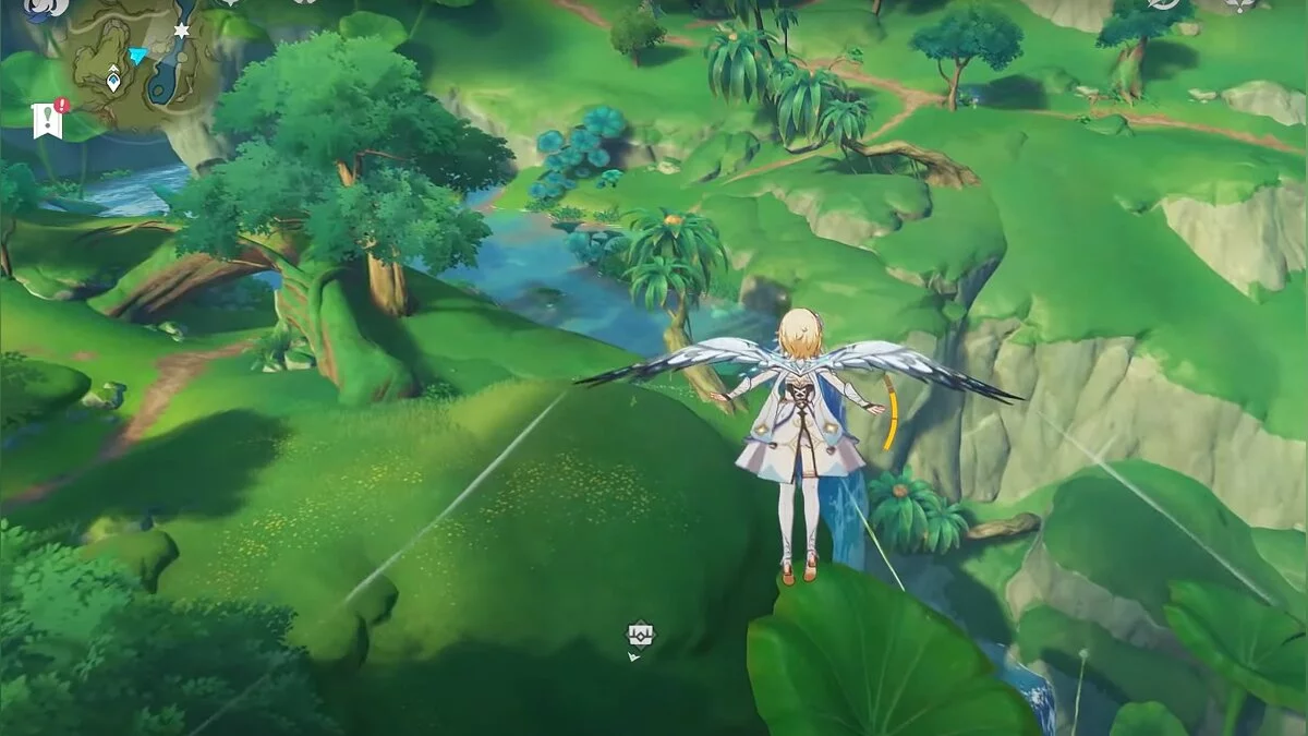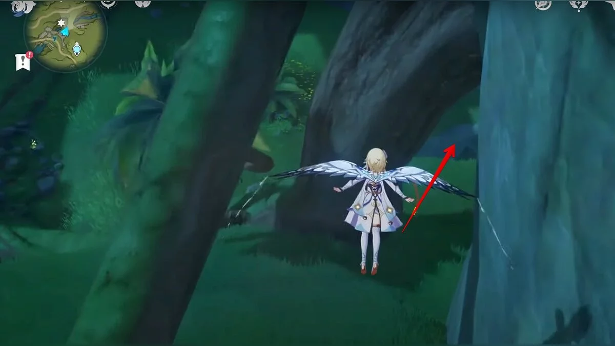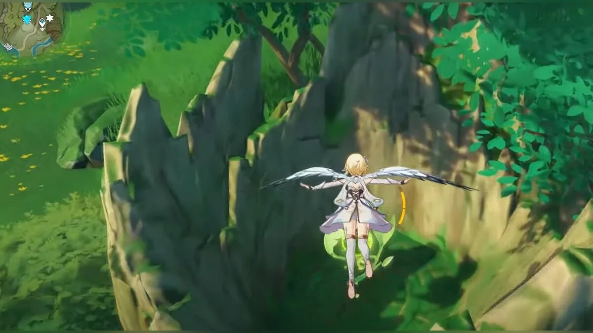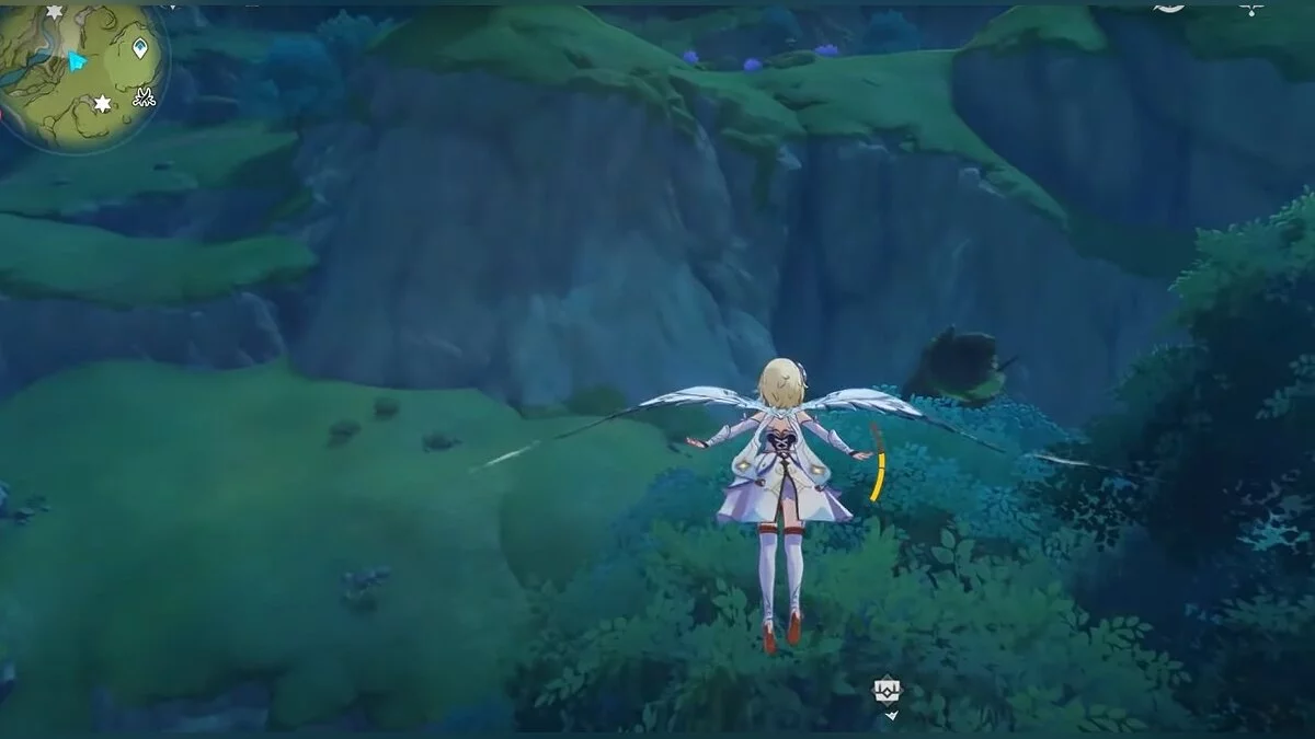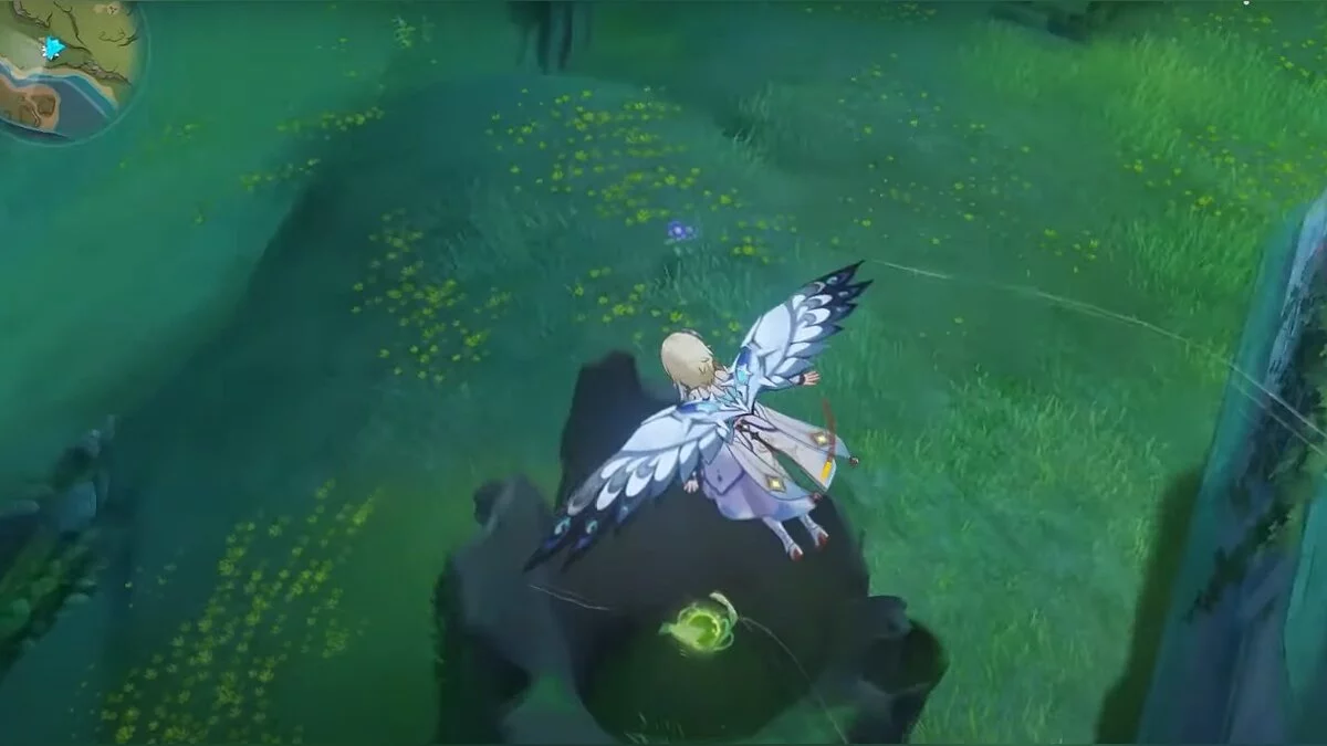 Бегите на восток, поднимайтесь на возвышенность и взаимодействуйте со светлячком, чтобы взлететь повыше. Слева от него парит дендрокул.