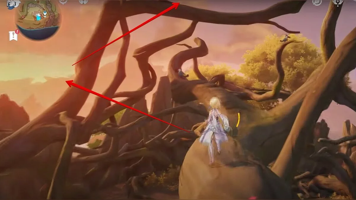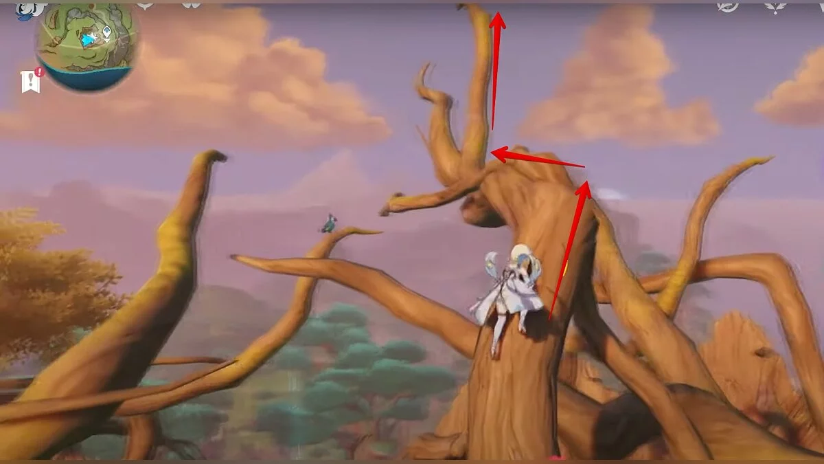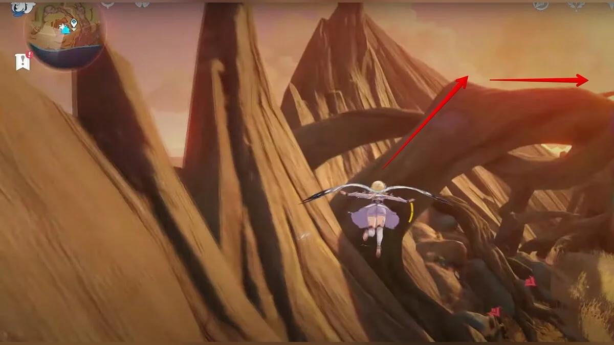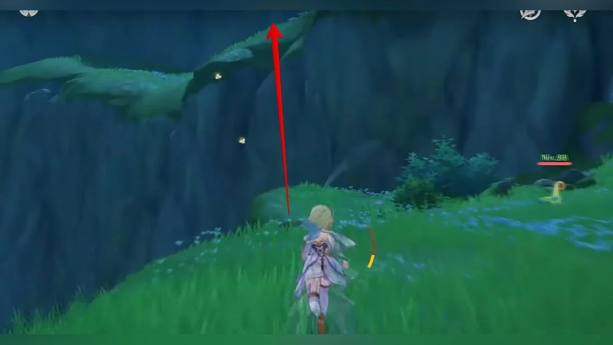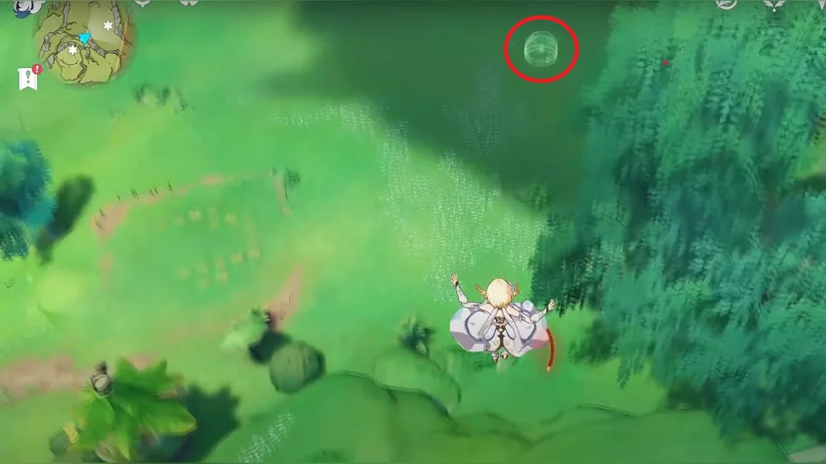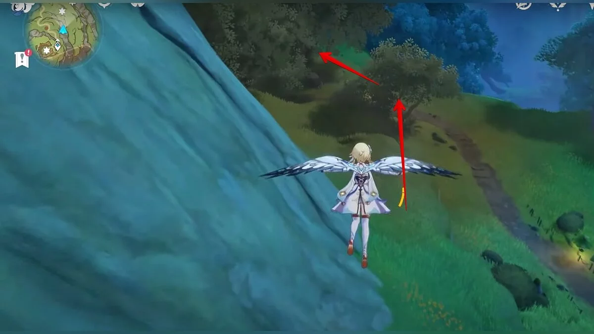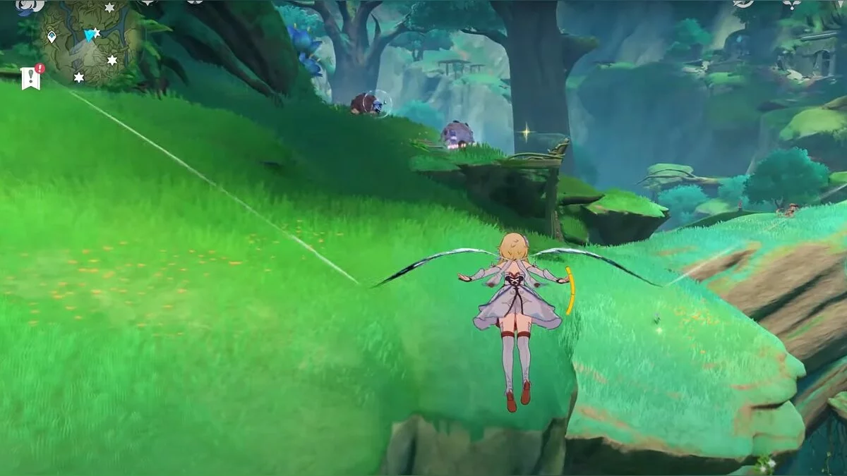 Бегите на восток, поднимайтесь на возвышенность и взаимодействуйте со светлячком, чтобы взлететь повыше. Слева от него парит дендрокул.