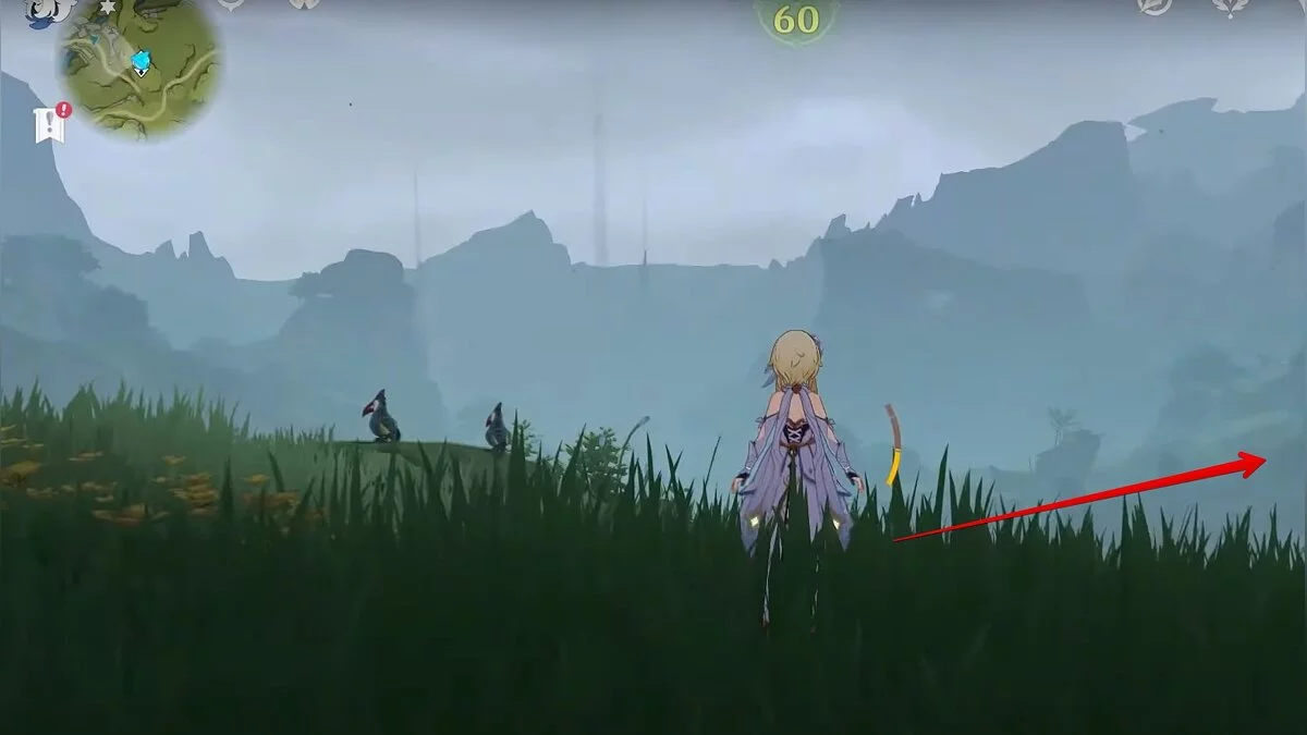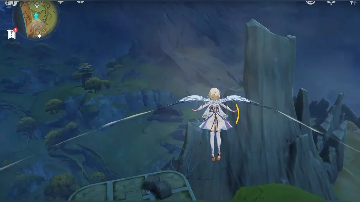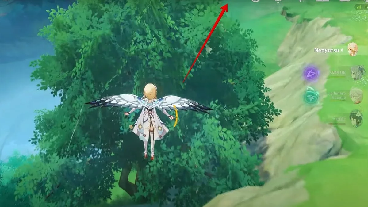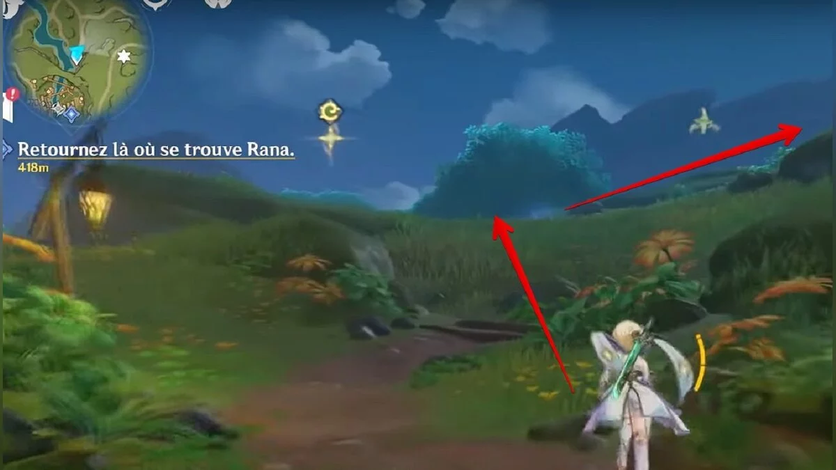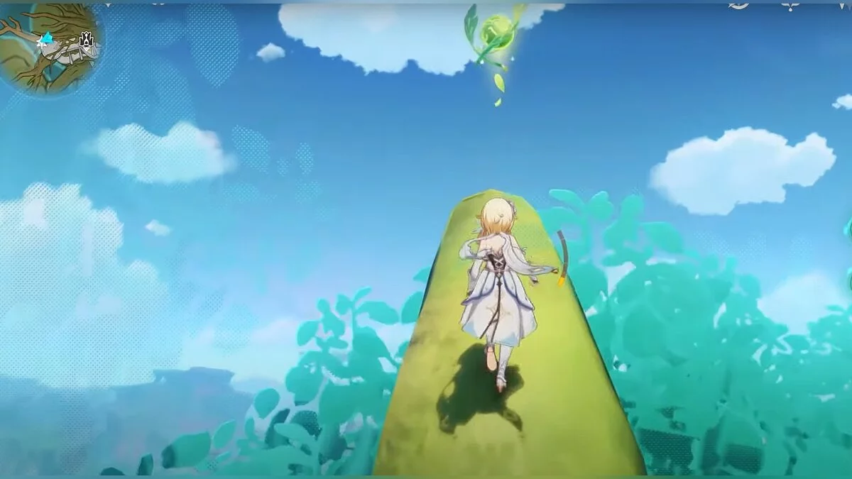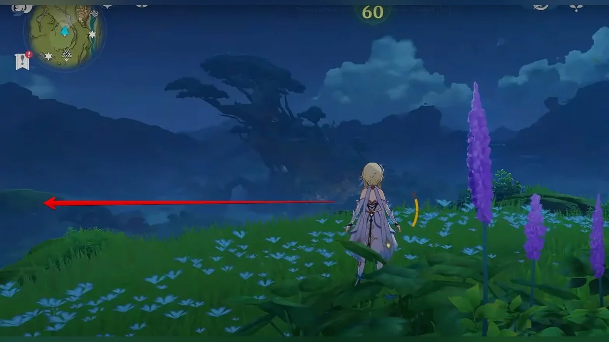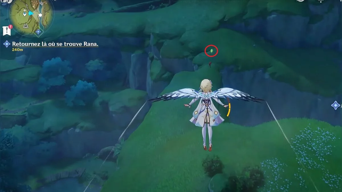 Бегите на восток, поднимайтесь на возвышенность и взаимодействуйте со светлячком, чтобы взлететь повыше. Слева от него парит дендрокул.