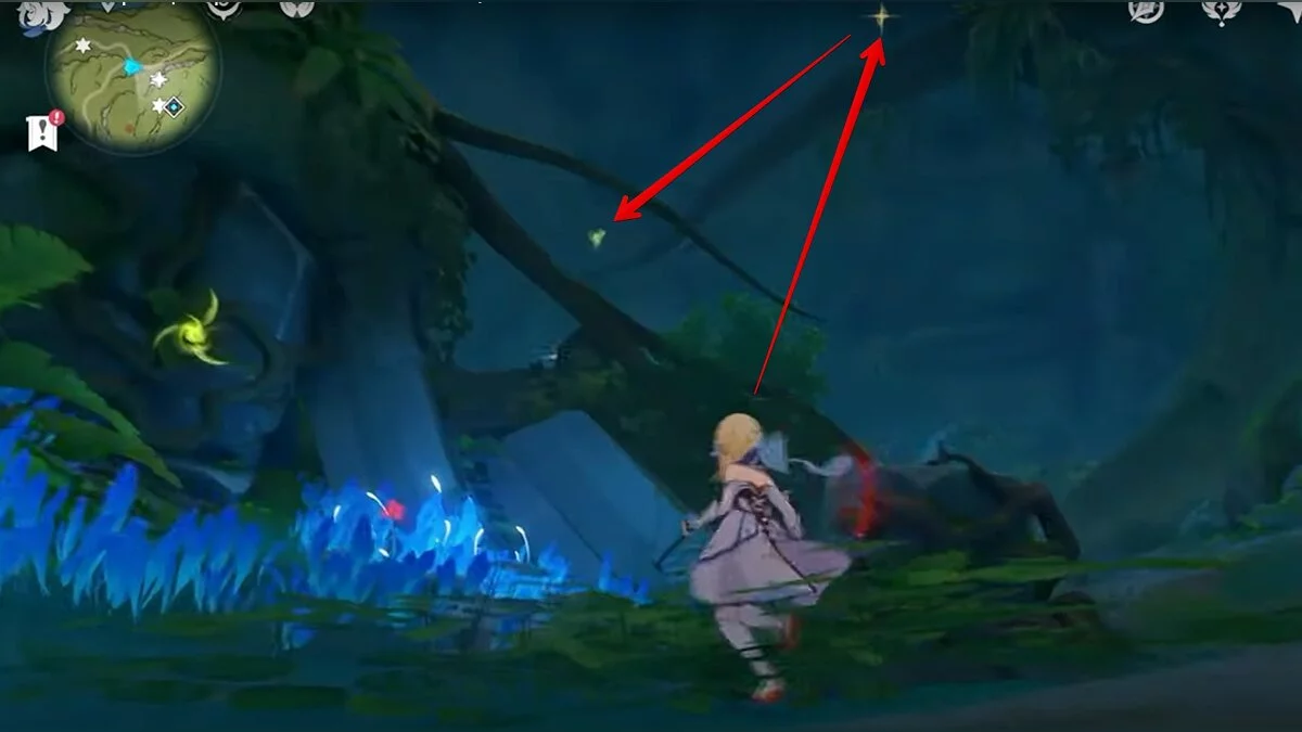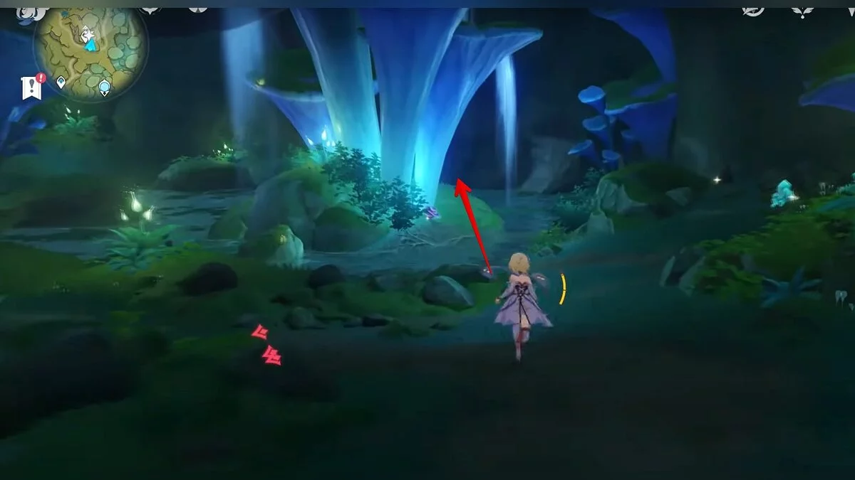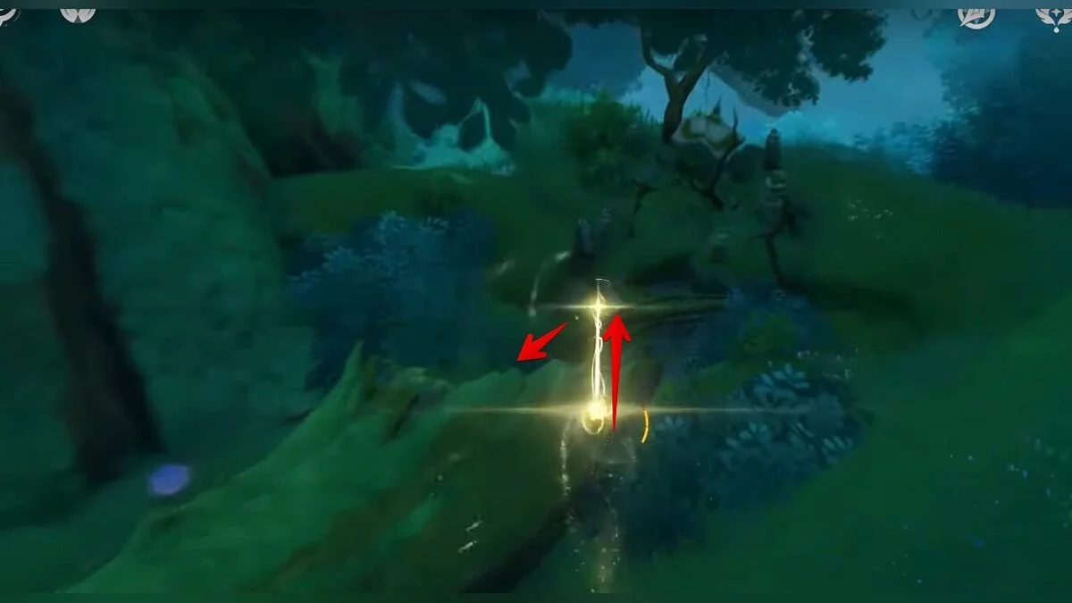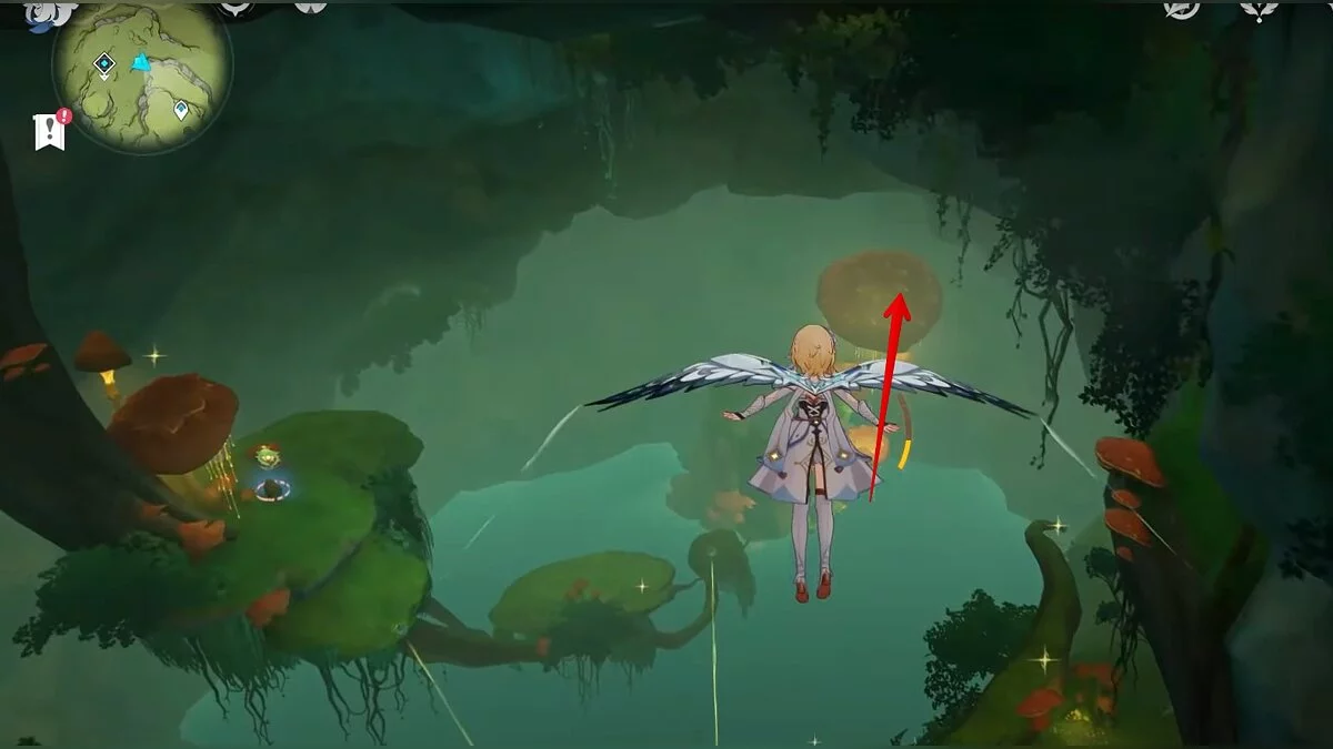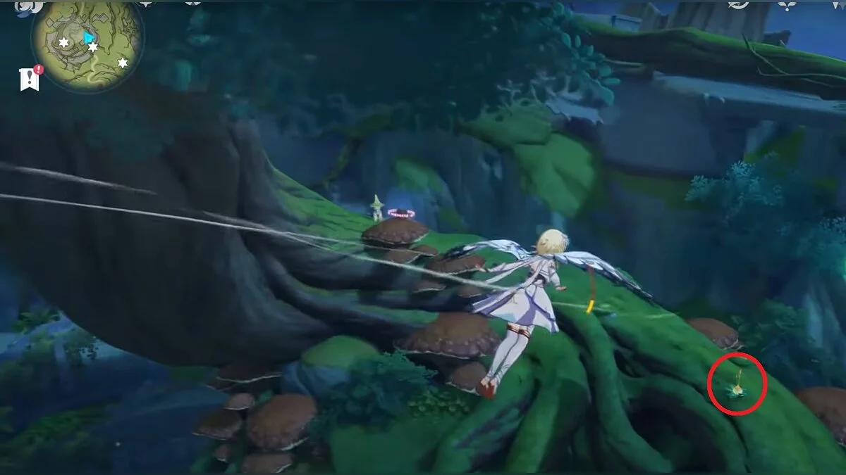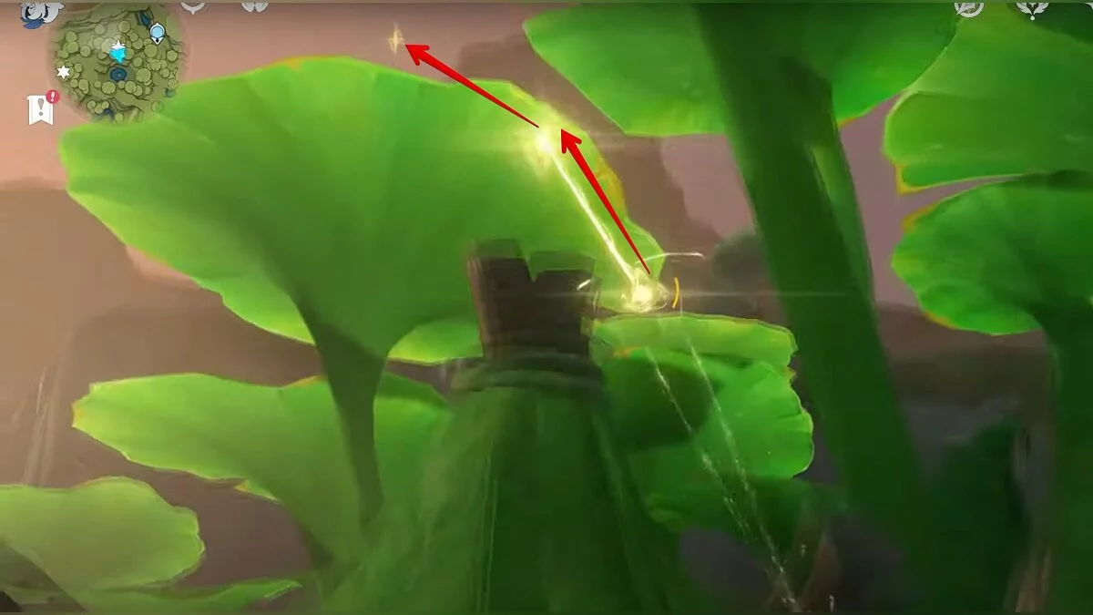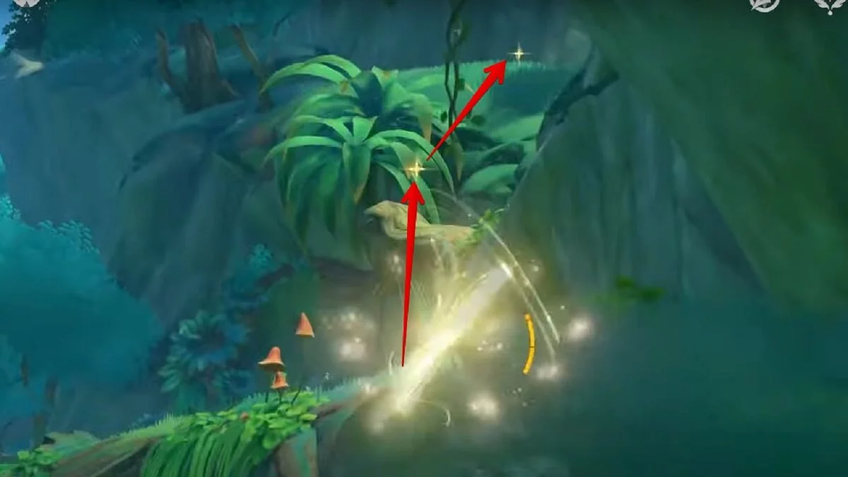 Следуйте на запад. Одолейте пиро слаймов, после чего используйте на грибе сначала дендро, а затем гидро-стихию. Взаимодействуйте с ним. Когда появятся светлячки, цепляйтесь за них, чтобы забраться выше. Так вы сможете получить очередной дендрокул.