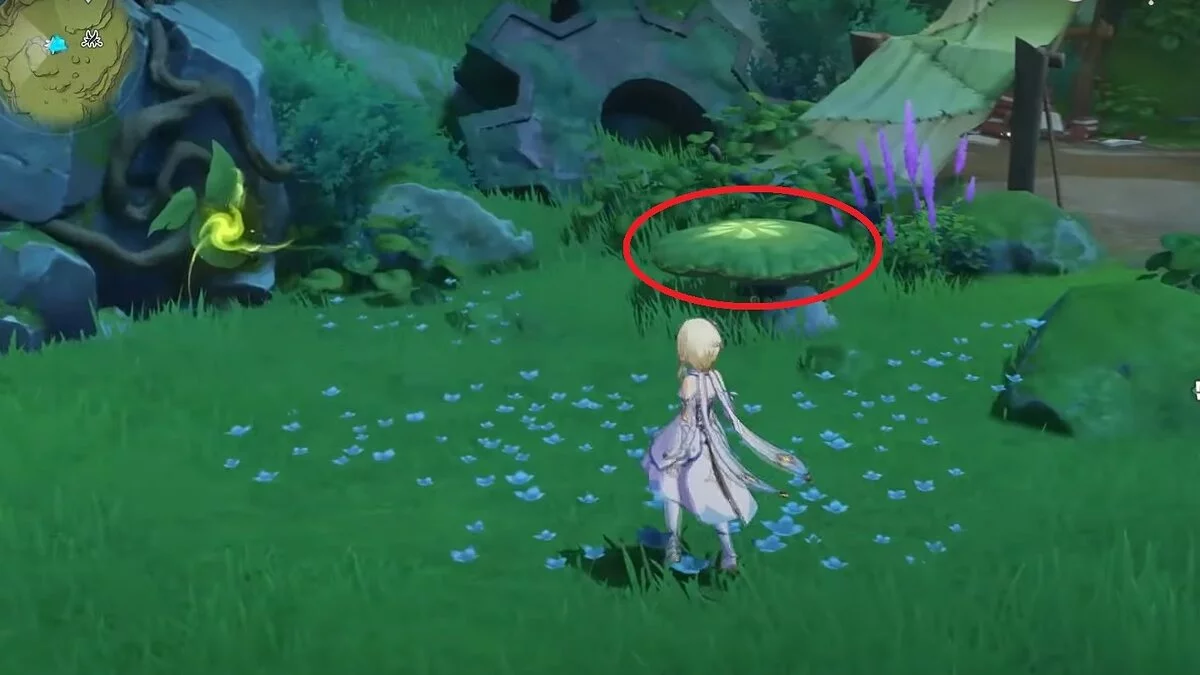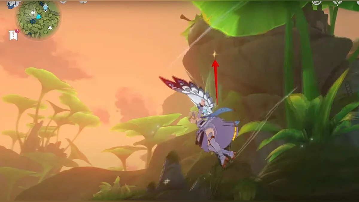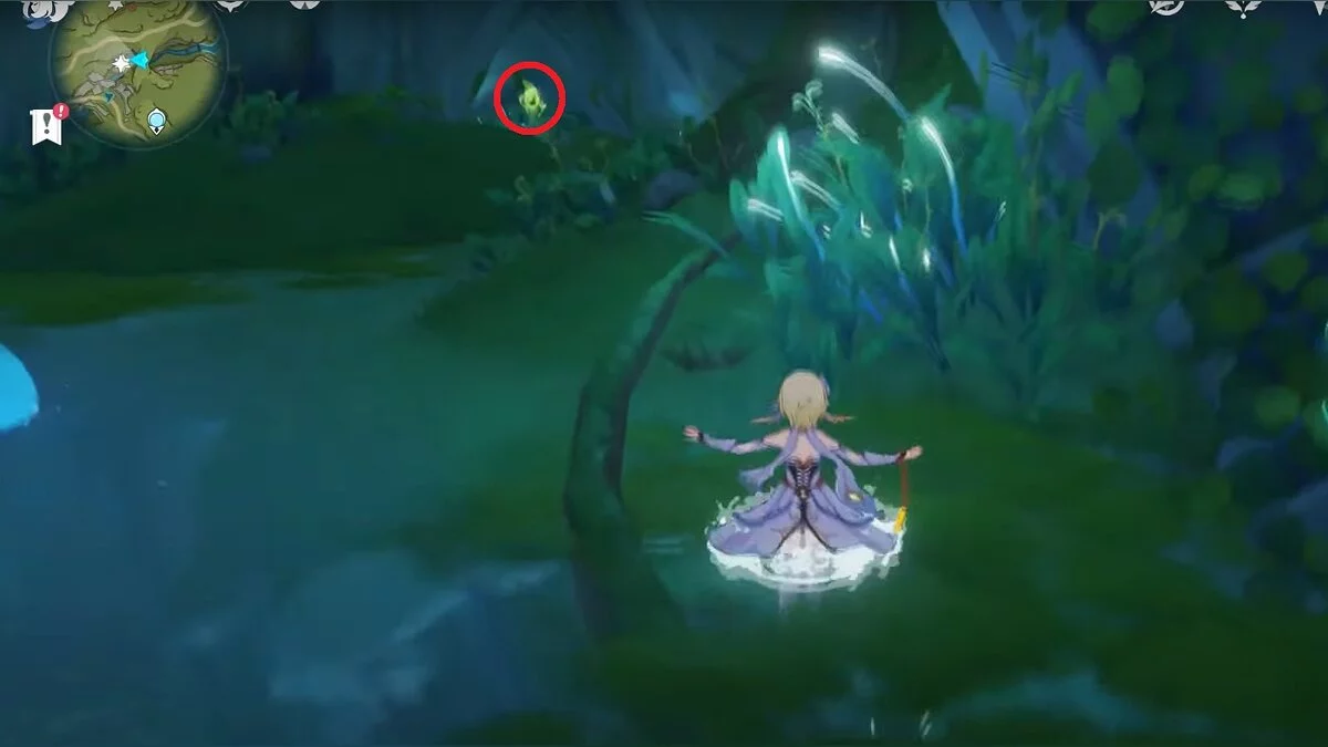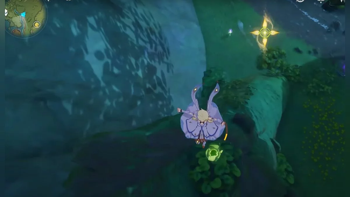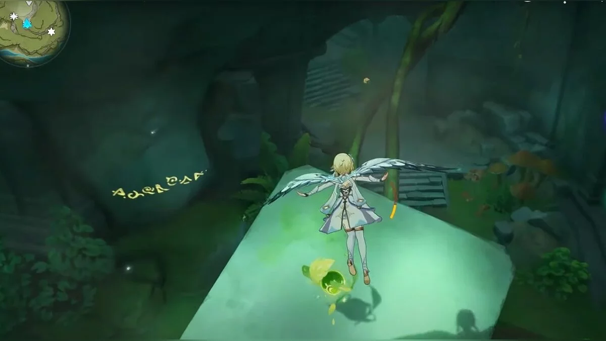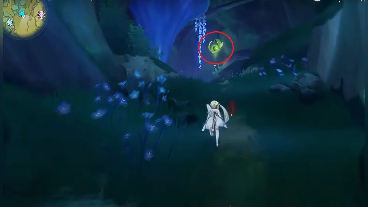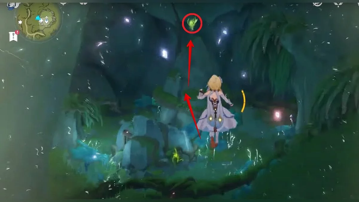 Следуйте на запад. Одолейте пиро слаймов, после чего используйте на грибе сначала дендро, а затем гидро-стихию. Взаимодействуйте с ним. Когда появятся светлячки, цепляйтесь за них, чтобы забраться выше. Так вы сможете получить очередной дендрокул.