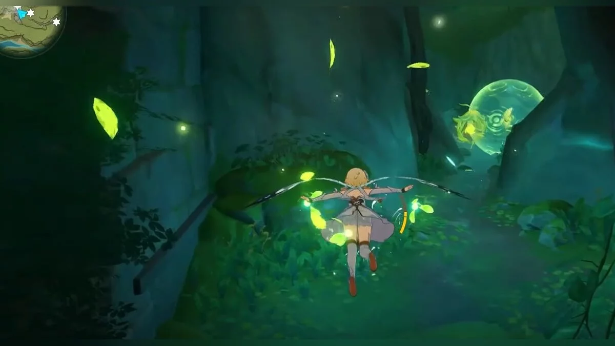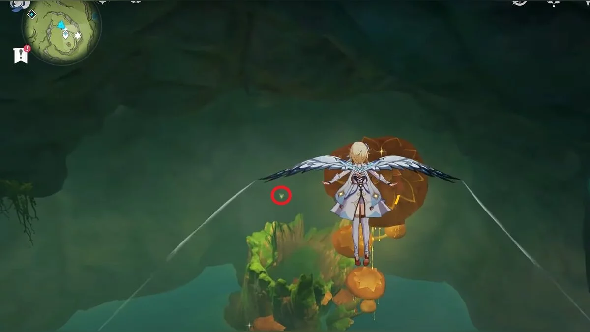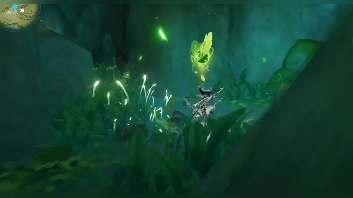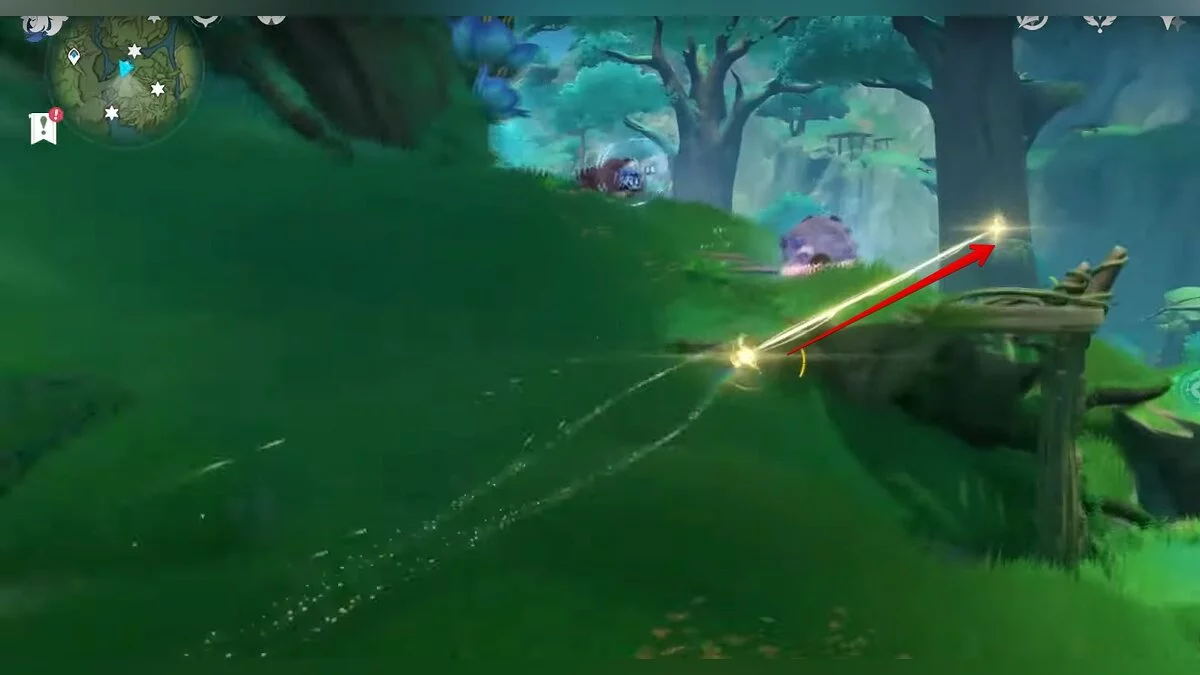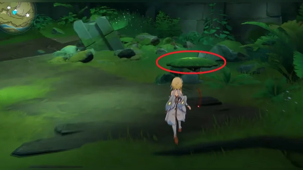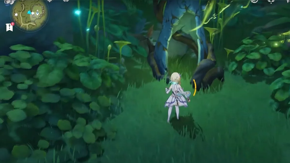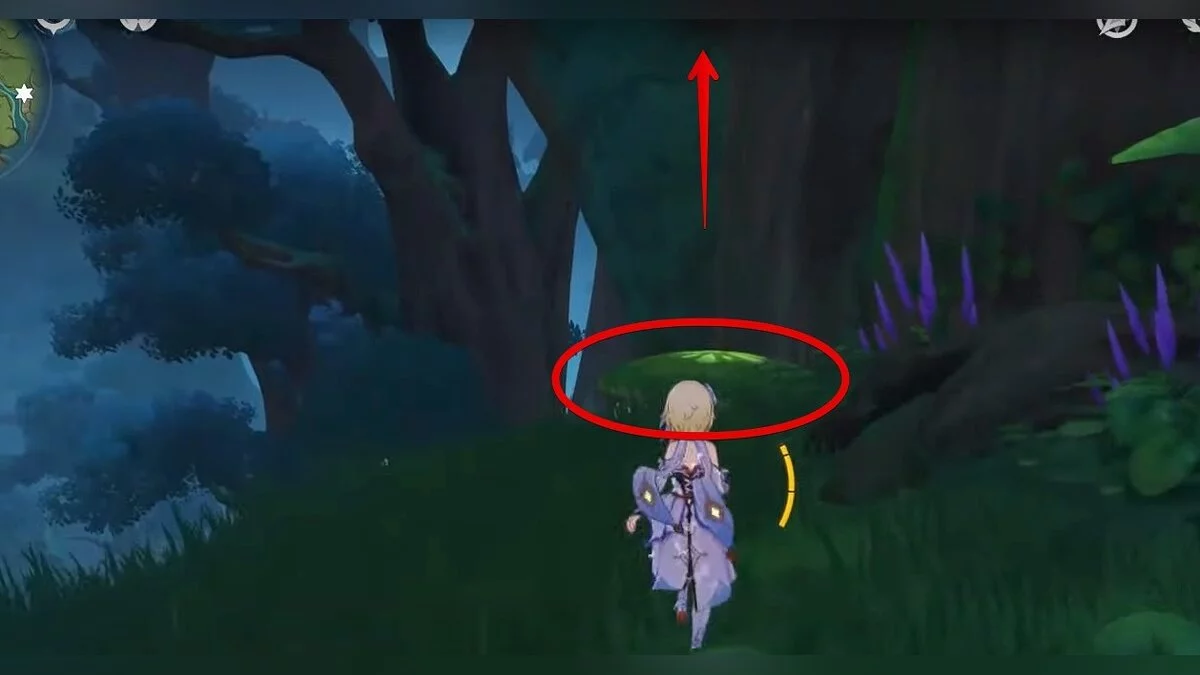 Следуйте на запад. Одолейте пиро слаймов, после чего используйте на грибе сначала дендро, а затем гидро-стихию. Взаимодействуйте с ним. Когда появятся светлячки, цепляйтесь за них, чтобы забраться выше. Так вы сможете получить очередной дендрокул.