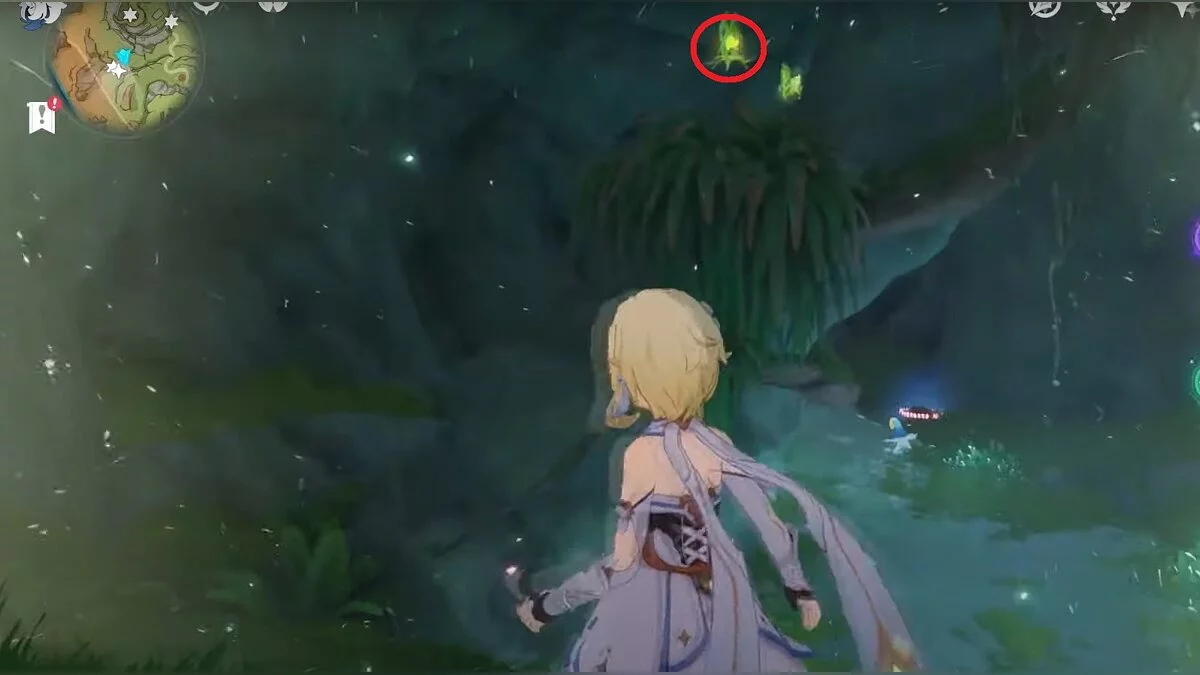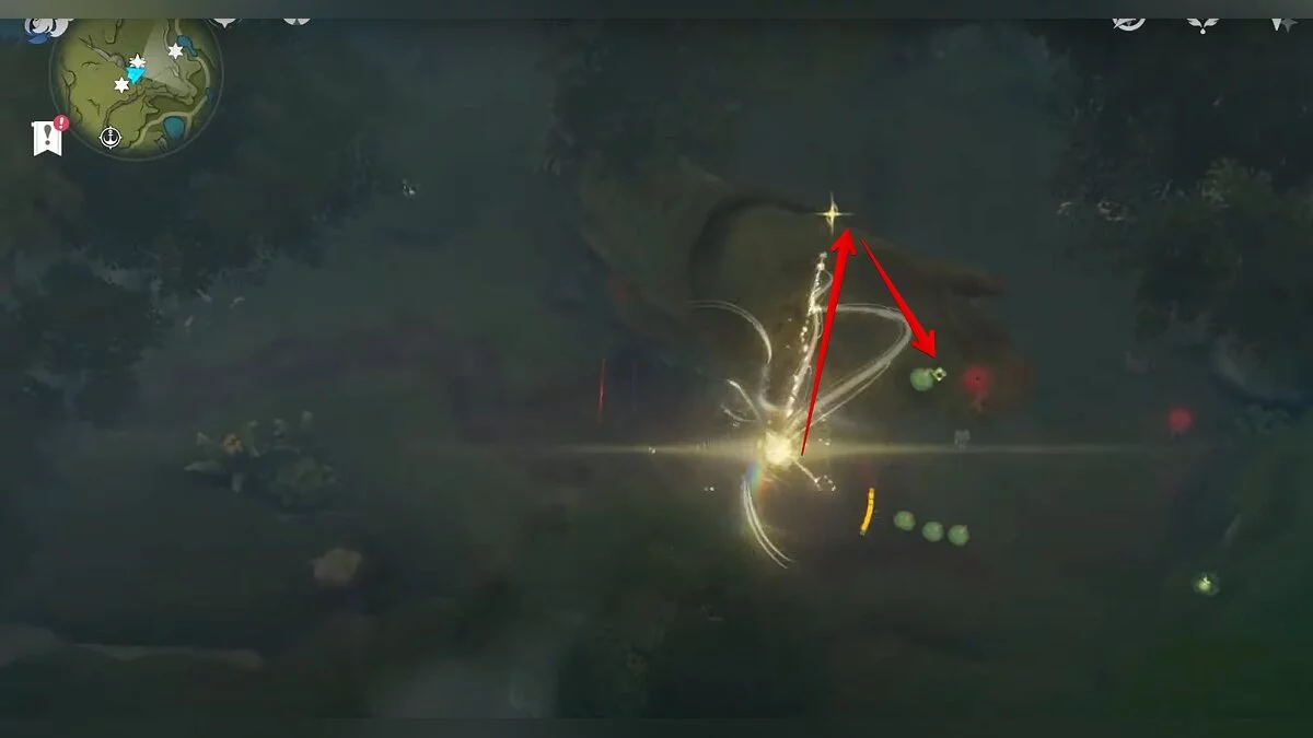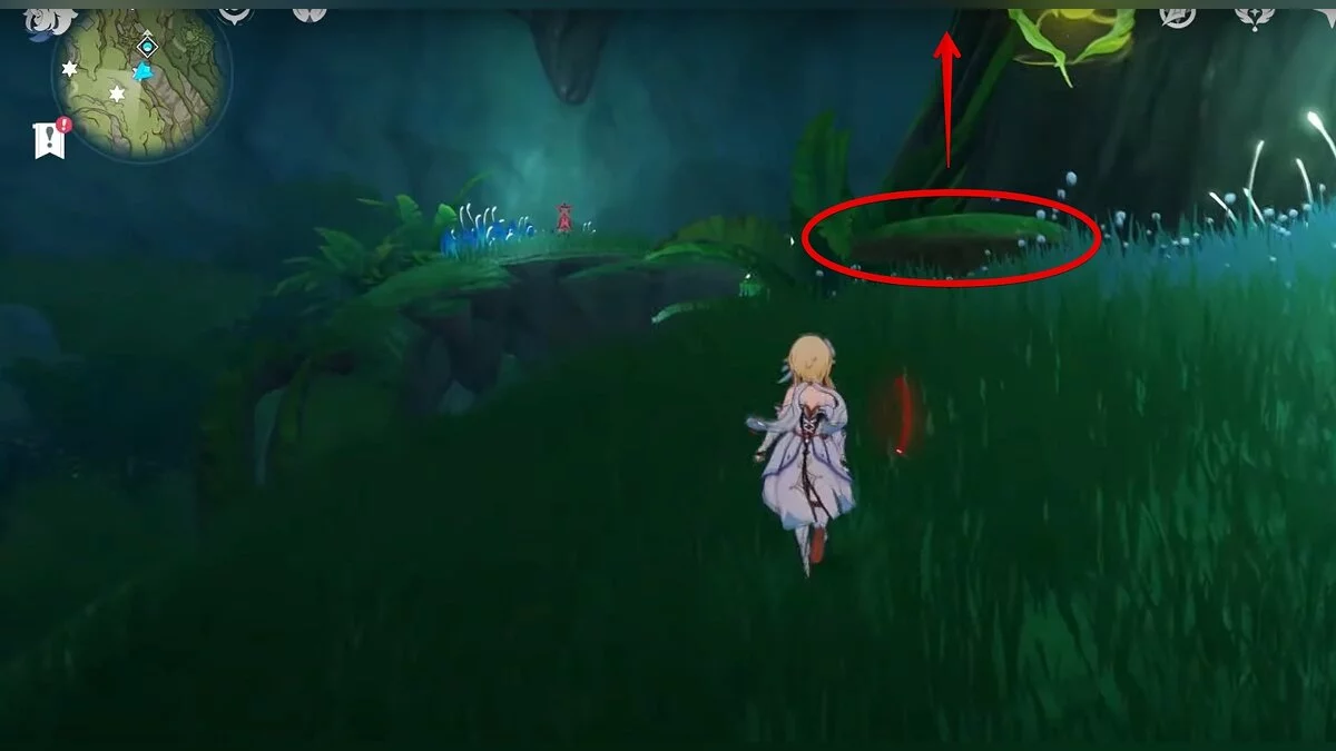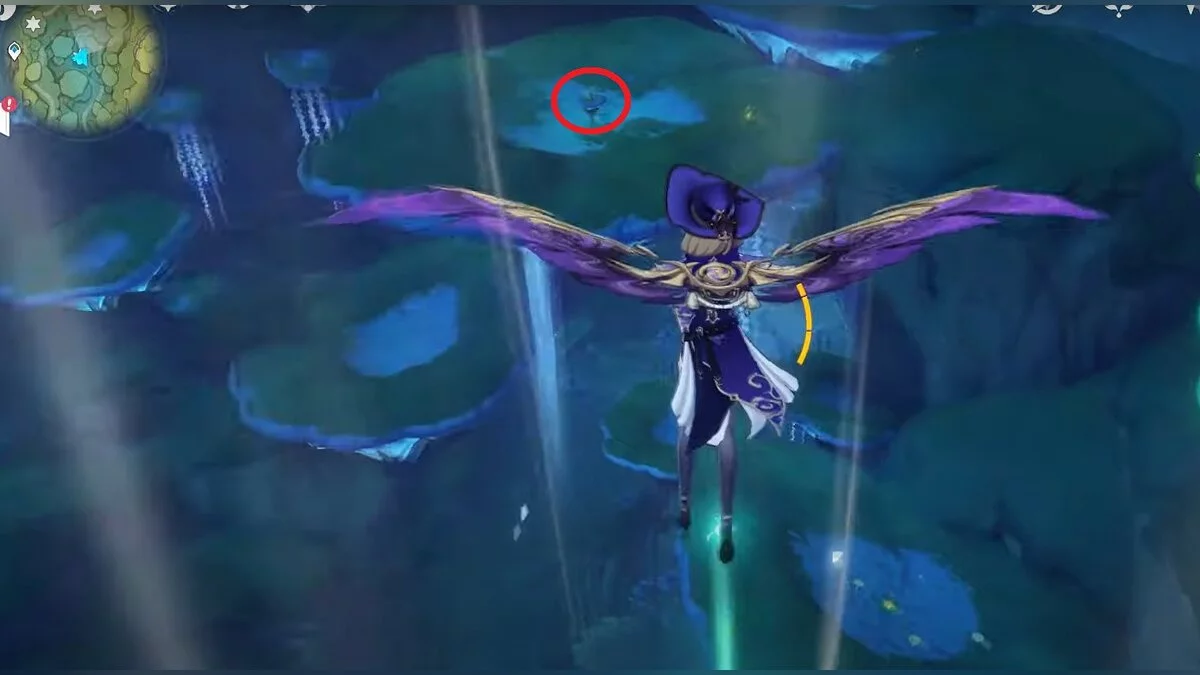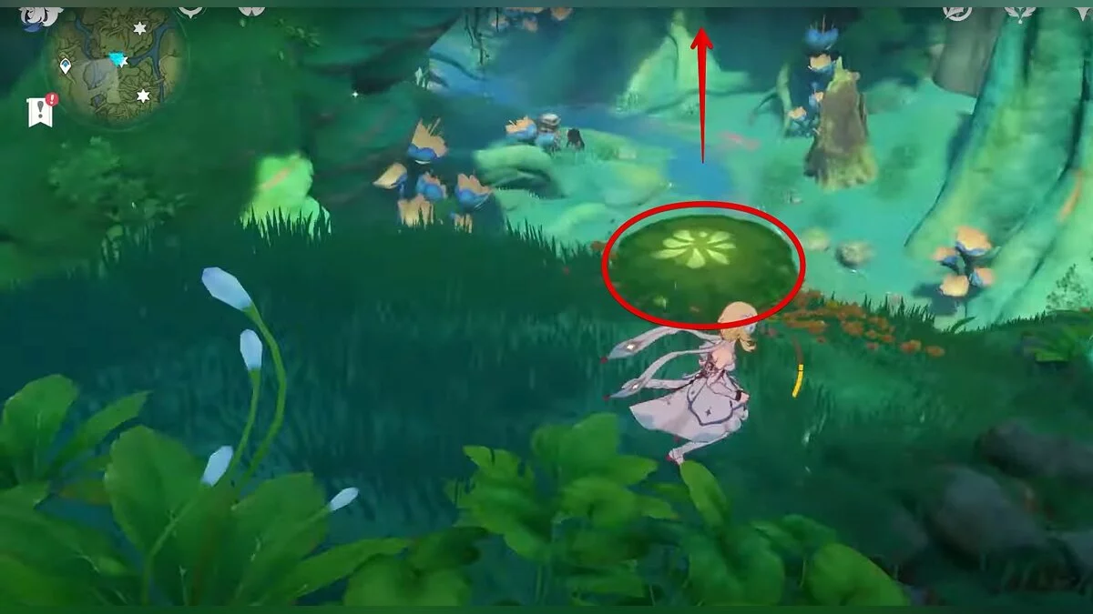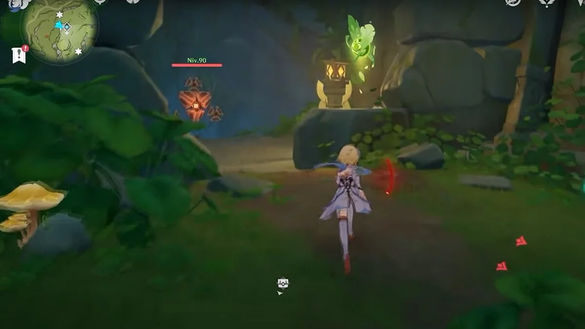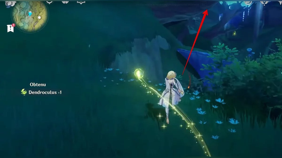 Следуйте на запад. Одолейте пиро слаймов, после чего используйте на грибе сначала дендро, а затем гидро-стихию. Взаимодействуйте с ним. Когда появятся светлячки, цепляйтесь за них, чтобы забраться выше. Так вы сможете получить очередной дендрокул.