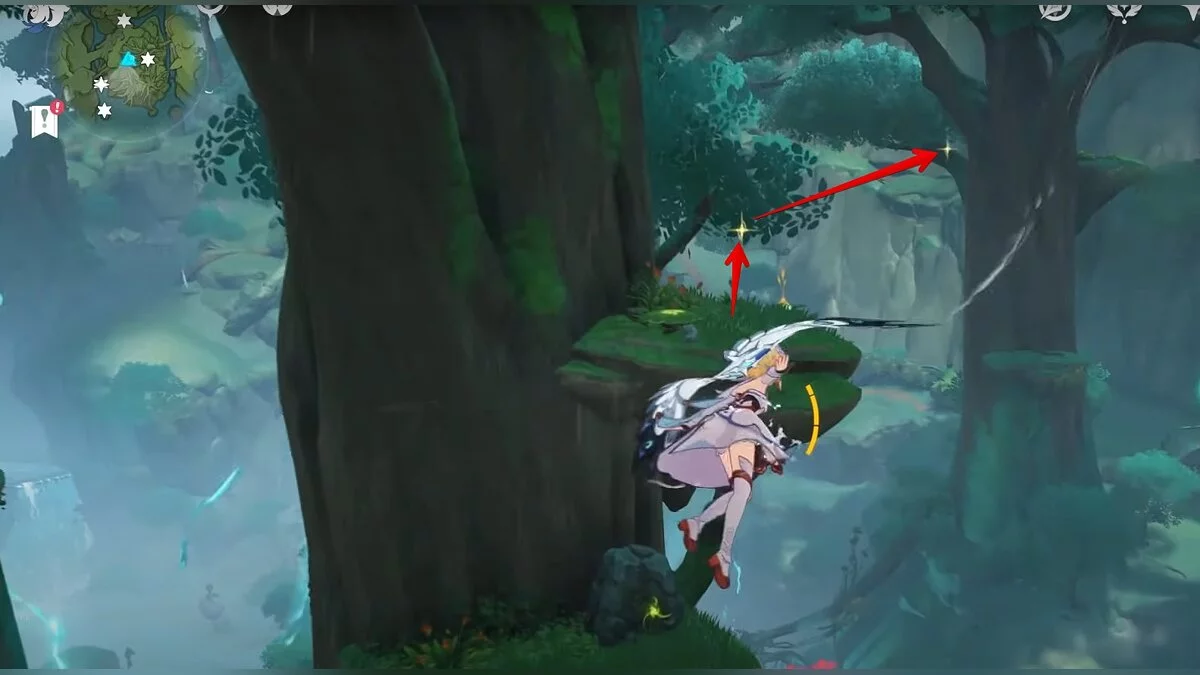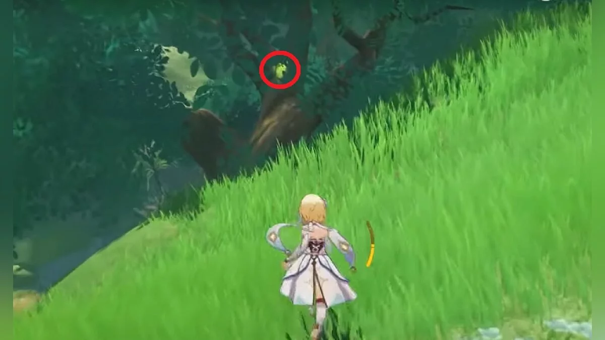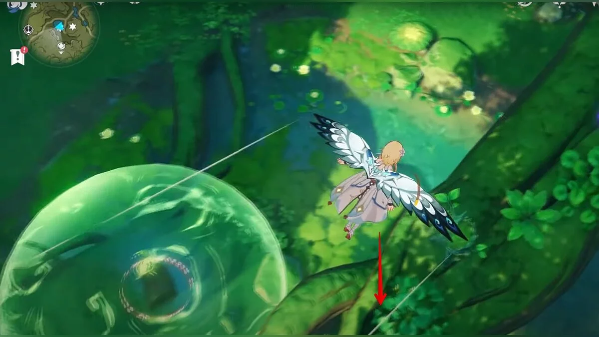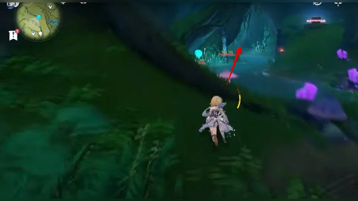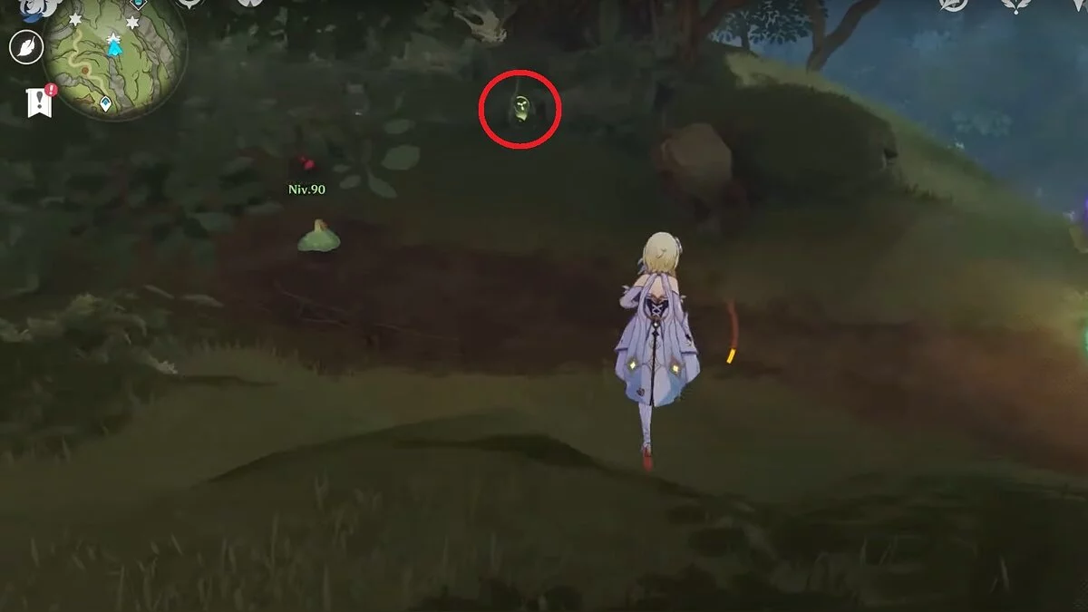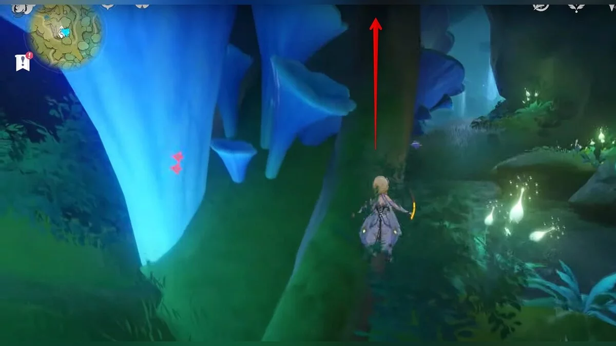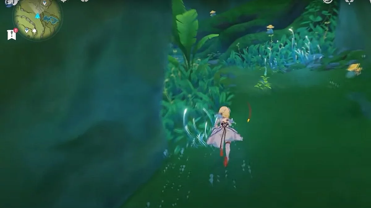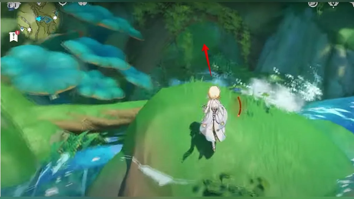 Следуйте на запад. Одолейте пиро слаймов, после чего используйте на грибе сначала дендро, а затем гидро-стихию. Взаимодействуйте с ним. Когда появятся светлячки, цепляйтесь за них, чтобы забраться выше. Так вы сможете получить очередной дендрокул.
