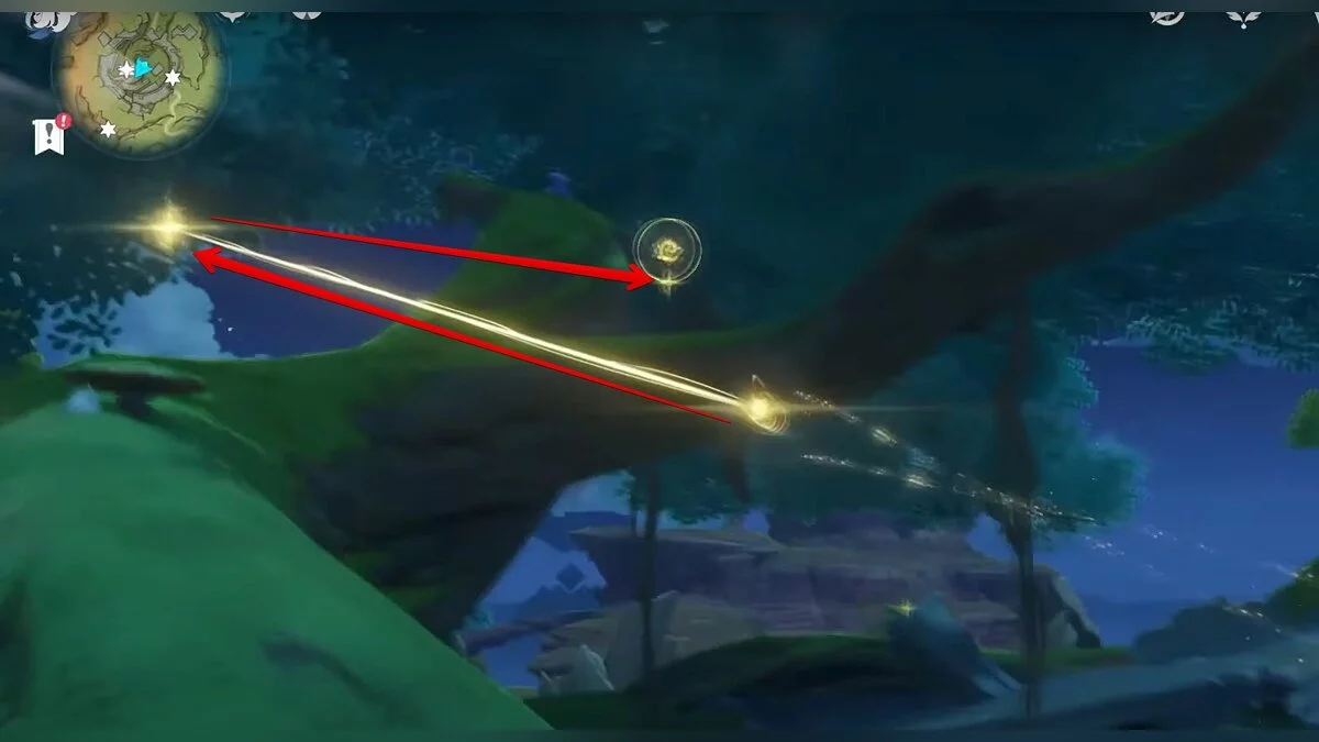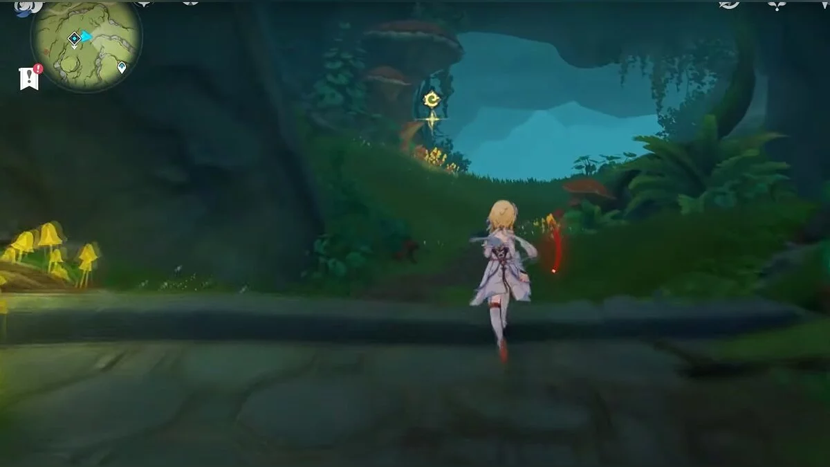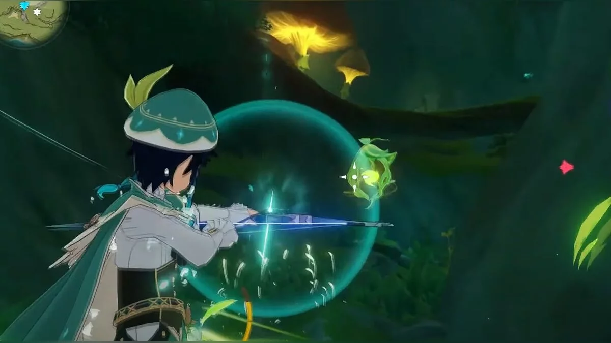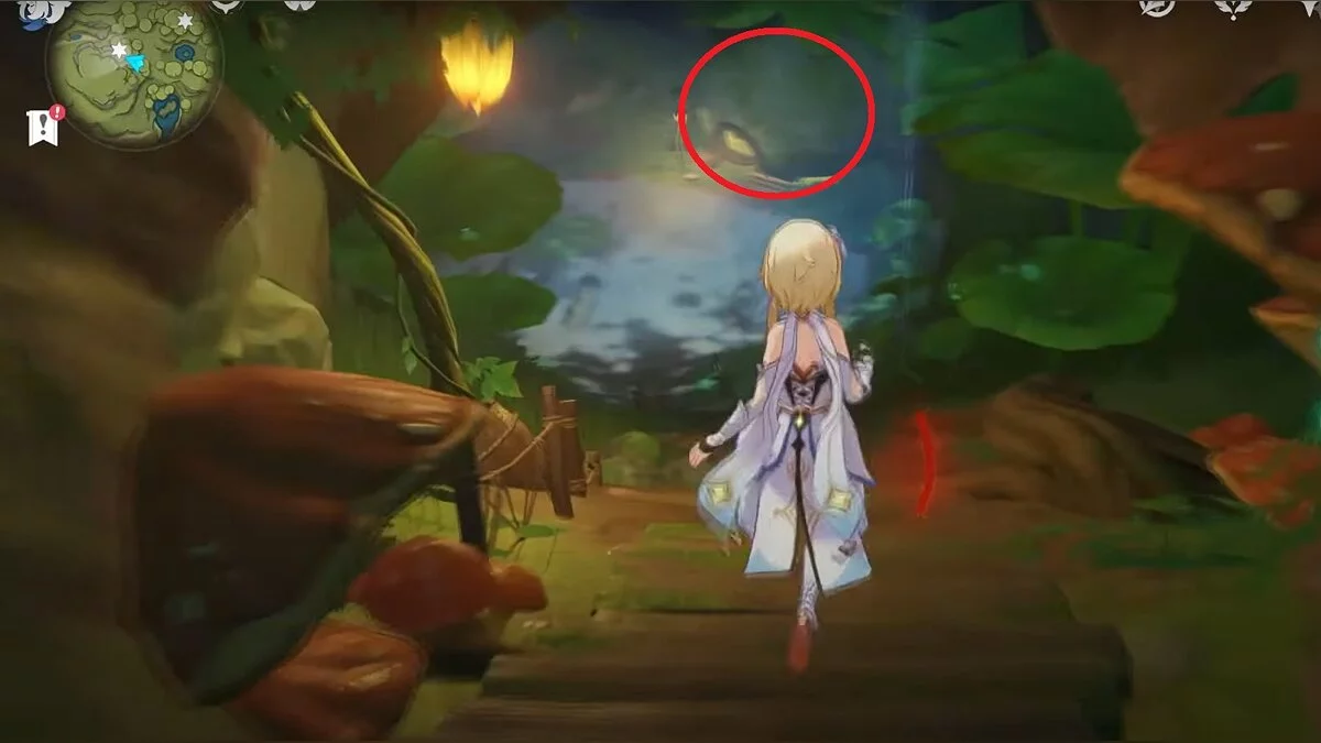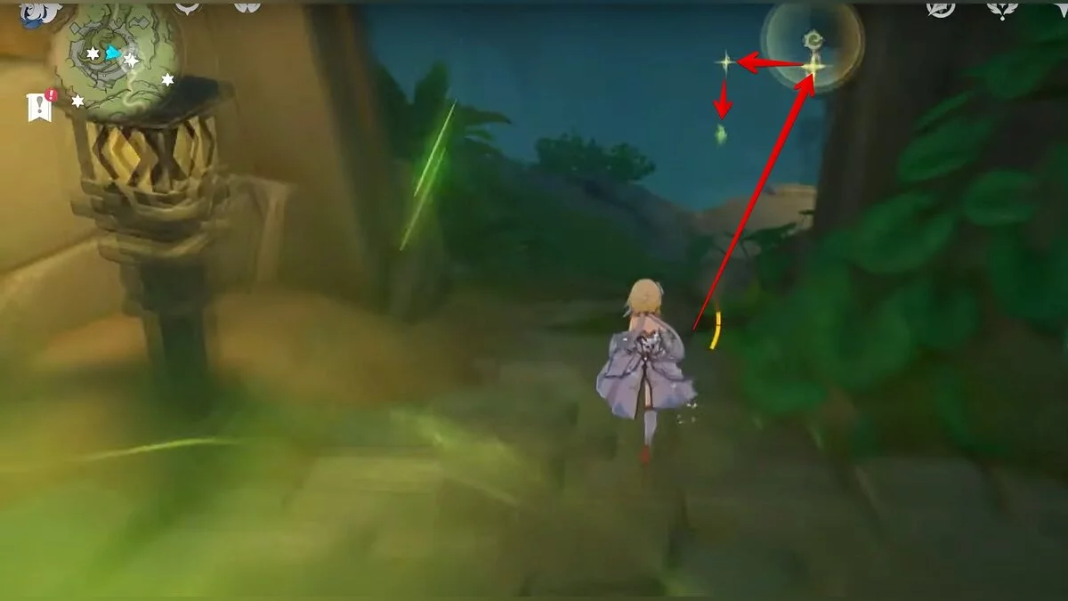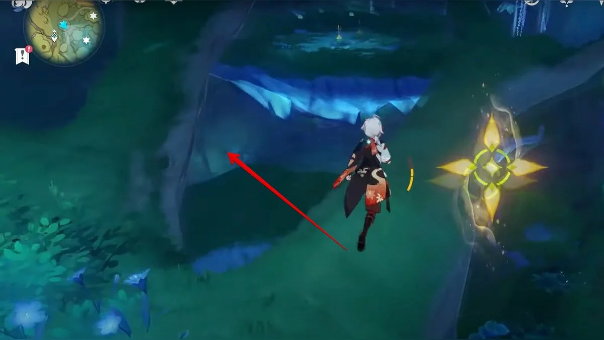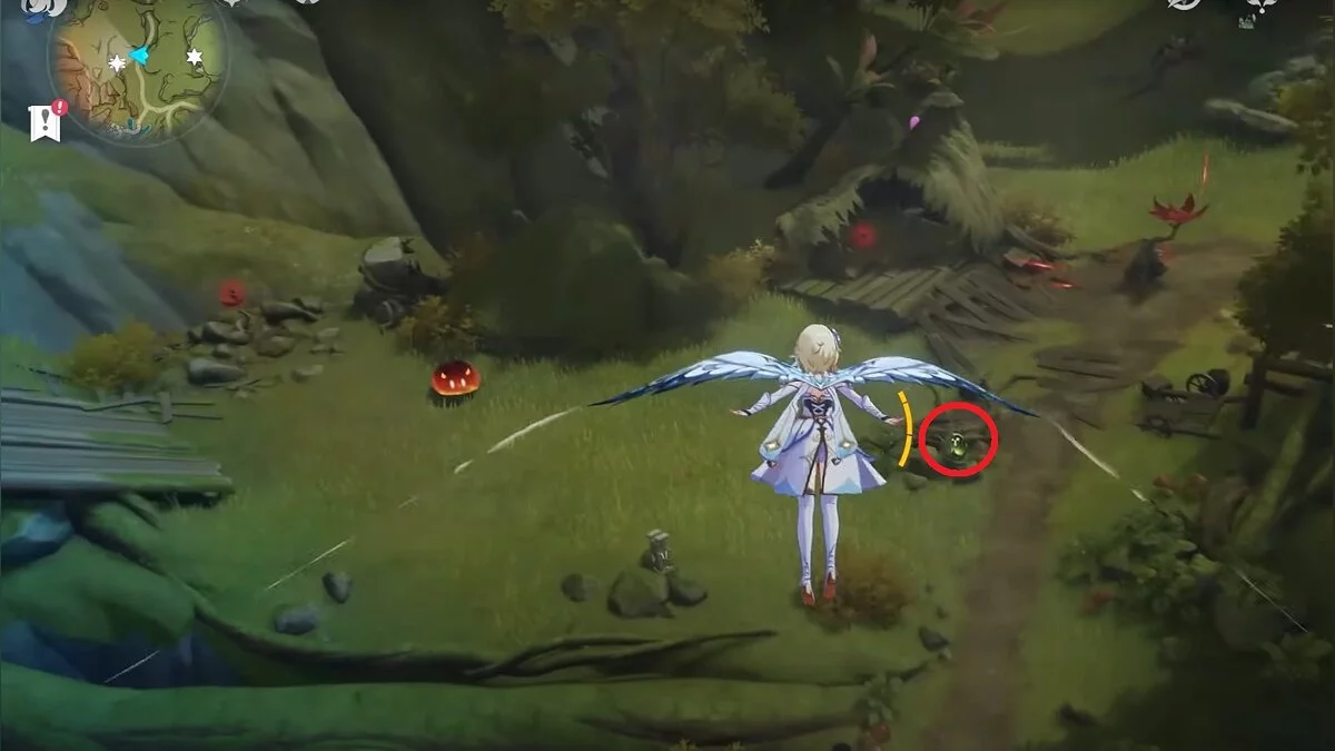 Следуйте на запад. Одолейте пиро слаймов, после чего используйте на грибе сначала дендро, а затем гидро-стихию. Взаимодействуйте с ним. Когда появятся светлячки, цепляйтесь за них, чтобы забраться выше. Так вы сможете получить очередной дендрокул.
