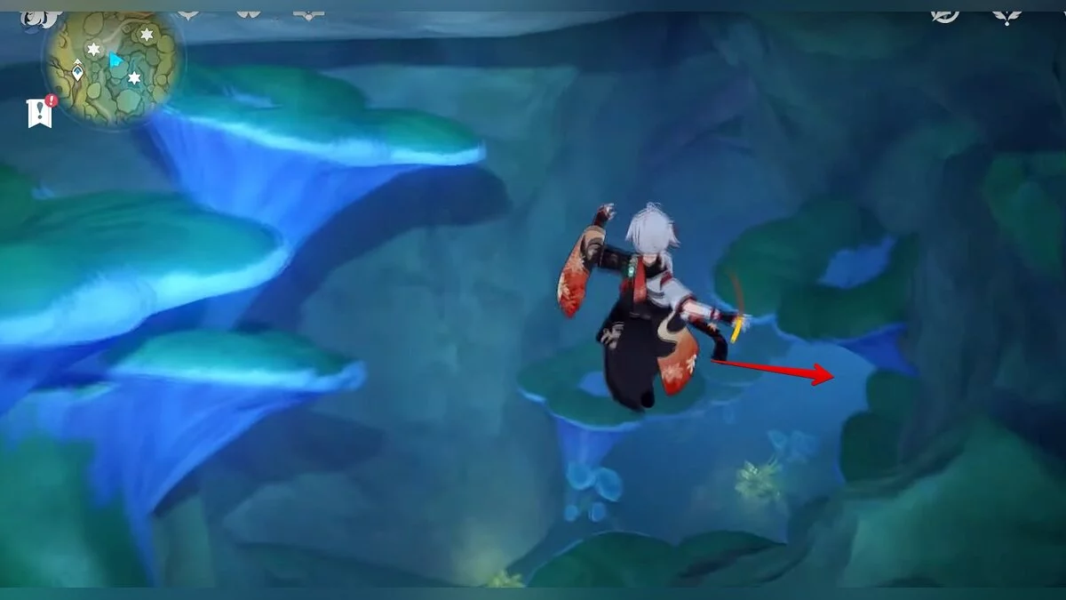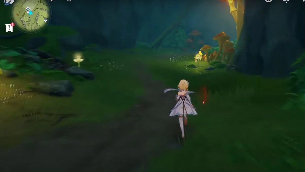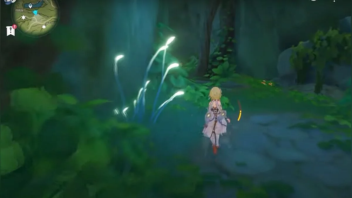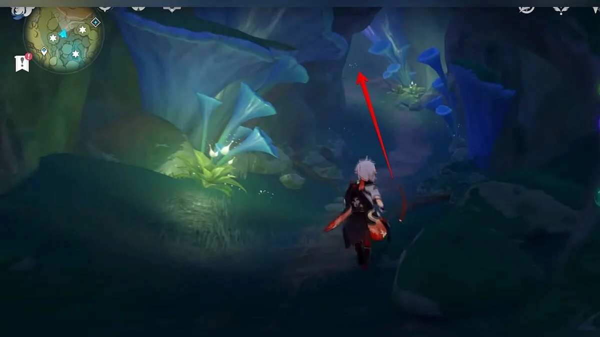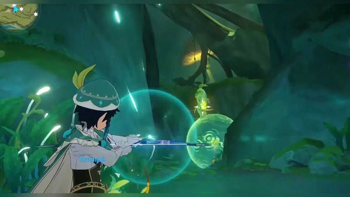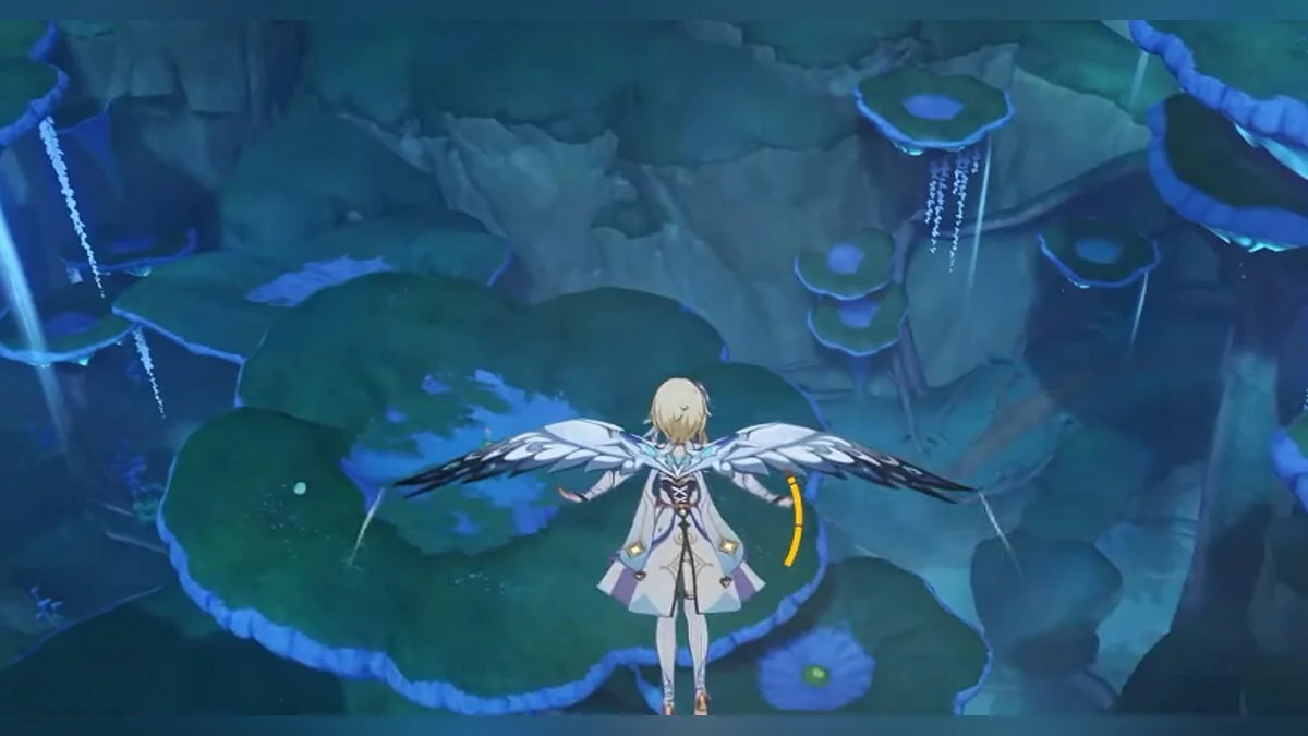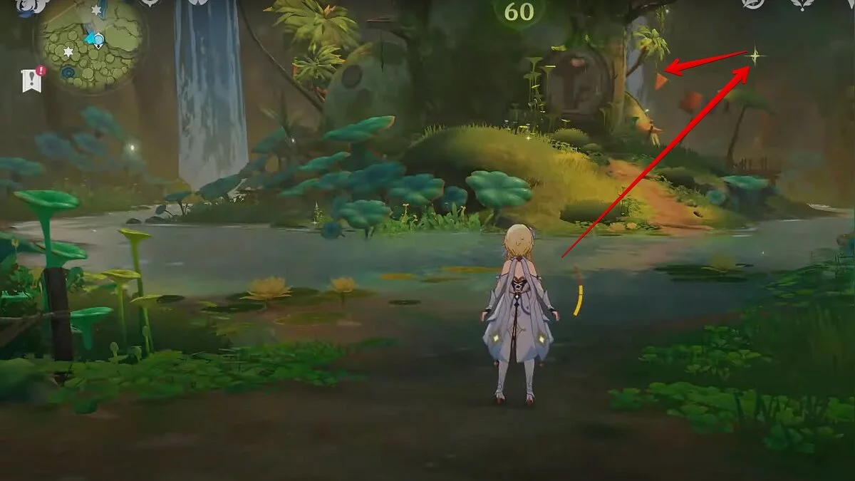 Следуйте на запад. Одолейте пиро слаймов, после чего используйте на грибе сначала дендро, а затем гидро-стихию. Взаимодействуйте с ним. Когда появятся светлячки, цепляйтесь за них, чтобы забраться выше. Так вы сможете получить очередной дендрокул.