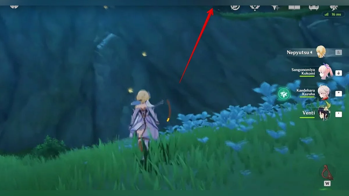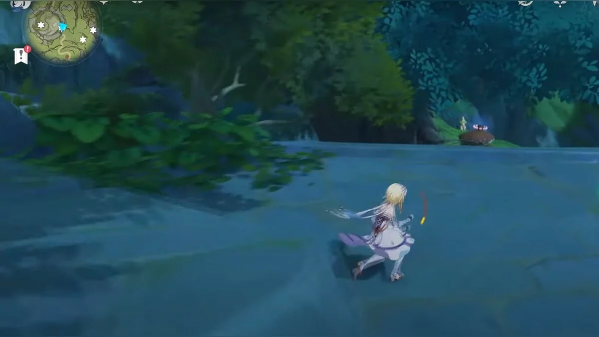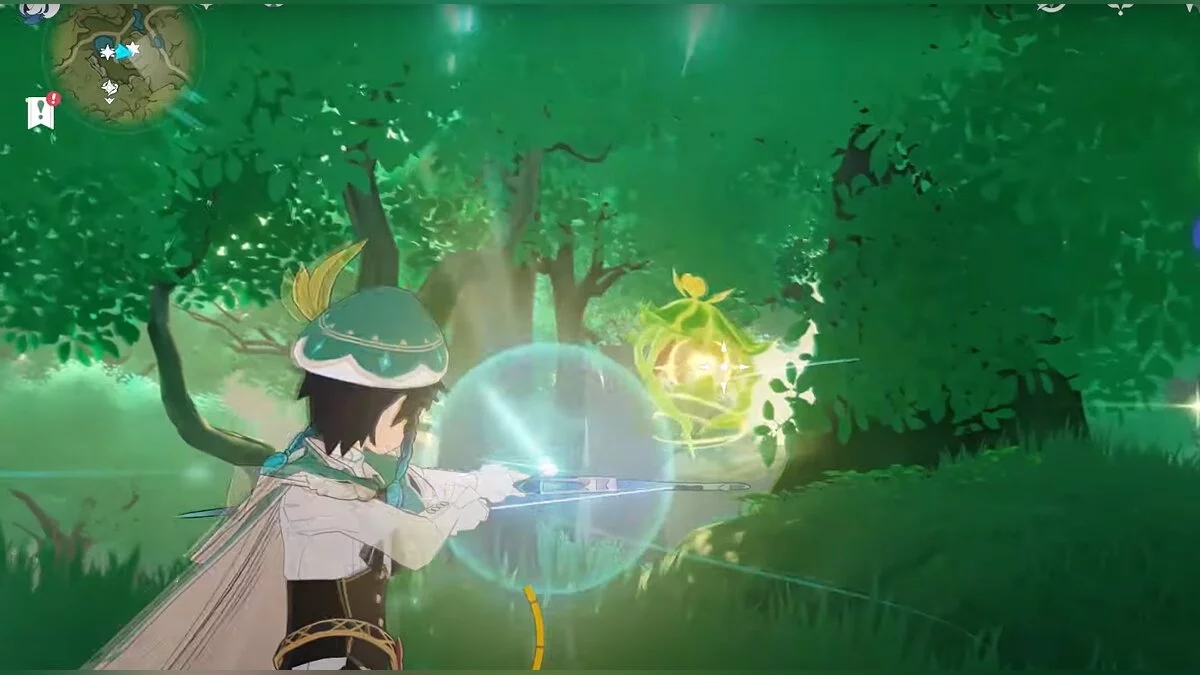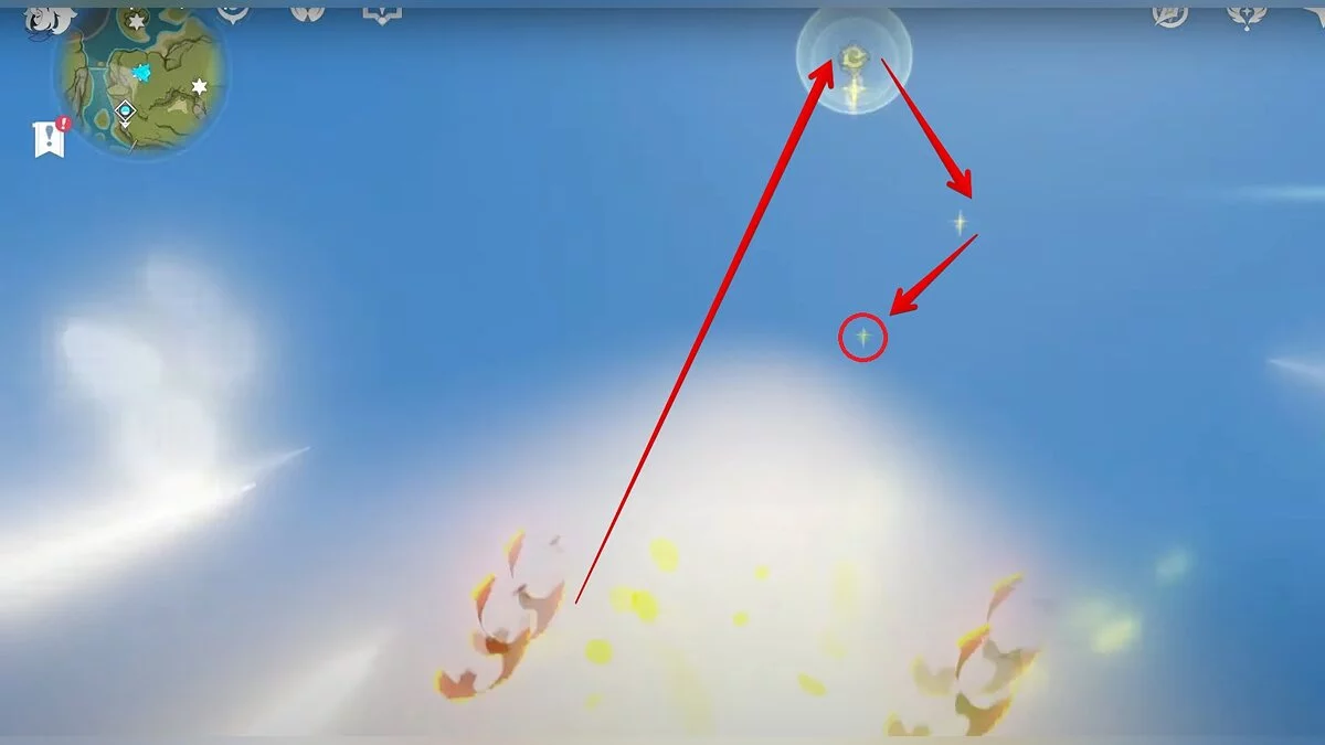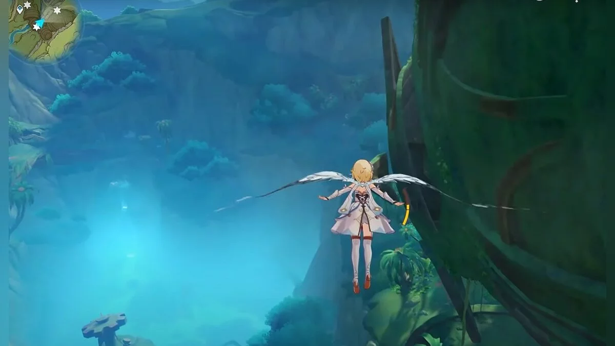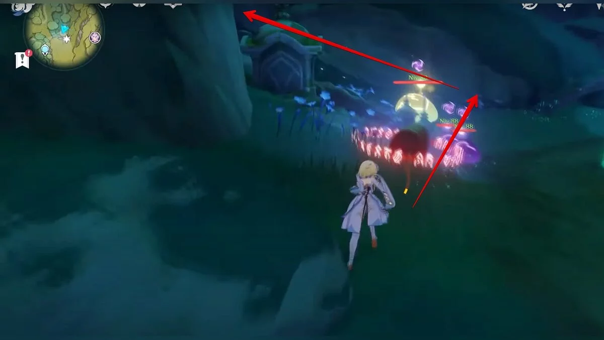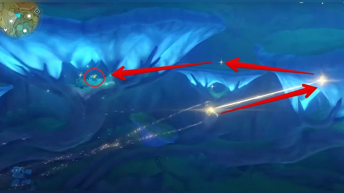 Следуйте на запад. Одолейте пиро слаймов, после чего используйте на грибе сначала дендро, а затем гидро-стихию. Взаимодействуйте с ним. Когда появятся светлячки, цепляйтесь за них, чтобы забраться выше. Так вы сможете получить очередной дендрокул.