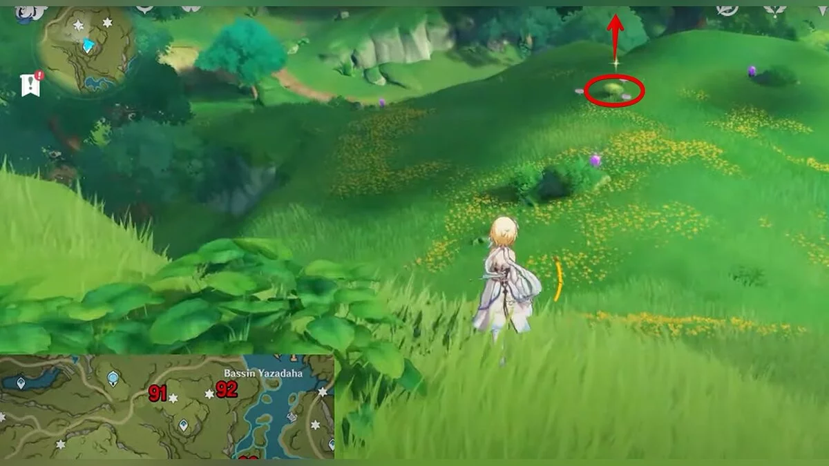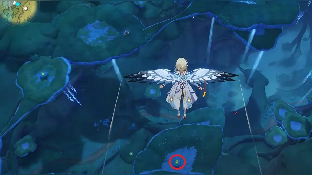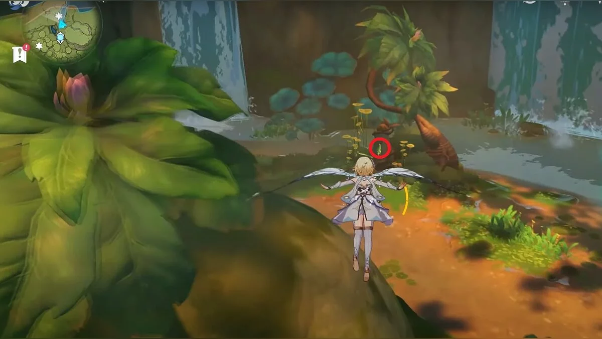 94-й дендрокул. Вдоль водоёма бегите на запад, пока не доберётесь до водопада. Рядом с ним находится трамплин. Воспользуйтесь им, чтобы забраться выше. Идите по коридору вперёд, затем поднимайтесь по лестнице, поворачивайте направо и двигайтесь дальше. Вы должны оказаться над подземным озером. Летите к огромному коричневому цветку. На востоке от него находится нужный ресурс.