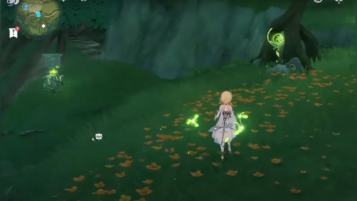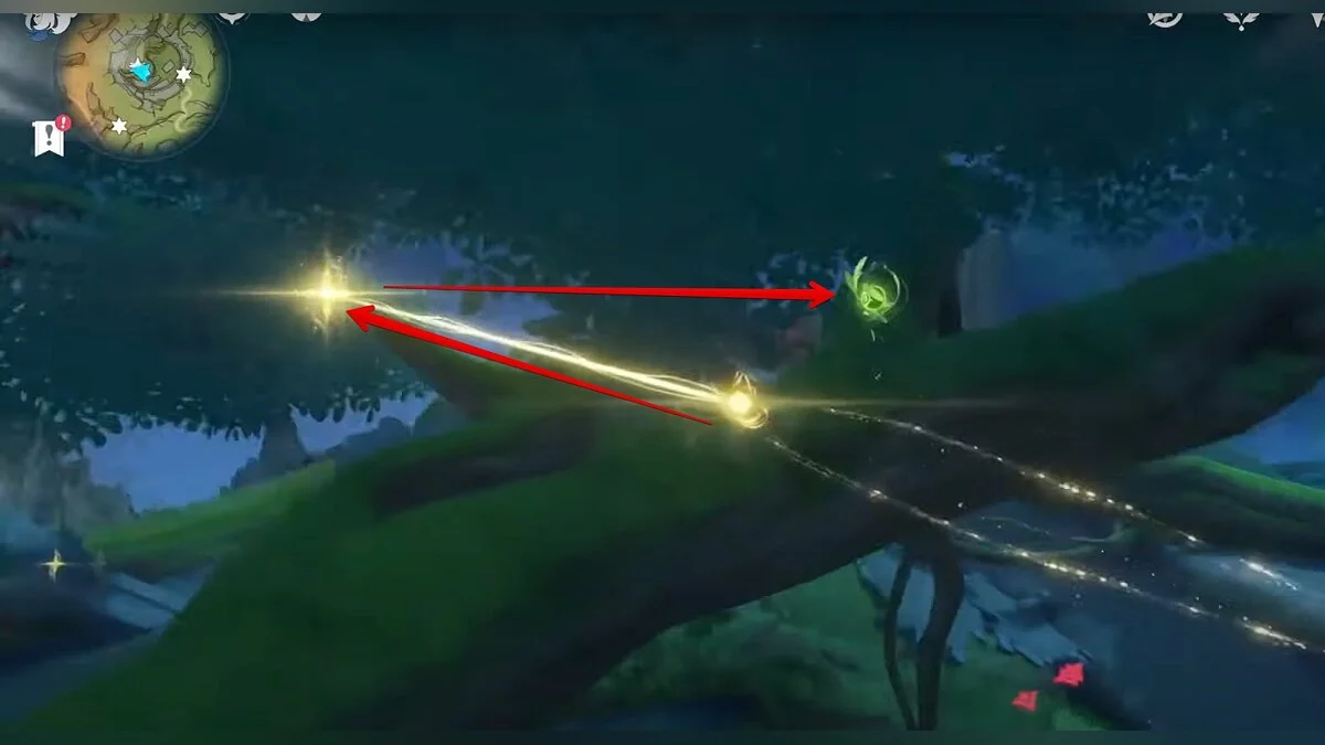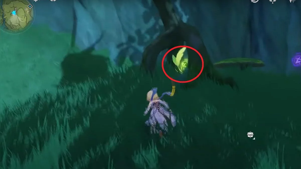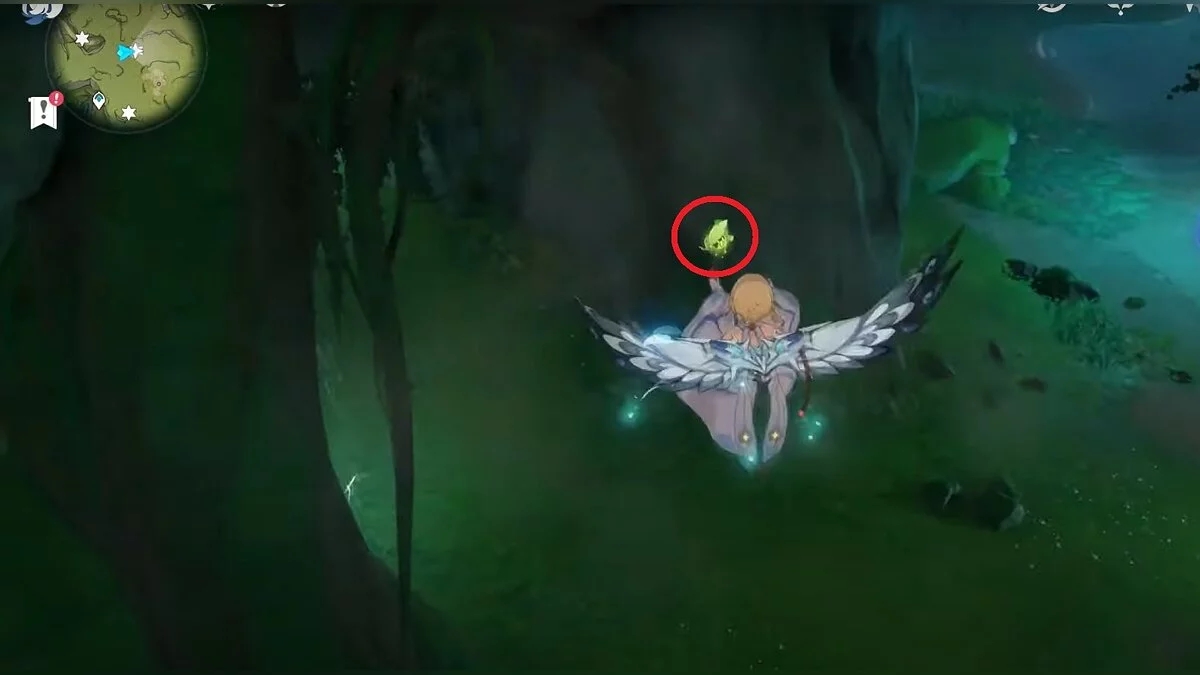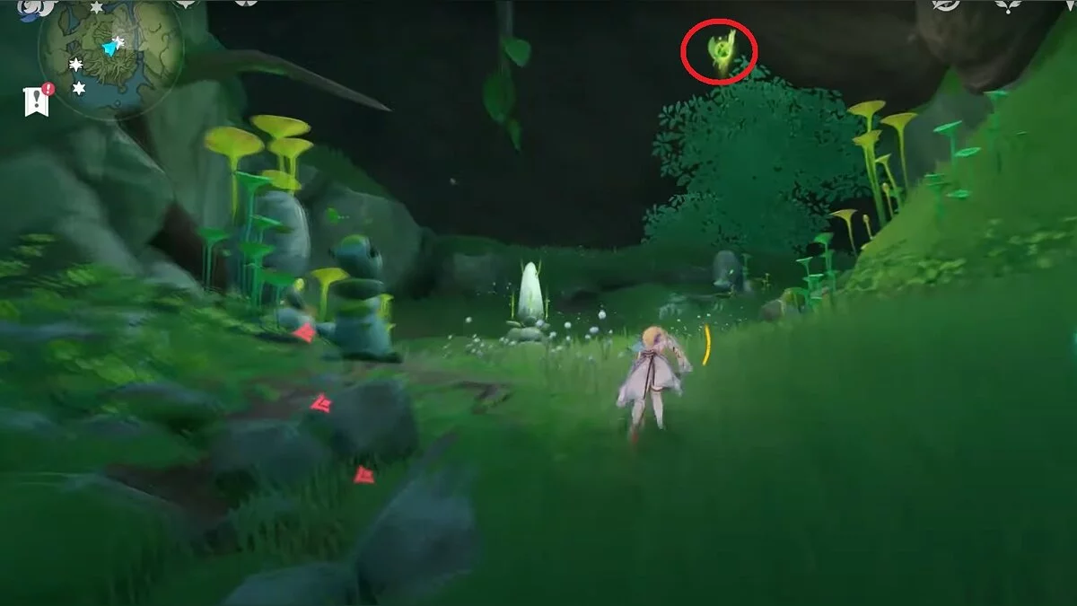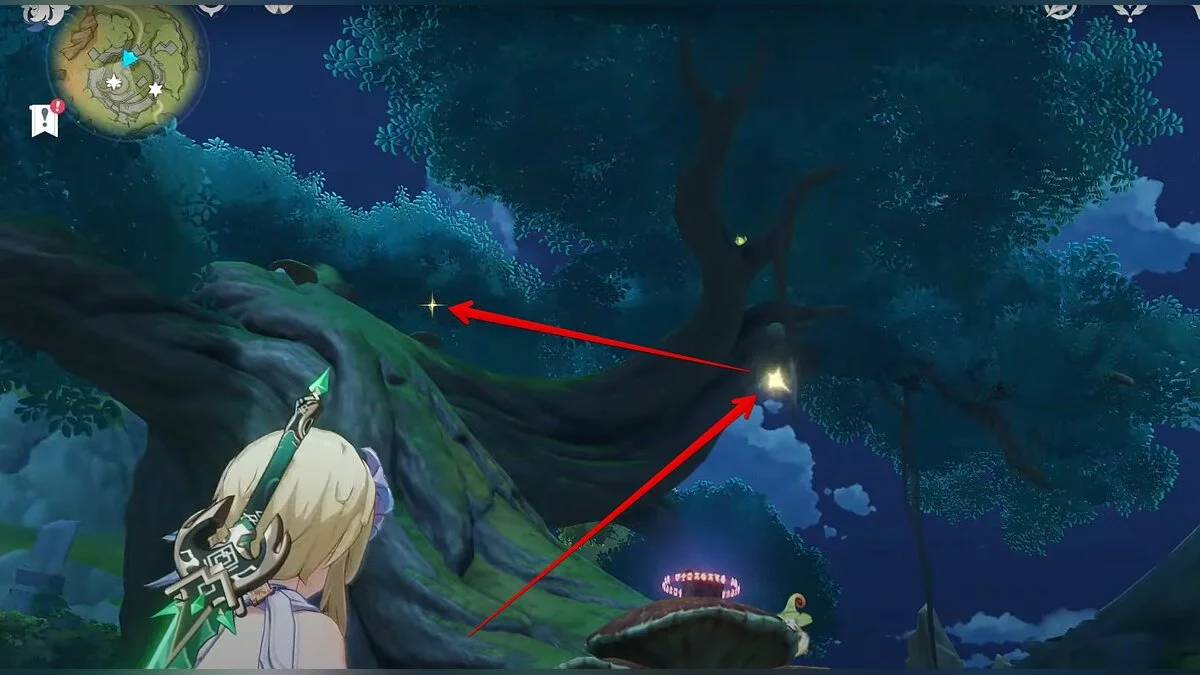 Бегите на запад. Активируйте луковицу и летите вперёд при помощи светлячков. Вы должны добраться до дупла, около которого нужно сыграть на арфе. После того, как вы сделаете это, откроется проход. В центре пещеры стоит каменная глыба, на вершине которой лежит нужный вам ресурс.