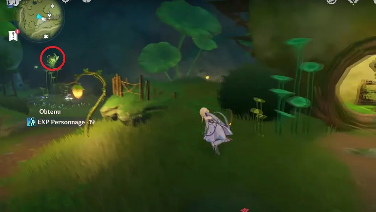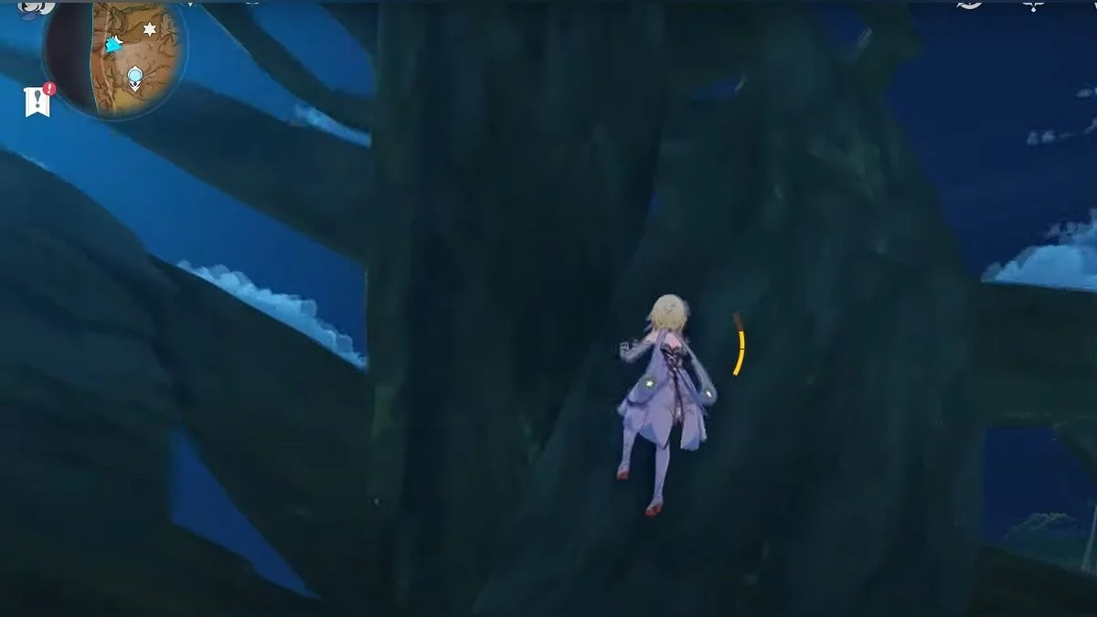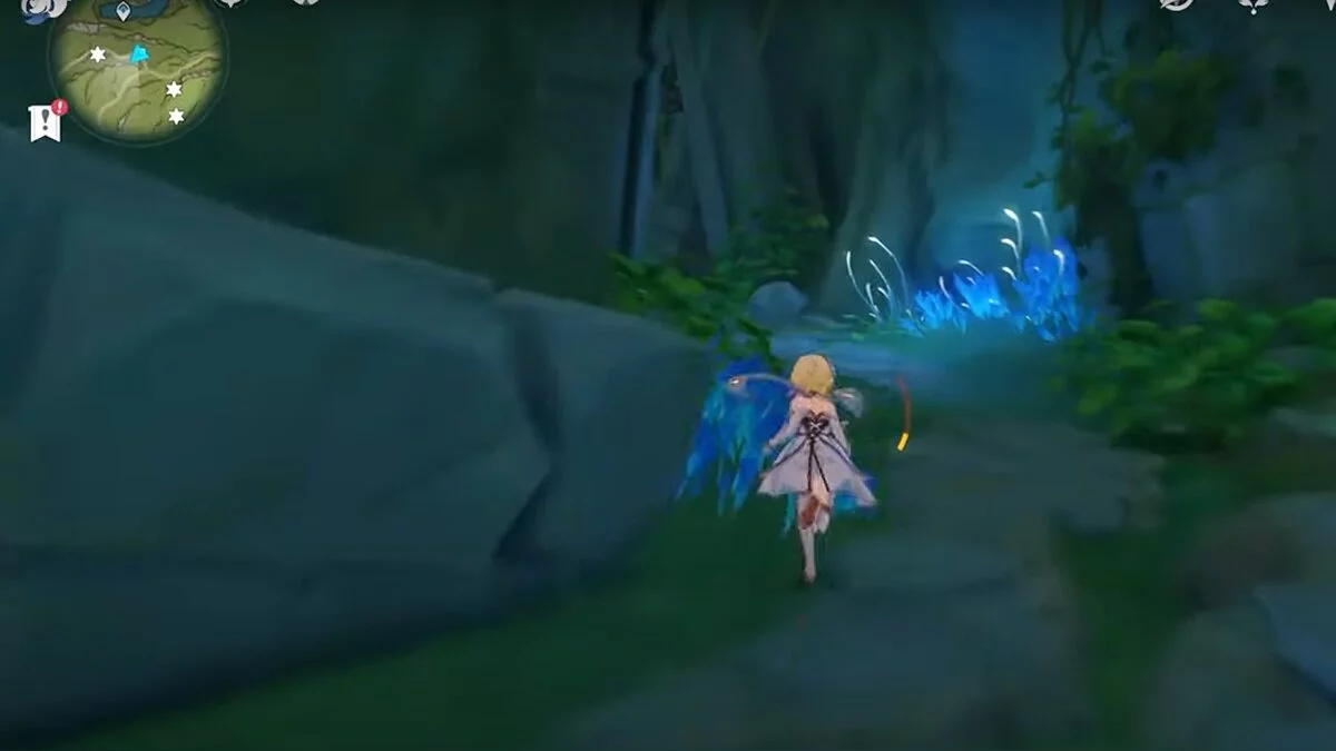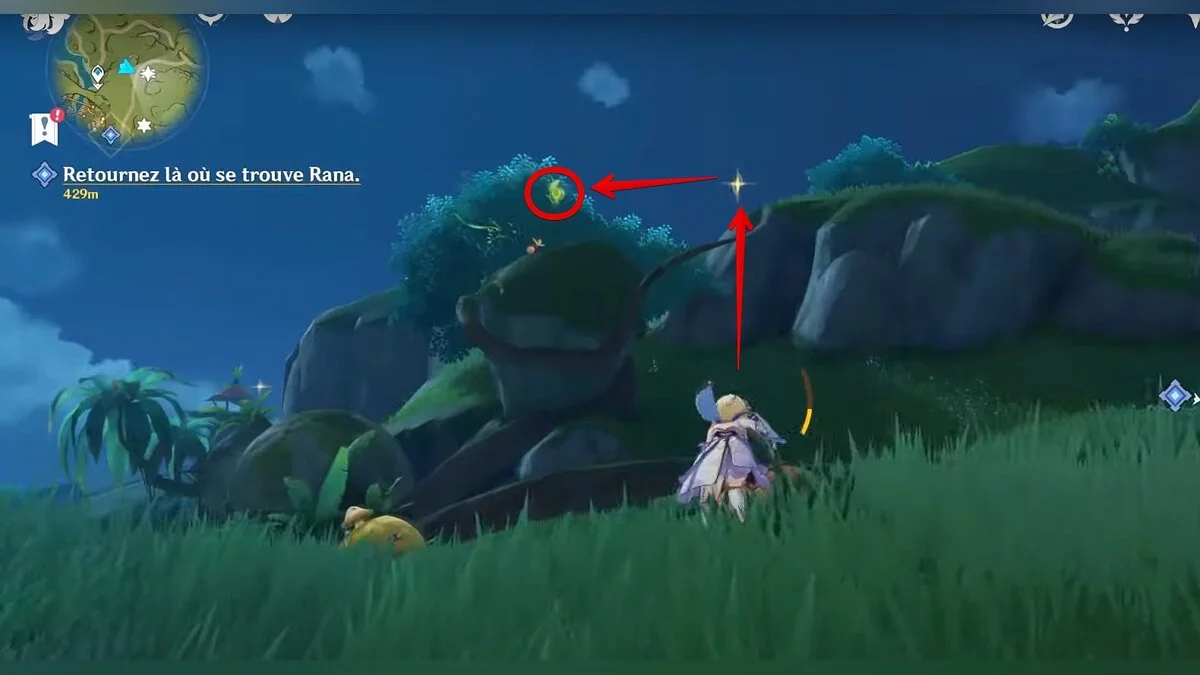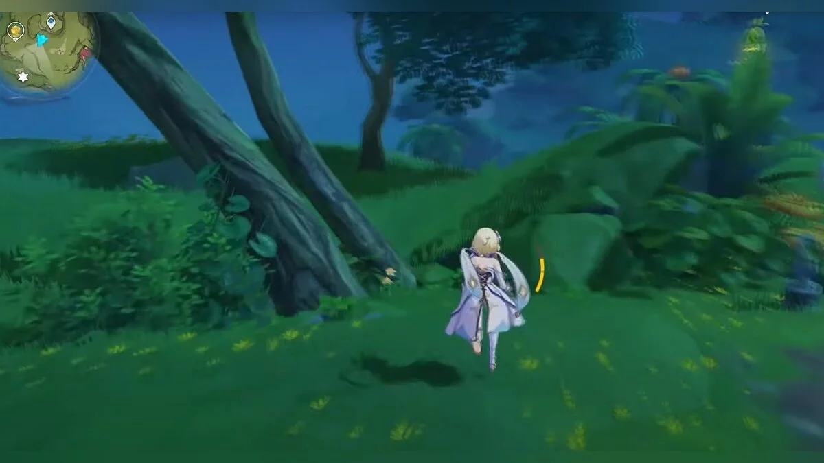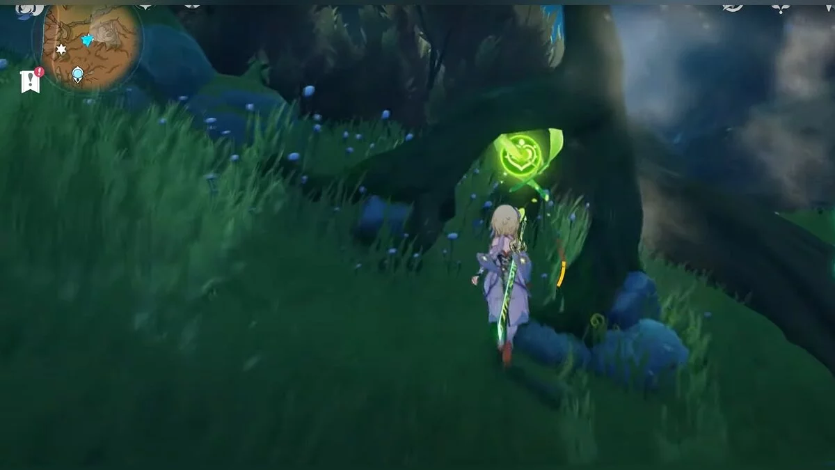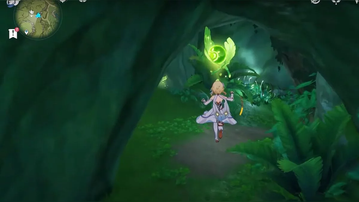 Бегите на запад. Активируйте луковицу и летите вперёд при помощи светлячков. Вы должны добраться до дупла, около которого нужно сыграть на арфе. После того, как вы сделаете это, откроется проход. В центре пещеры стоит каменная глыба, на вершине которой лежит нужный вам ресурс.