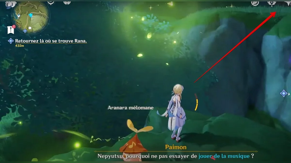 Бегите на юго-запад до обрыва, а затем прыгайте вниз. Чтобы убрать барьер и забрать дендрокул, вам нужно сыграть на лире. Подробнее об этой механике мы рассказали в отдельном гайде.
