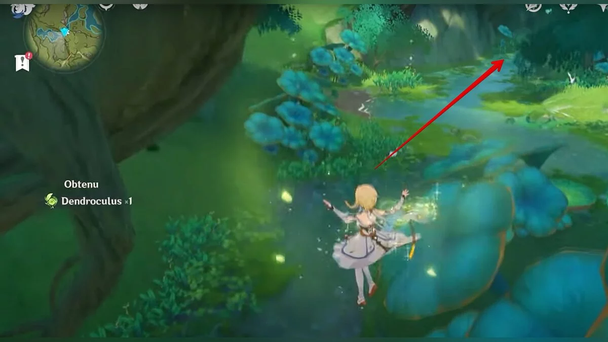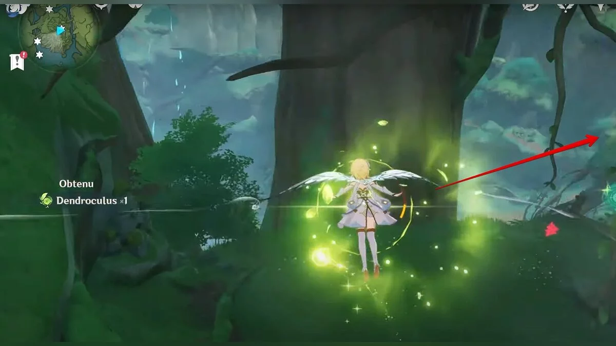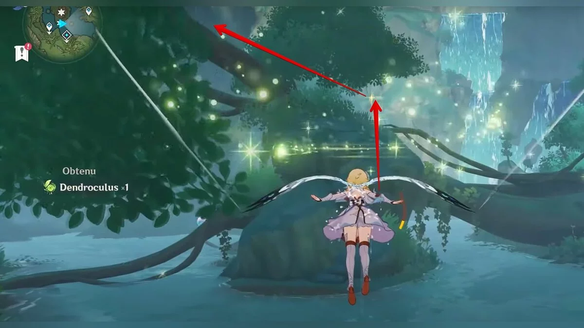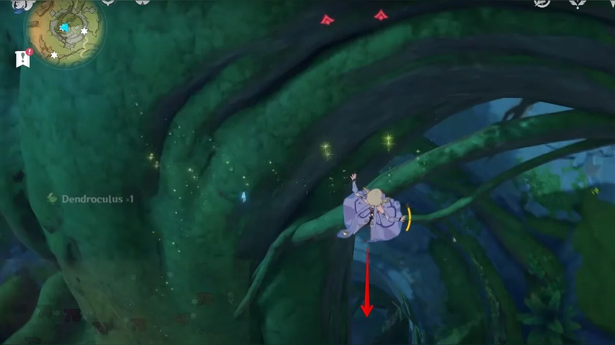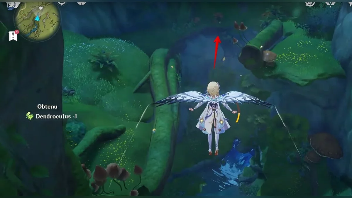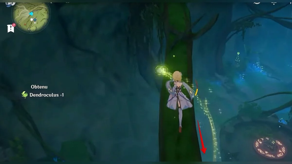 Двигайтесь на восток. Воспользуйтесь светлячком, после чего прыгайте в дыру и скользите вниз. Когда вы окажетесь на берегу подземного озера, бегите к огромному дереву и поднимайтесь наверх по его ветке. Воспользуйтесь трамплином, чтобы забраться ещё выше. Развернитесь и вы увидите дендрокул.