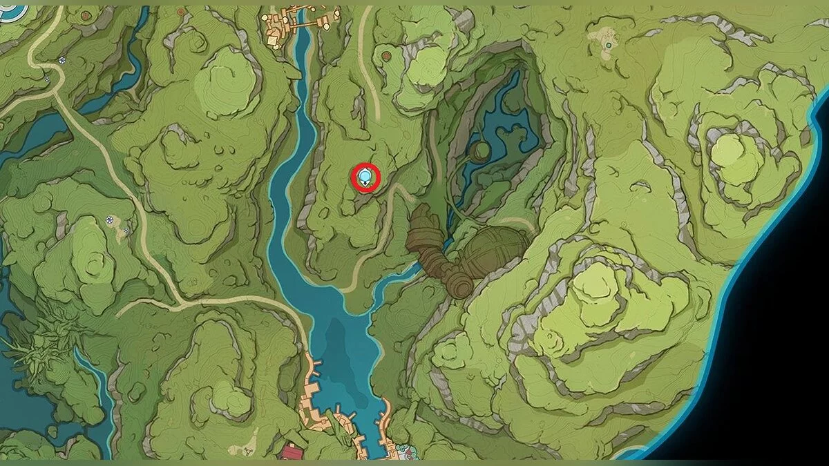 24-й дендрокул. Он находится в этой же пещере. Развернитесь на запад и прыгайте вниз, в русло мелкой реки. Подберите дендрограмму и воспользуйтесь грибом-трамплином, чтобы забраться на уступ. Бейте дендро-стихией по трём зелёным кольцам, чтобы убрать барьер. После этого вы сможете забрать дендрокул.