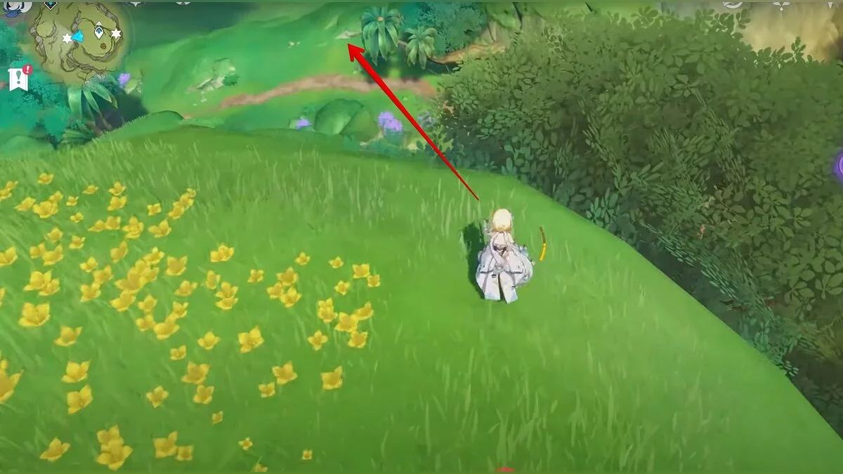 Двигайтесь на юго-запад. Около вражеского лагеря взаимодействуйте с красным цветком. Когда вылетит дендрокул, воспользуйтесь трамплином, чтобы допрыгнуть до него.
