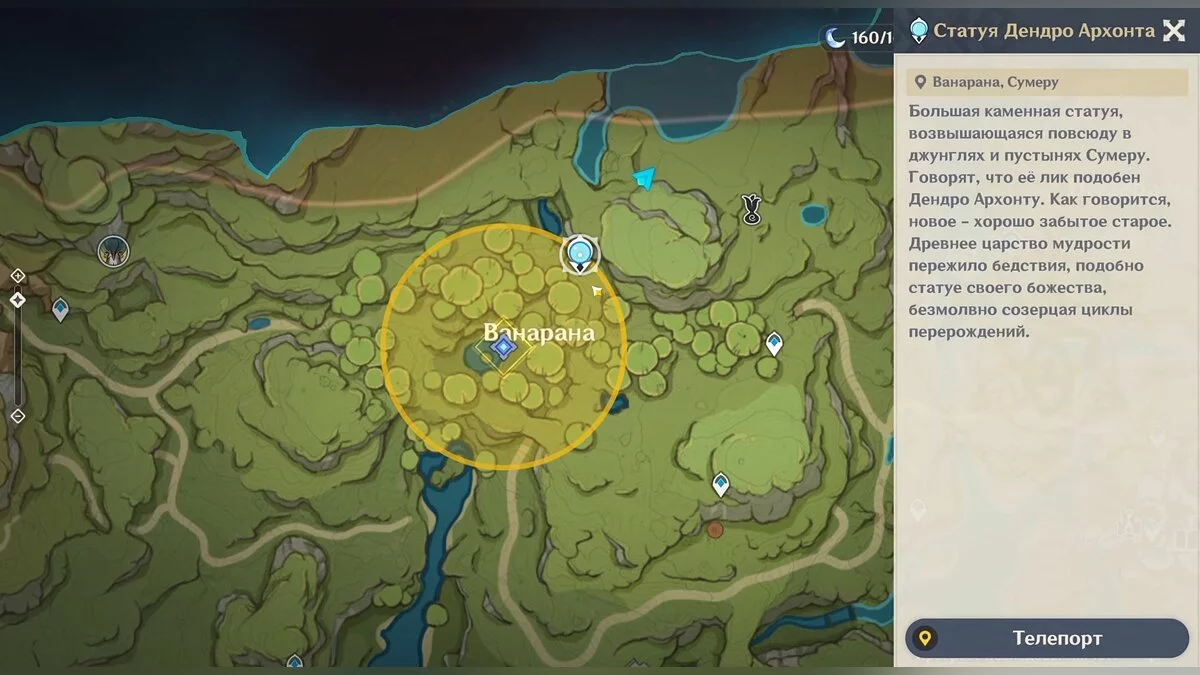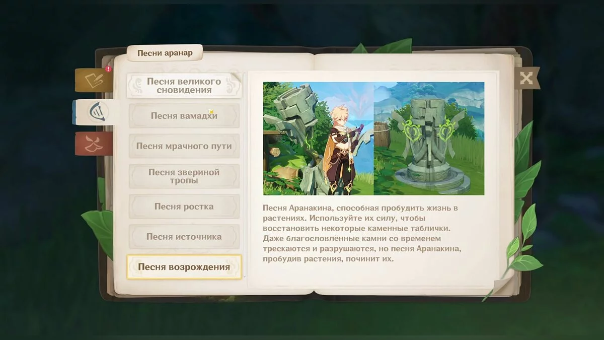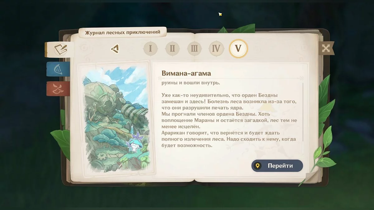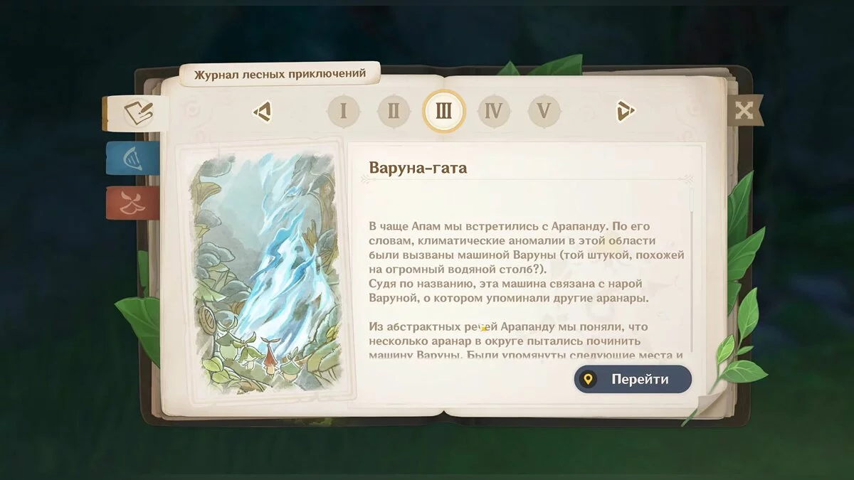 За выполнение каждого тома игрок будет получать «Истории о путешественнице и аранарах». После сбора всех пяти предметов отправляемся к статуе Дендро Архонта «Ванарана, Сумеру». Обязательно предварительно переместитесь в параллельный мир. Для этого необходимо сыграть на старинной лире.