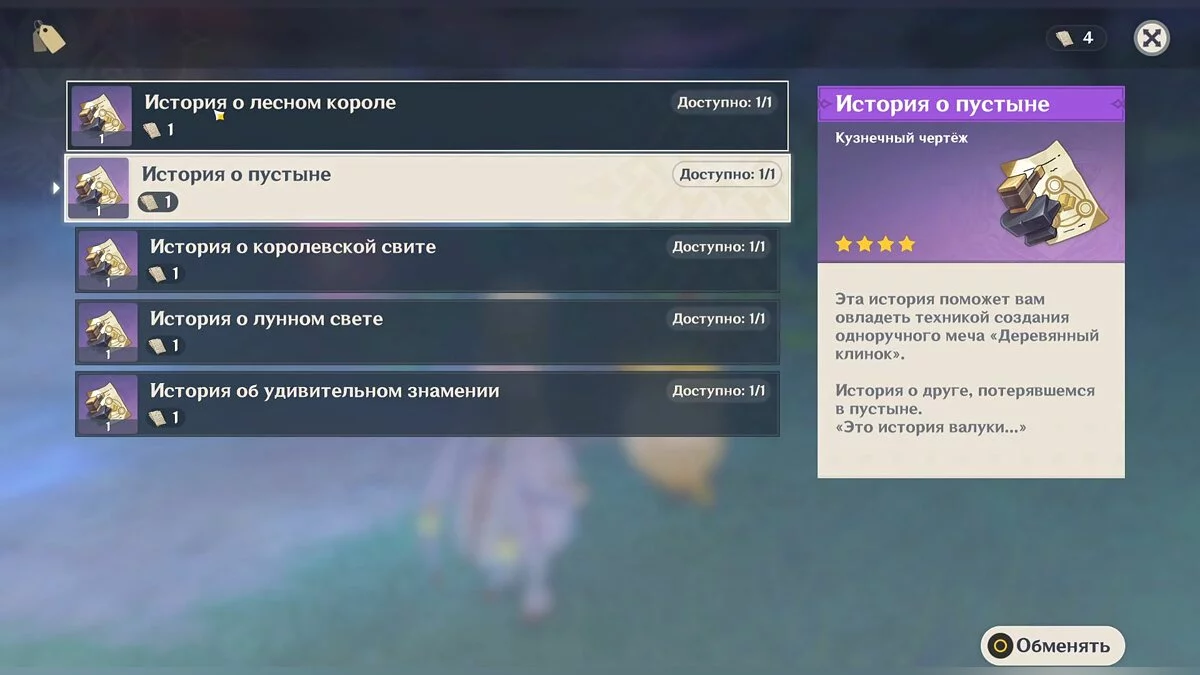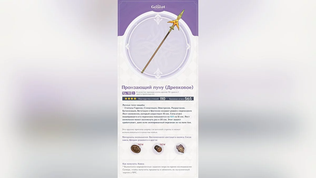 Для производства каждого вооружения потребуются заготовки оружия Сумеру (1 единица), обломок кристалла (50 единиц) и обломок белого железа (50 единиц). Проблем с поиском этих ресурсов не возникнет. Заготовки открываются при повышении благосклонности Ванараны каждые десять уровней, начиная с 4 (14, 24, 34 и далее).