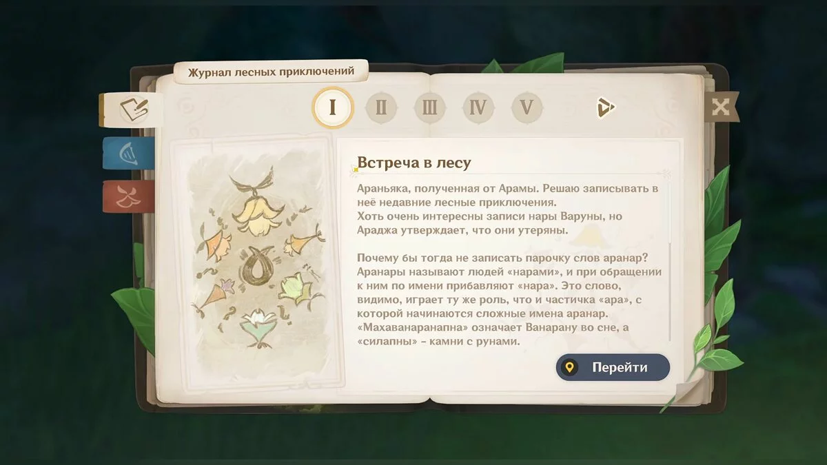 После перехода к новому региону игроку необходимо от первой локации со статуей архонта добраться до телепорта «Лес Авидья, Сумеру». Немного южнее герой встретится с Раной. Выполняем её задание и получаем книгу «Араньяка». С этого момента игроку необходимо выполнить простые квесты из пяти томов книги: